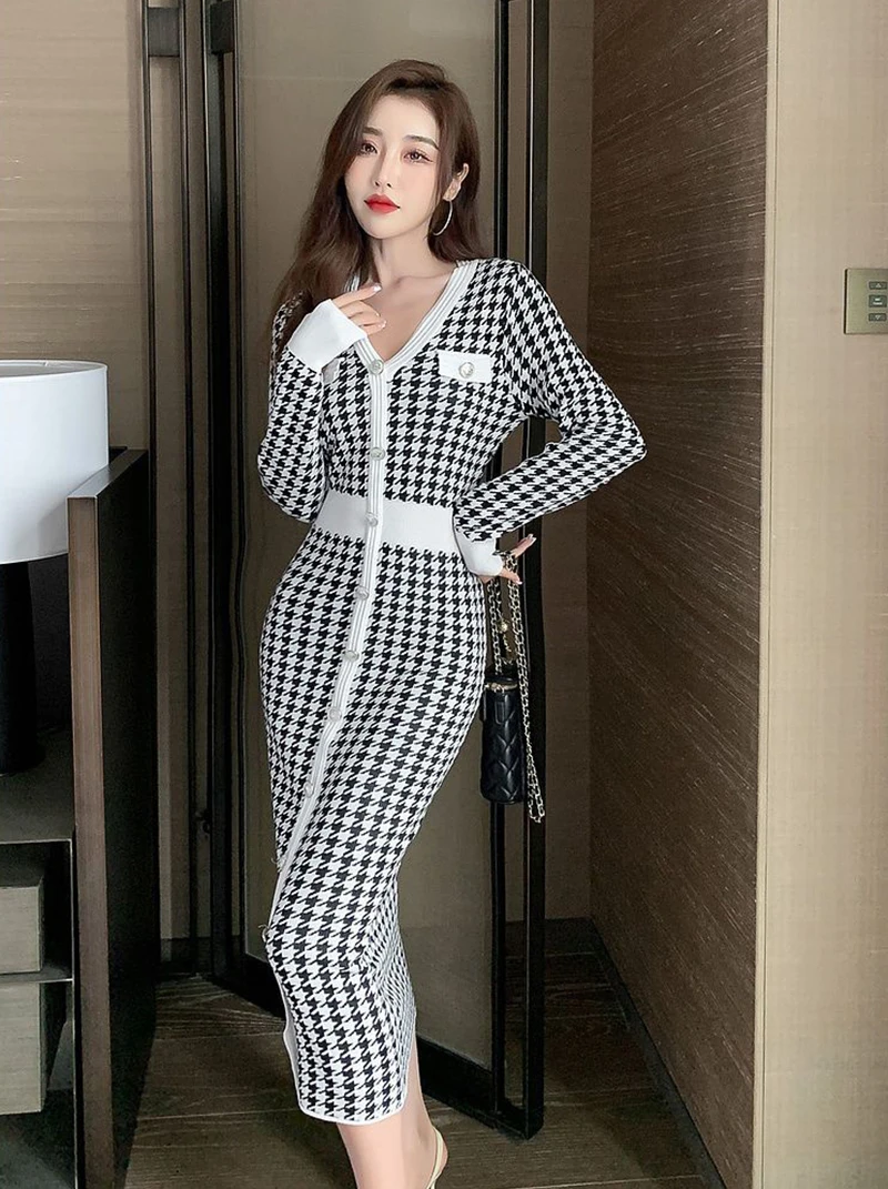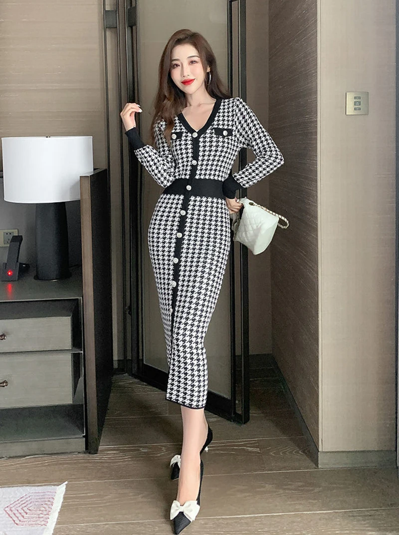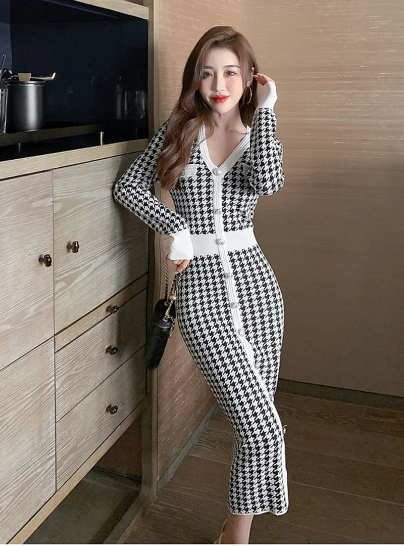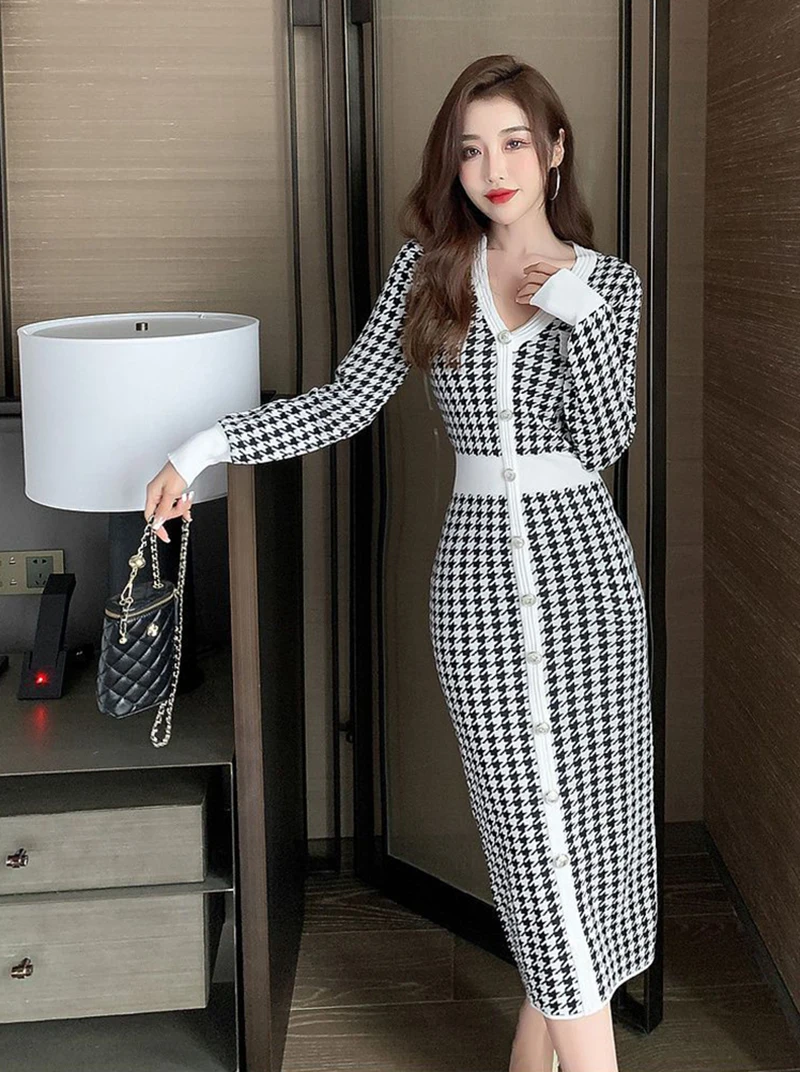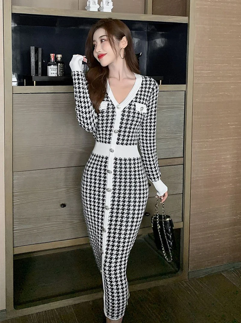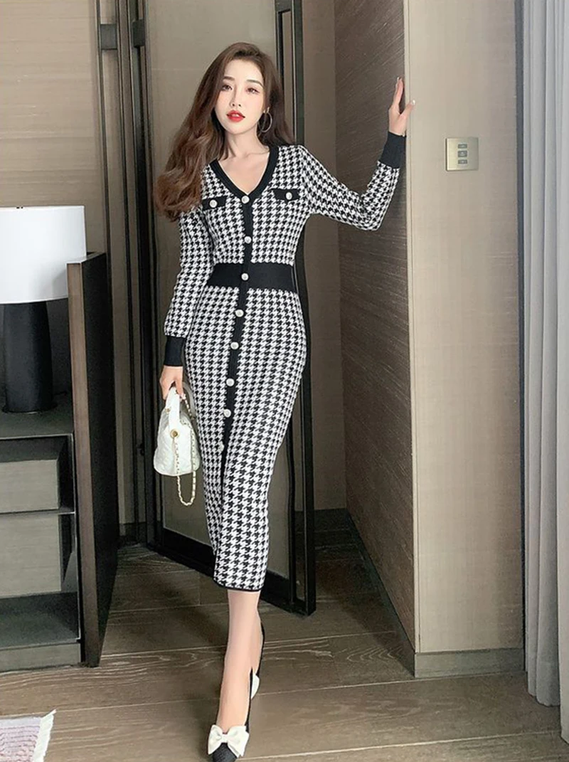 Znbbw Plaid Knitted Midi Dress Women Bird Lattice Sweater A Line Dresses Korean Elegant V Neck Patchwork Bodycon Vestidos New