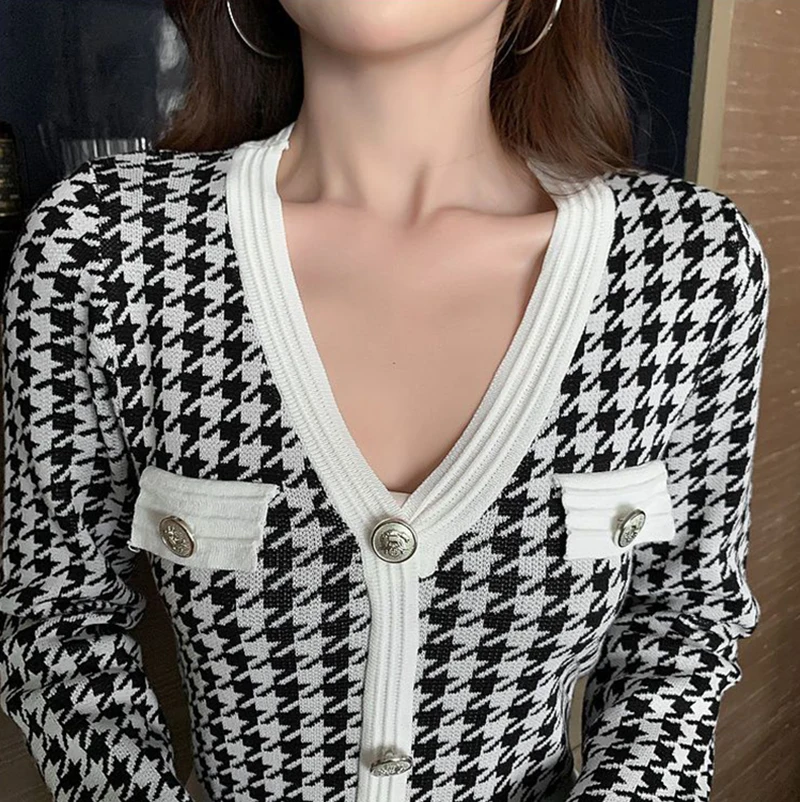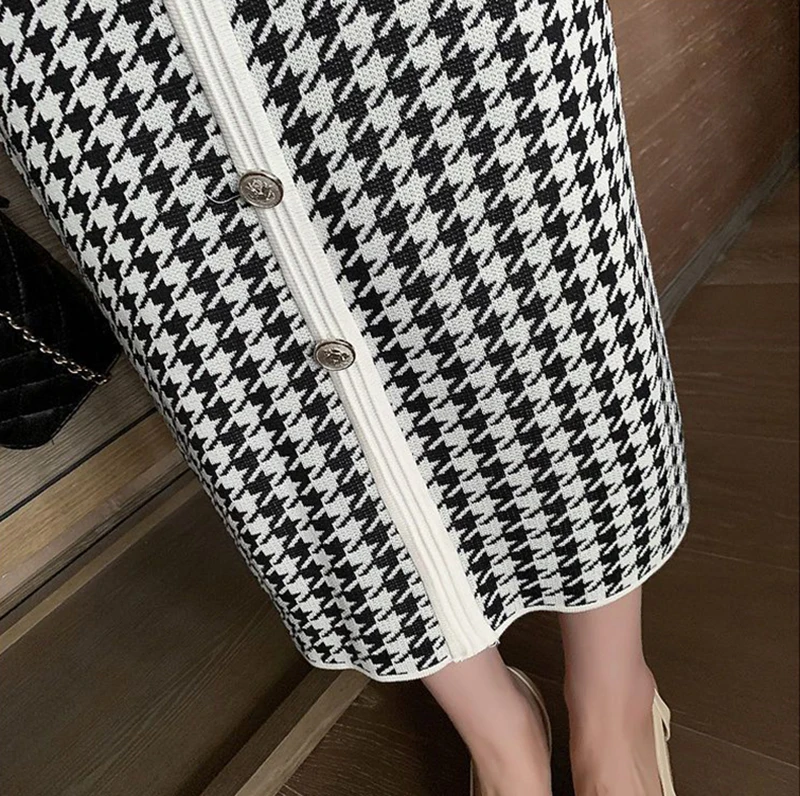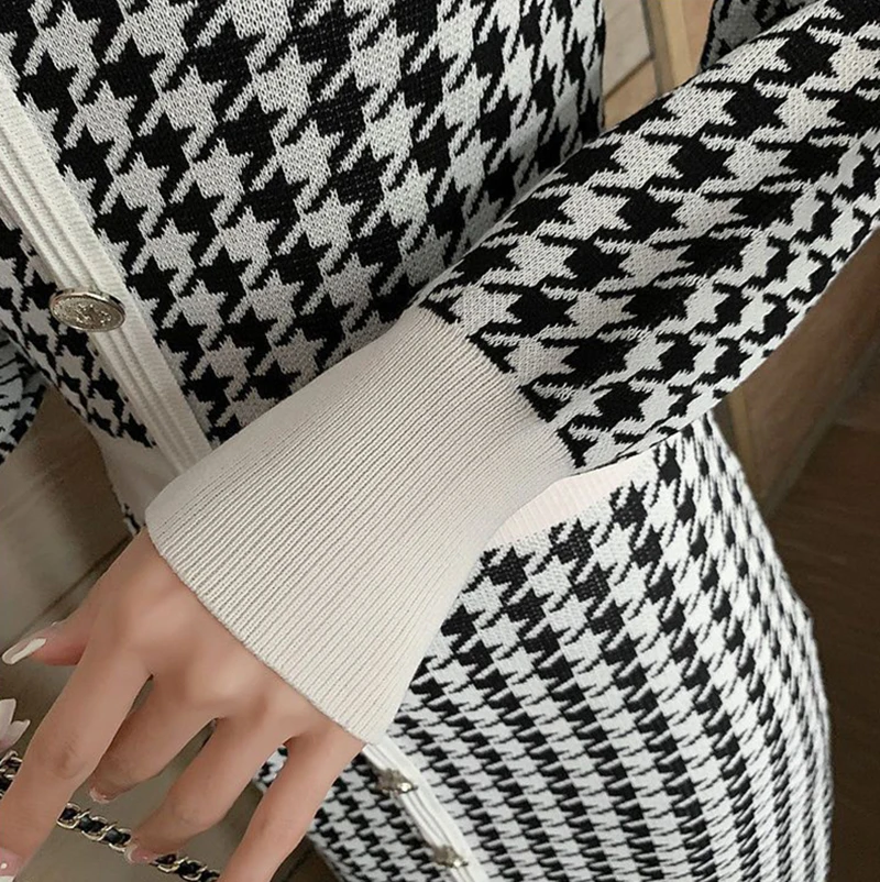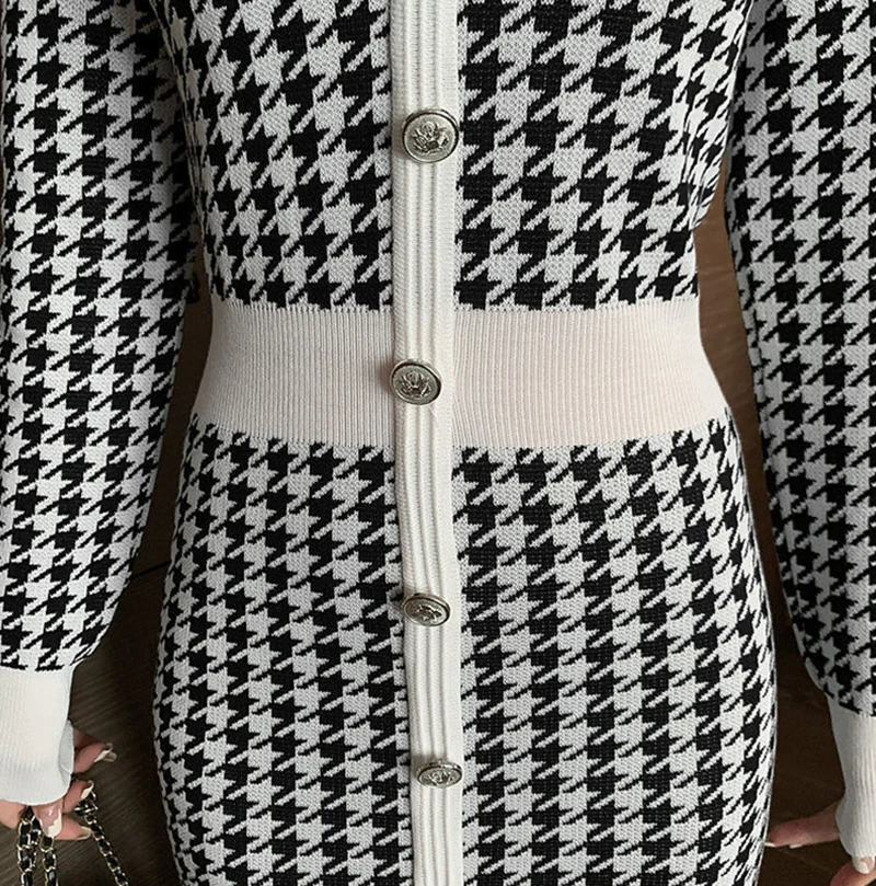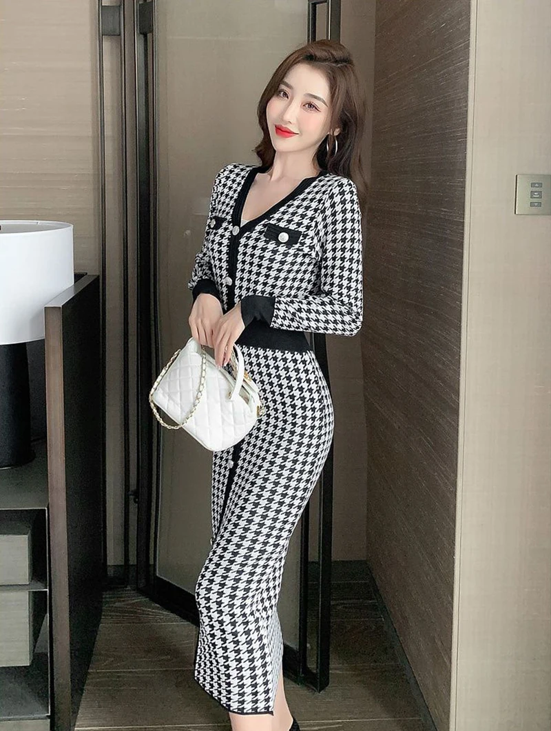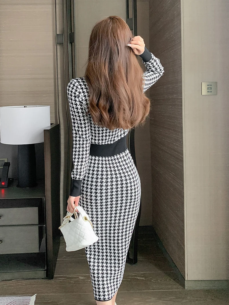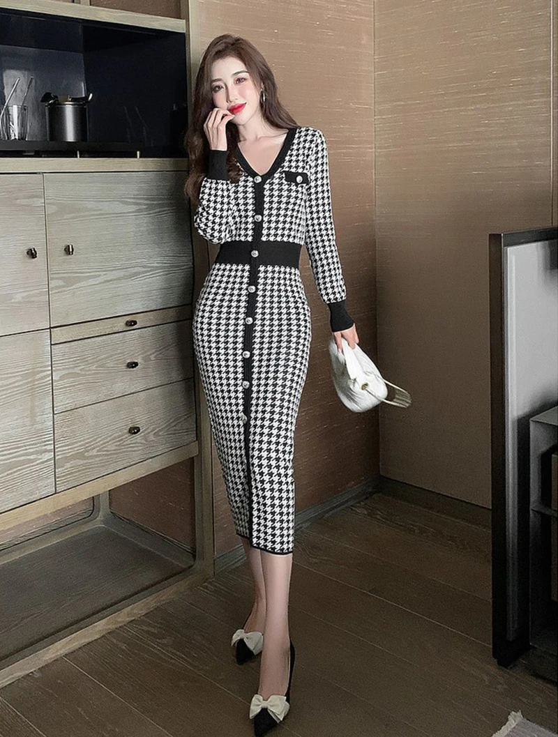 Znbbw Plaid Knitted Midi Dress Women Bird Lattice Sweater A Line Dresses Korean Elegant V Neck Patchwork Bodycon Vestidos New