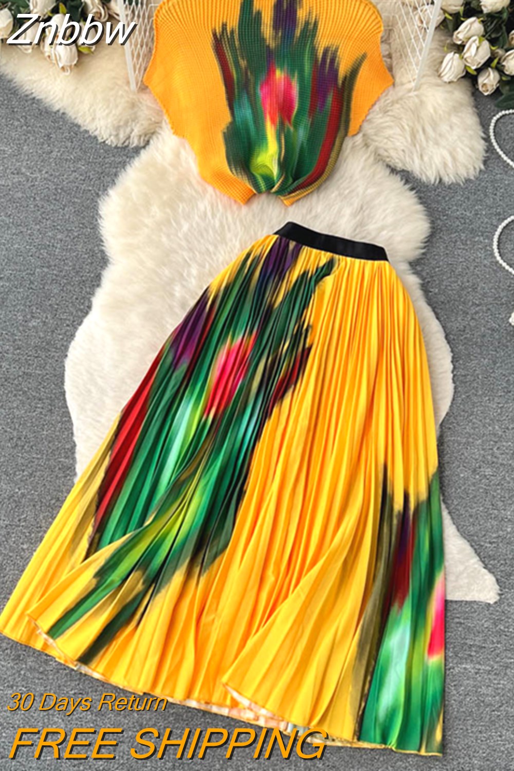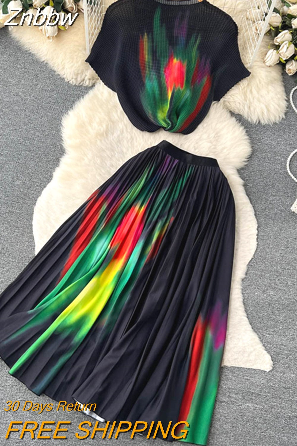 Znbbw Pleated Skirt Suit Vintage Print Stretchy Pullover Tops and Skirt Casual Party Two Piece Set Women Streetwear Outfits