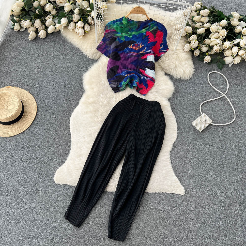 Znbbw Pleated Two Piece Set Summer Fashion Turtleneck Vintage Print Stretchy Casual Top and Pencil Pants Suit Women Clothes