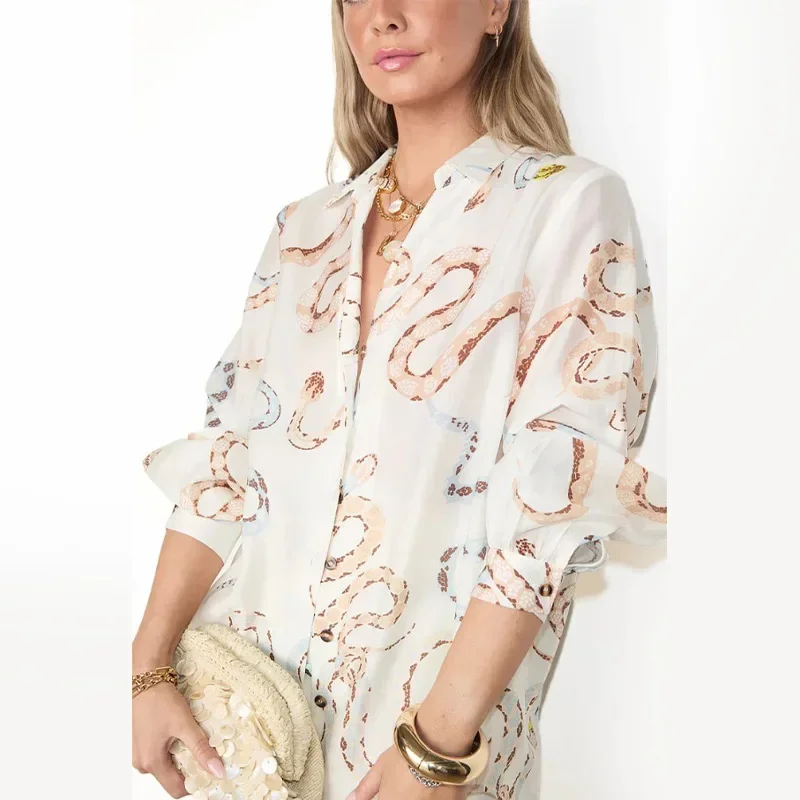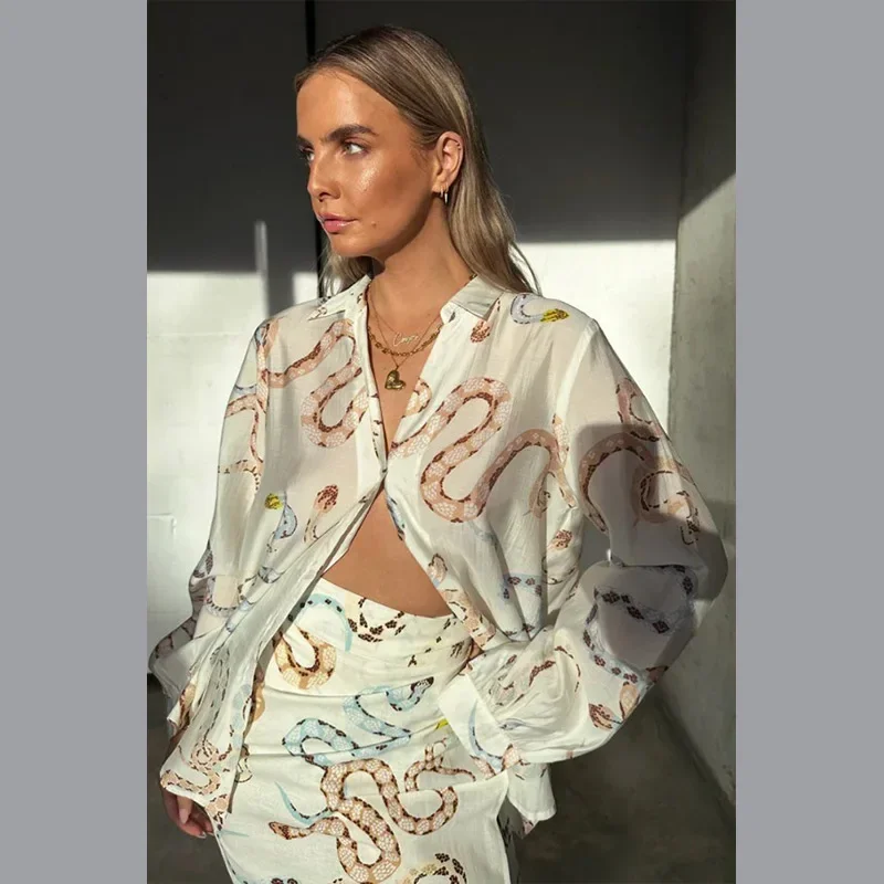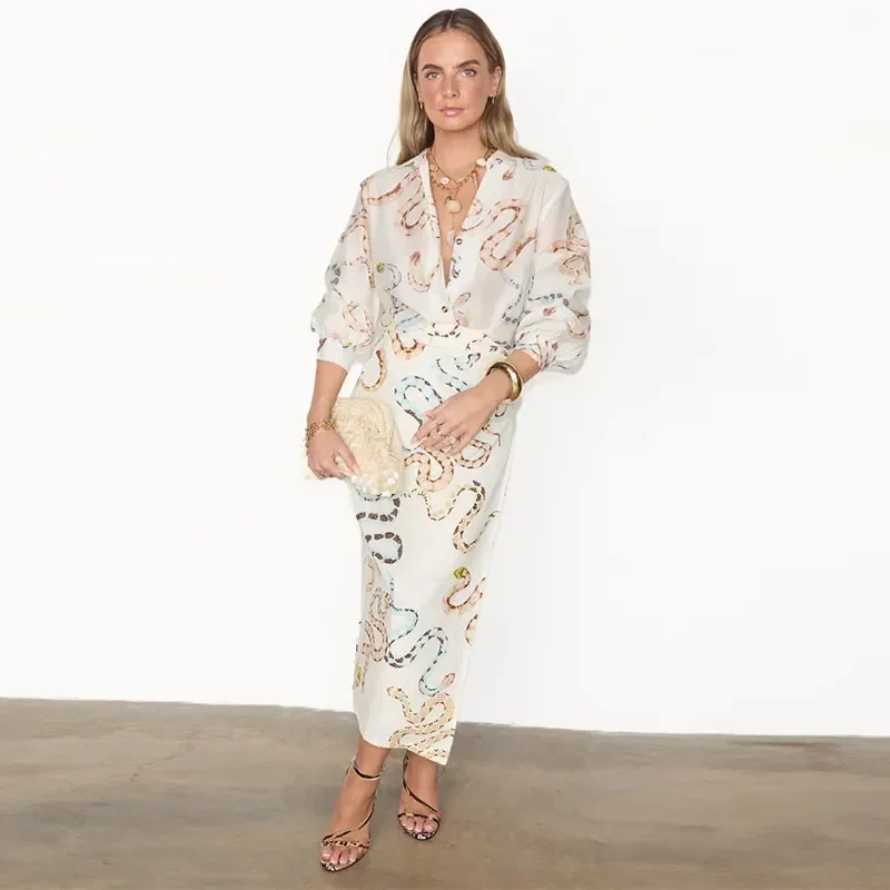 Znbbw Print Long Sleeve Shirt Split Skirt Set Women Single Breasted Lapel Shirts Pleated Skirts Set 2024 Casual Chic Female Suit