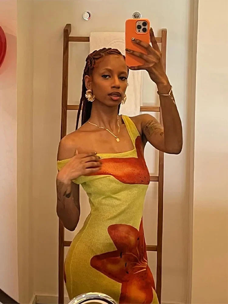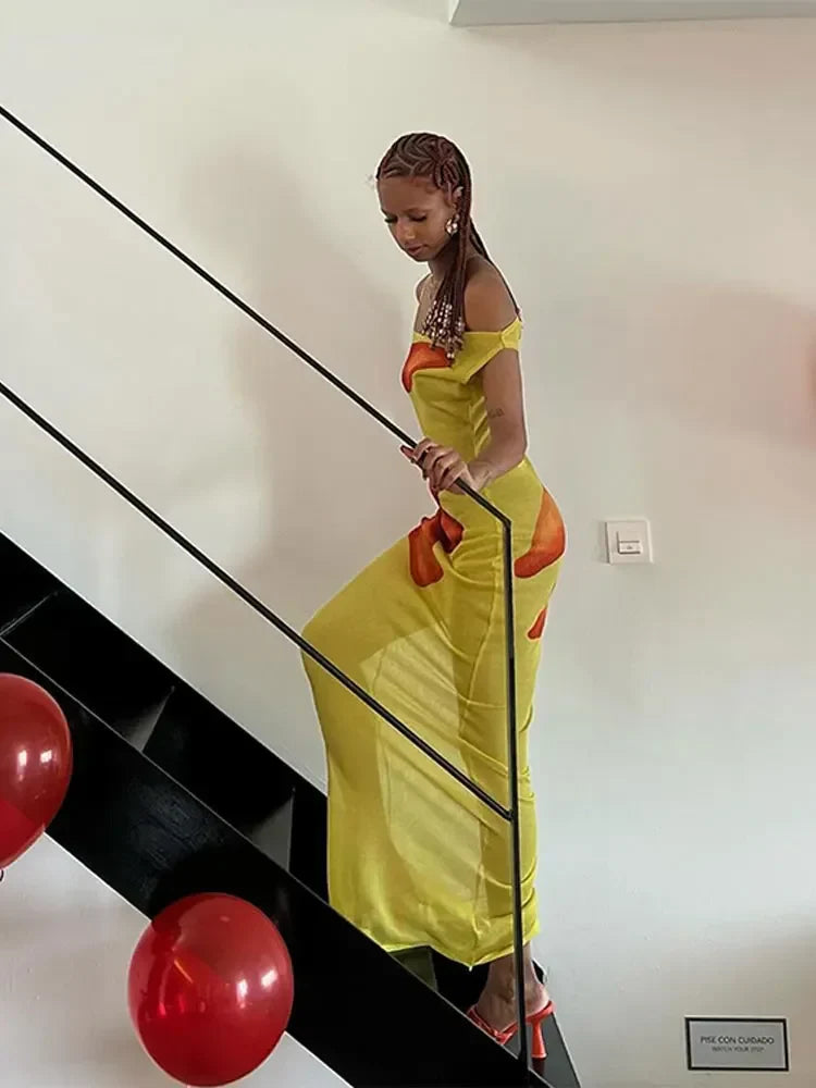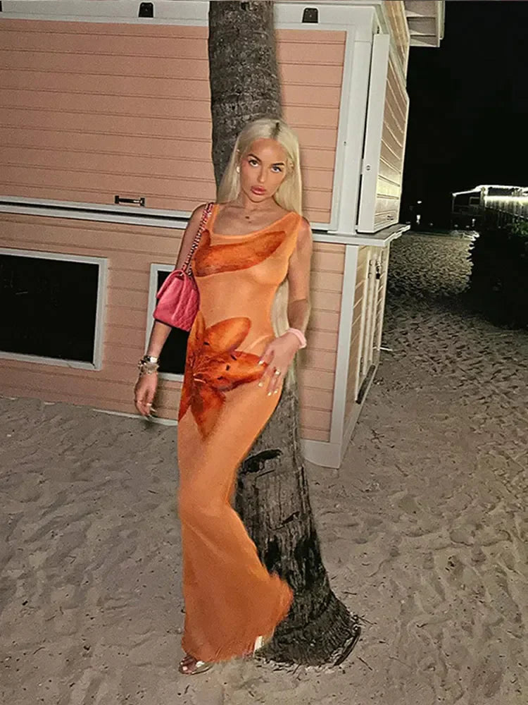 Znbbw Printed See Through Sleeveless Dress Women Fashion Diagonal Collar Long Robes 2024 Summer Female Beach Holiday Dresses