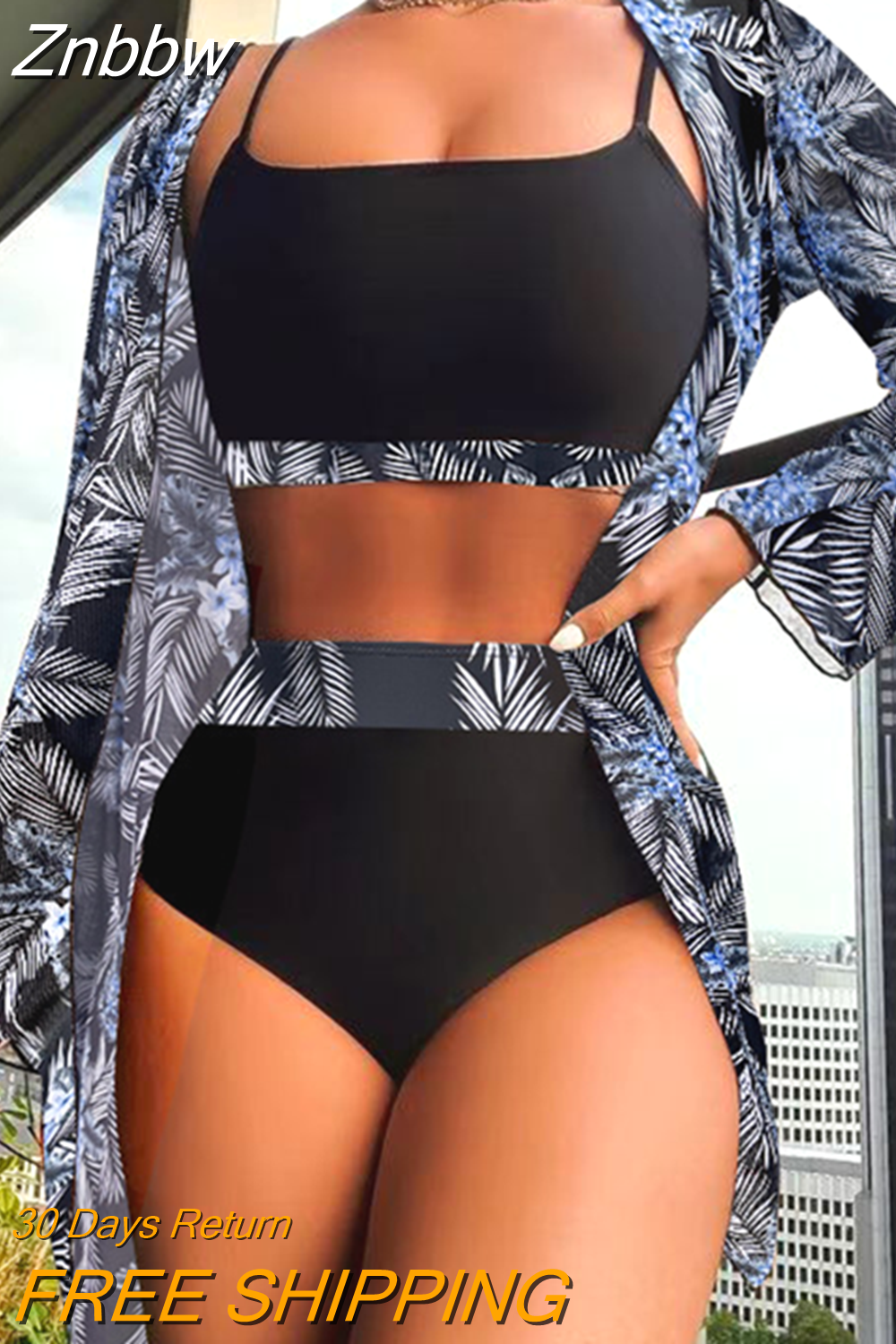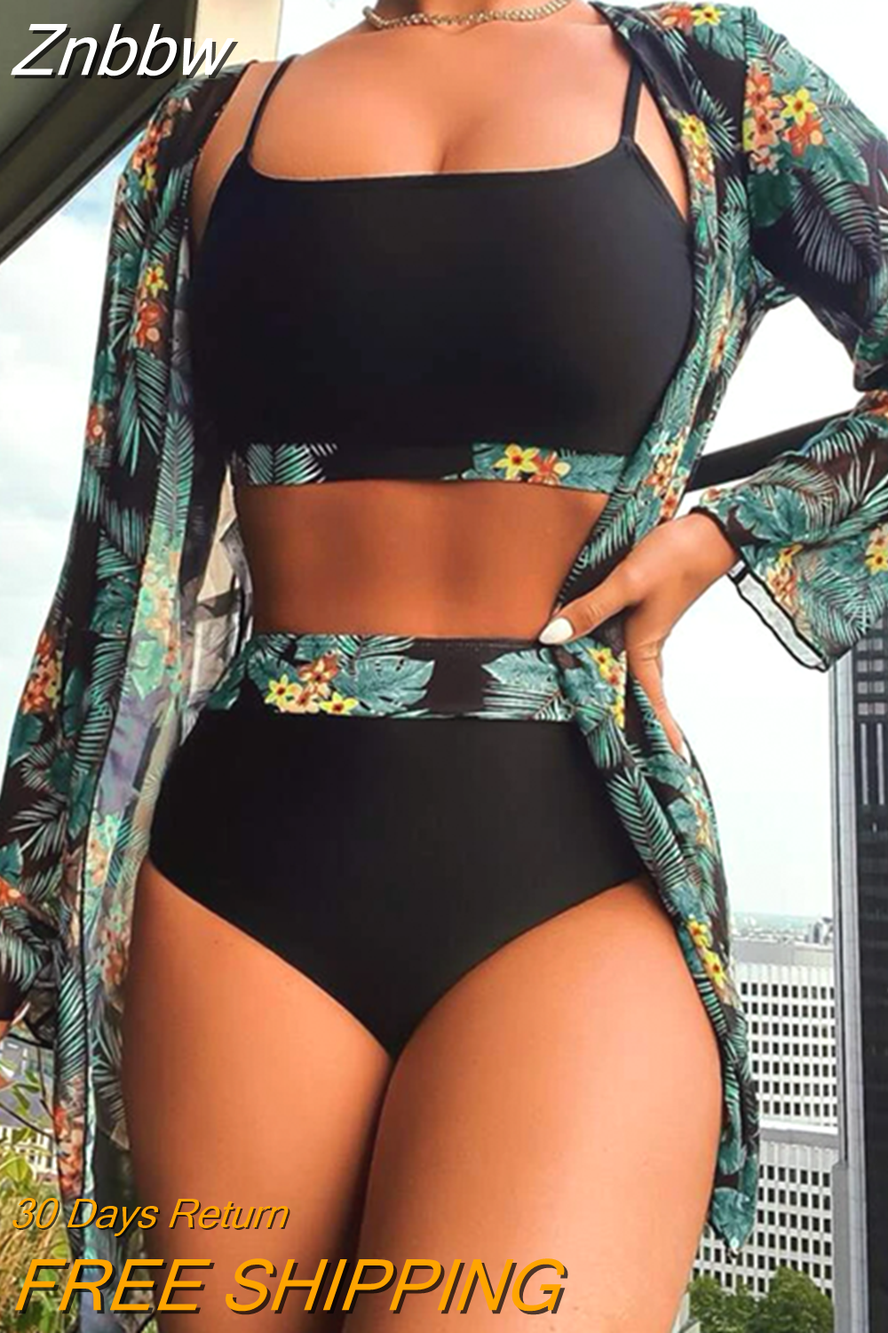 Znbbw Printed Tropical Flower Bikini Swimwear Sets Women High Waist 3 Peice Sets 2023 Fashion Sexy Summer Beach Bathing Suits