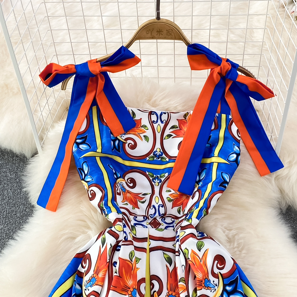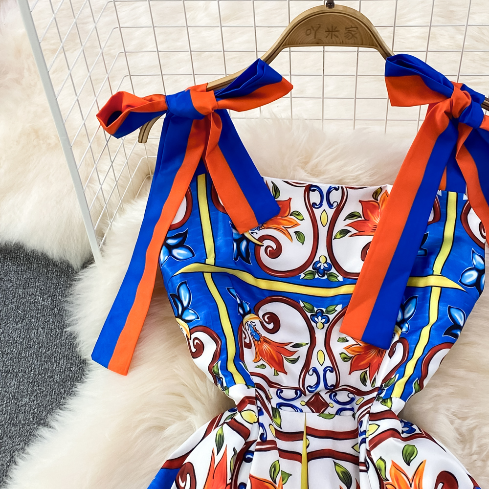 Znbbw Runway Summer Bow Tank Dress 2023 New Women's Spaghetti Strap Backless Palace Floral Print Holiday Beach Dress N66878