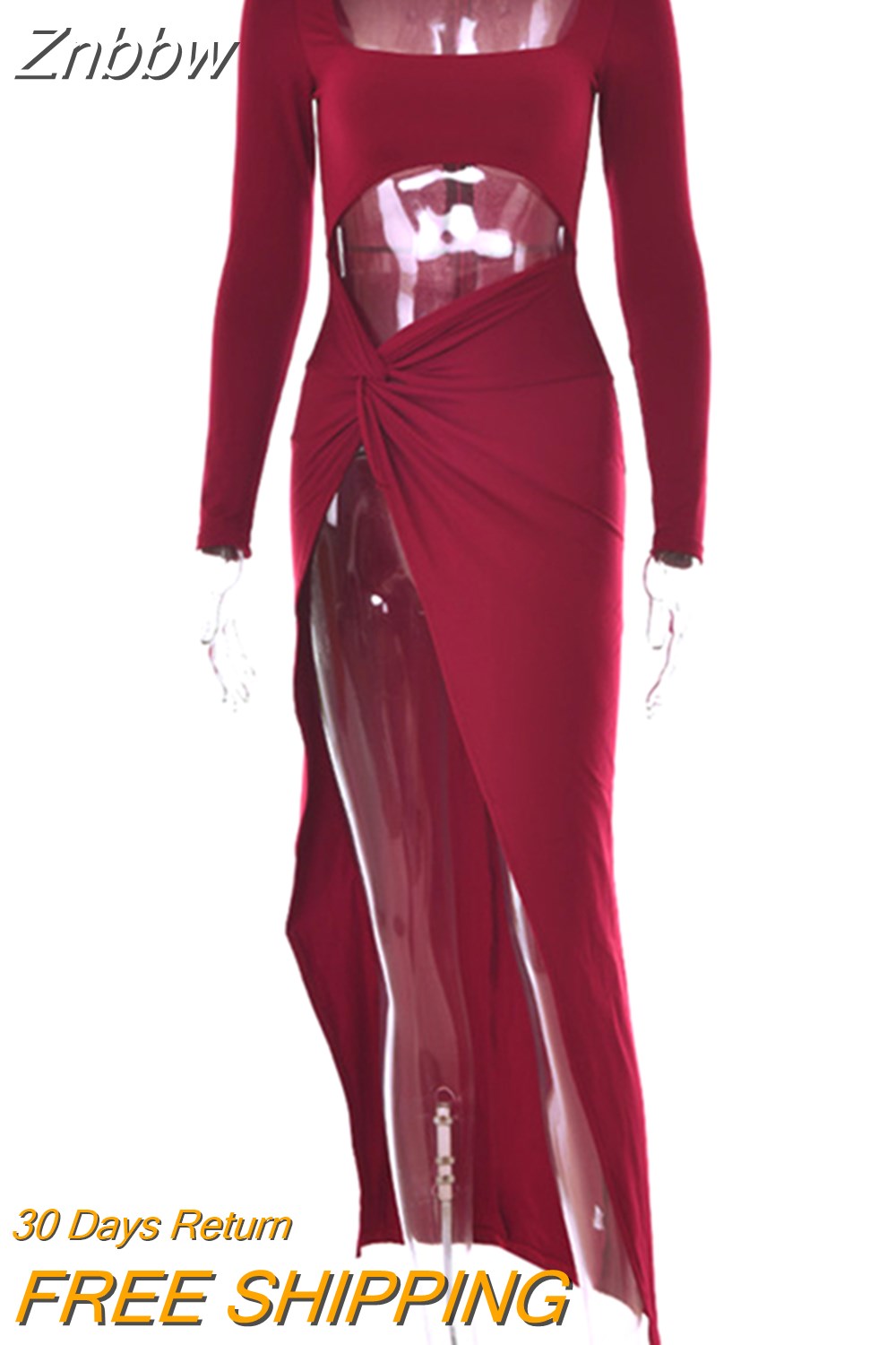 Znbbw Sexy Hollow Out High Split Maxi Dress For Women Robe 2023 Autumn Full Sleeve Ruched Club Party Long Dress Vestido