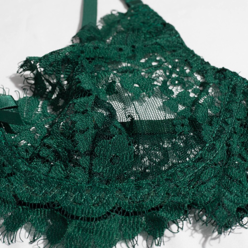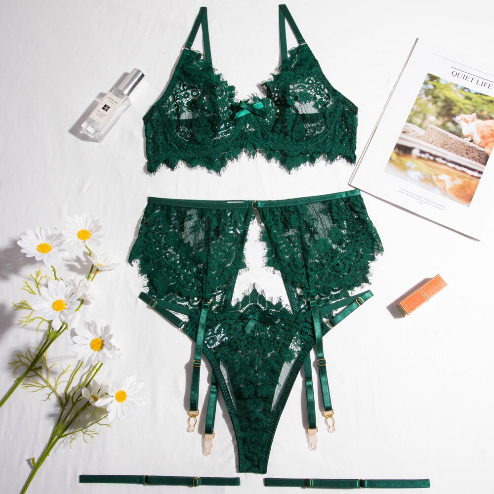 Znbbw Sexy Kant Lingerie Jager Groen Vrouwelijke Ondergoed See Through Set Vrouw 3 Stuks Naadloze Beha En Panty Garters Intieme