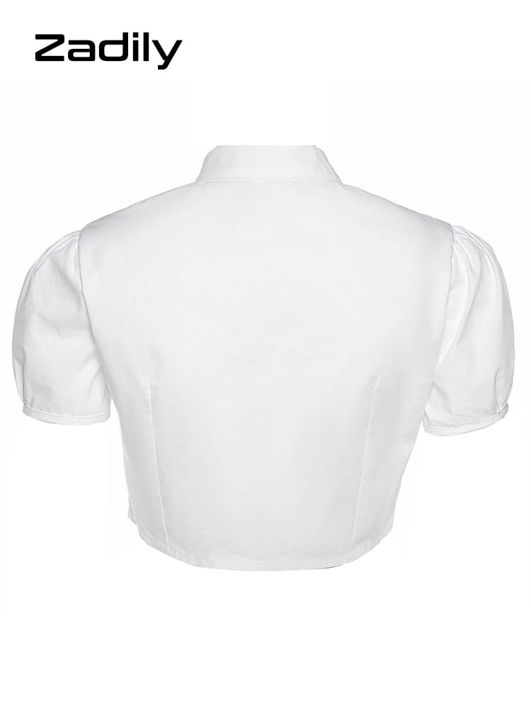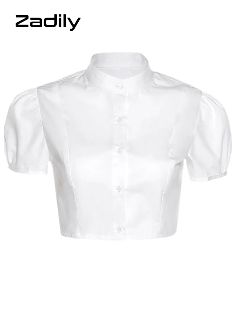 znbbw Sexy White Shirt Women Stand Neck Button Short Sleeve Slim Crop Blouse 2023 Summer New Party Y2k Female Clothing Tops