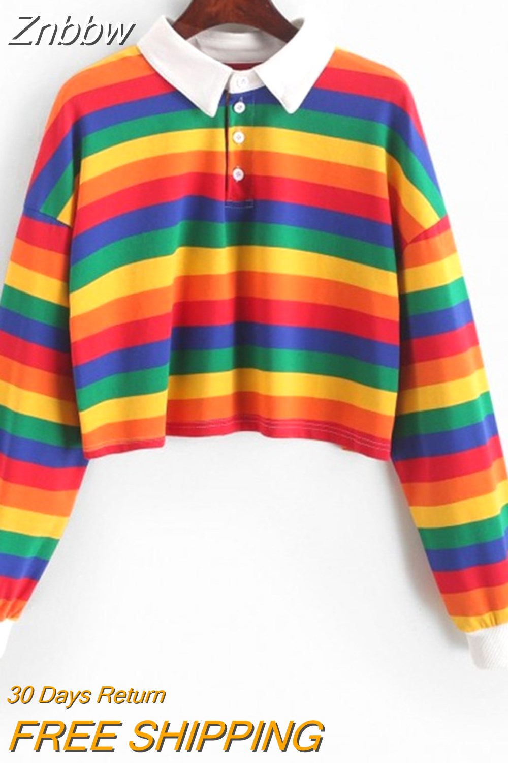 Znbbw Shirt Women Sweatshirt Long Sleeve Rainbow Color Ladies Hoodies With Button Striped Korean Style Sweatshirt Women