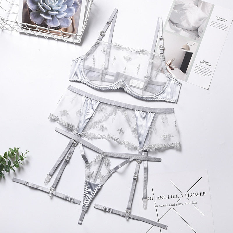 Znbbw Short Skin Care Kits Sensual Lingerie Sliver Embroidery Bra Lace Sexy Set Woman 2 Pieces with Garters Erotic Underwear