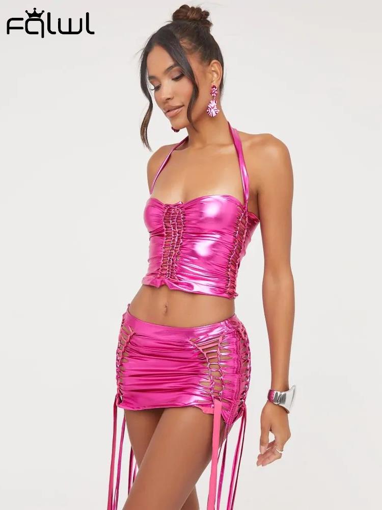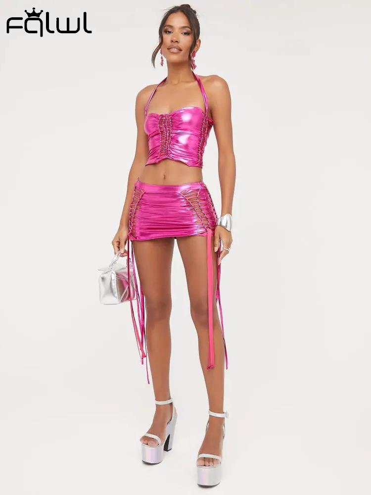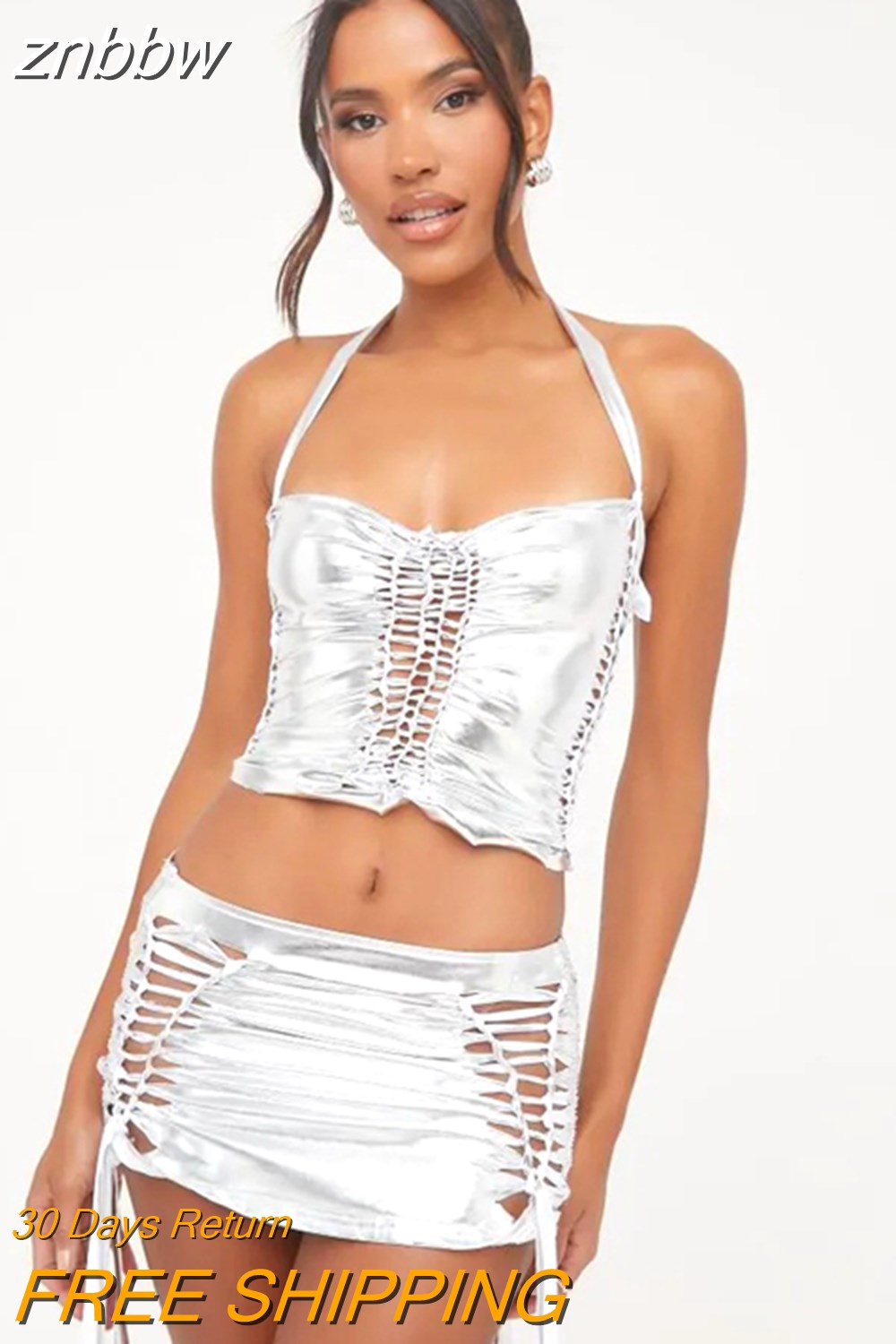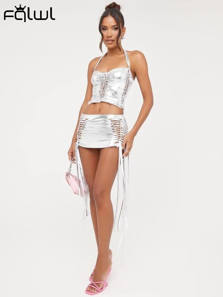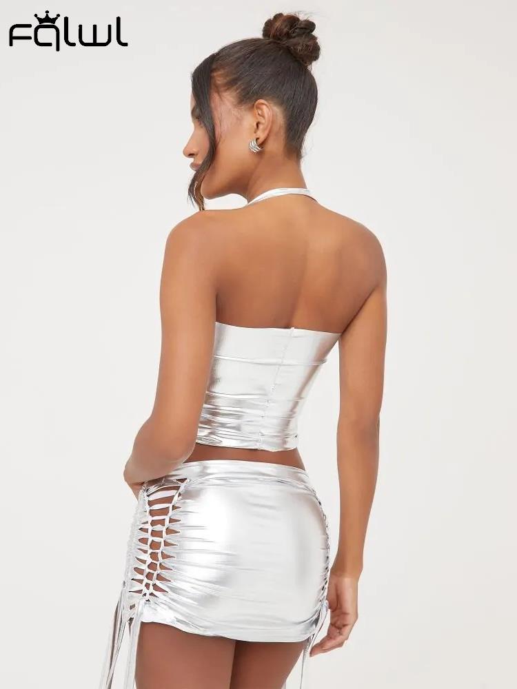 znbbw Silver Halter Drawstring 2 Two Piece Sets Summer Outfits For Women 2023 Sexy Hellow Out Mini Skirts Sets Backless Sets