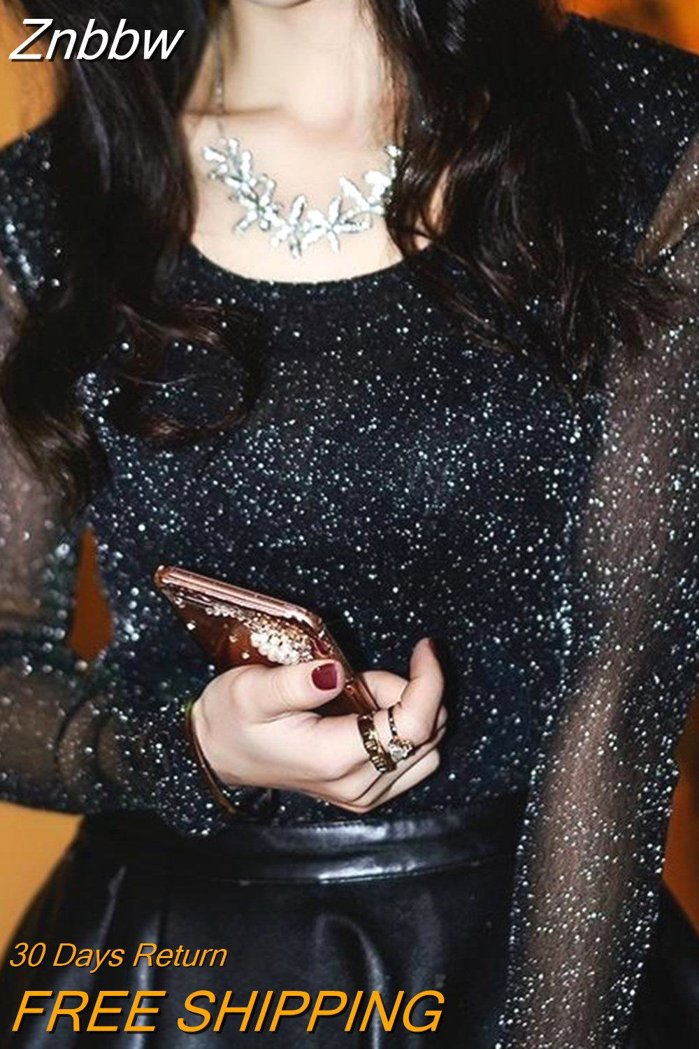 Znbbw Spring Summer Women's Sexy See Through Mesh Blouse Long Sleeve Transparent Shining Elegant Shirt Fashion Women Tops