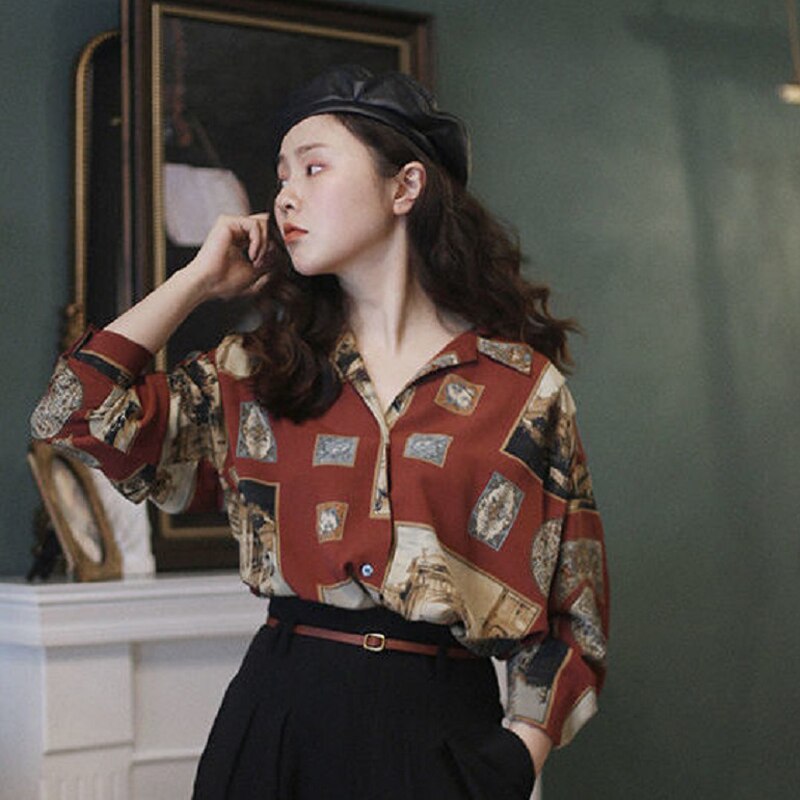 znbbw Spring Vintage Print Oversize Women's Shirt Red Blouse Long Sleeve Ladies Tops Plus Size Button Up Fashion Female Clothing