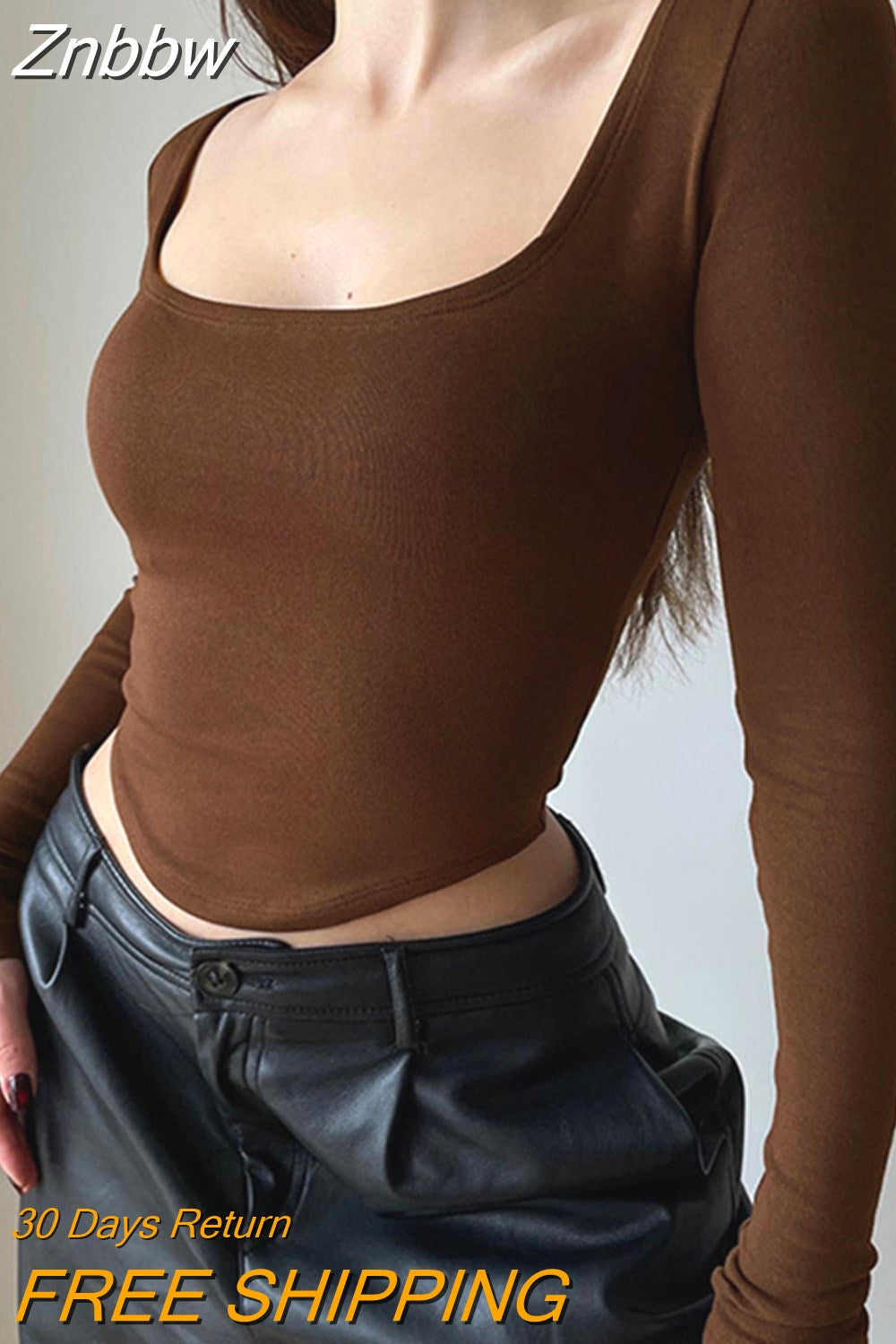 Znbbw Square Neck Solid Color Long Sleeve Crop Top 2023 New Autumn Clothes for Women Curved Hem Slim T-Shirts