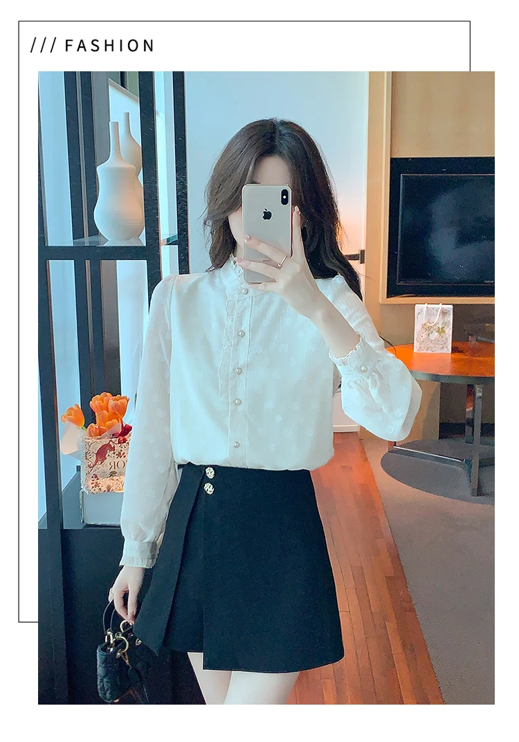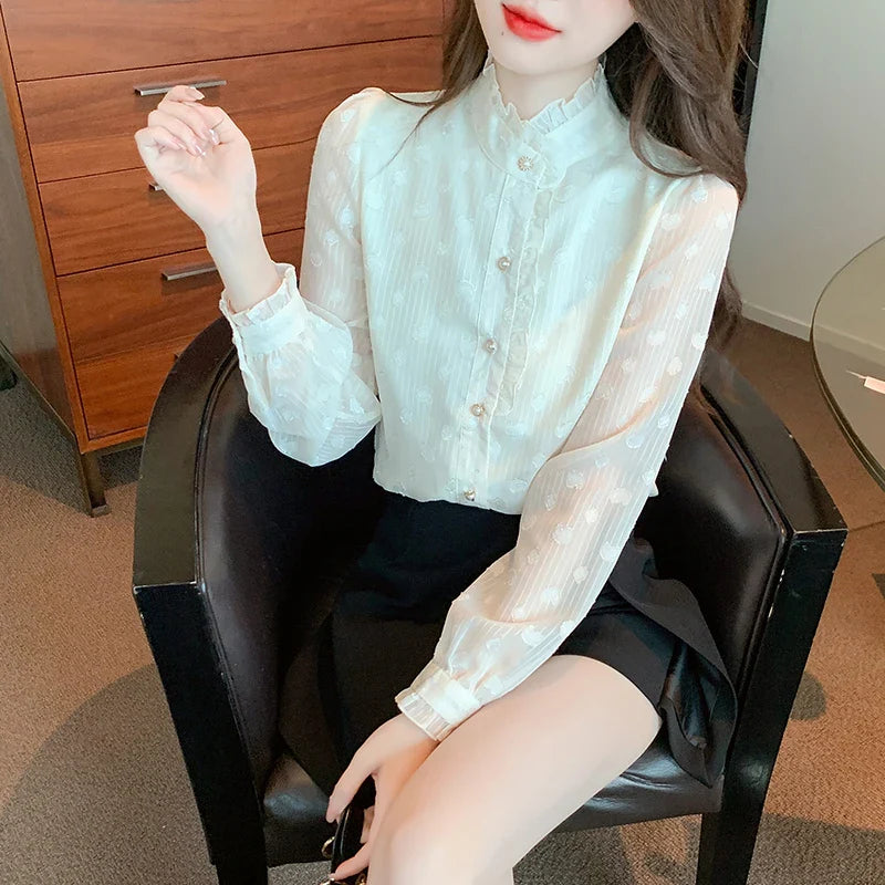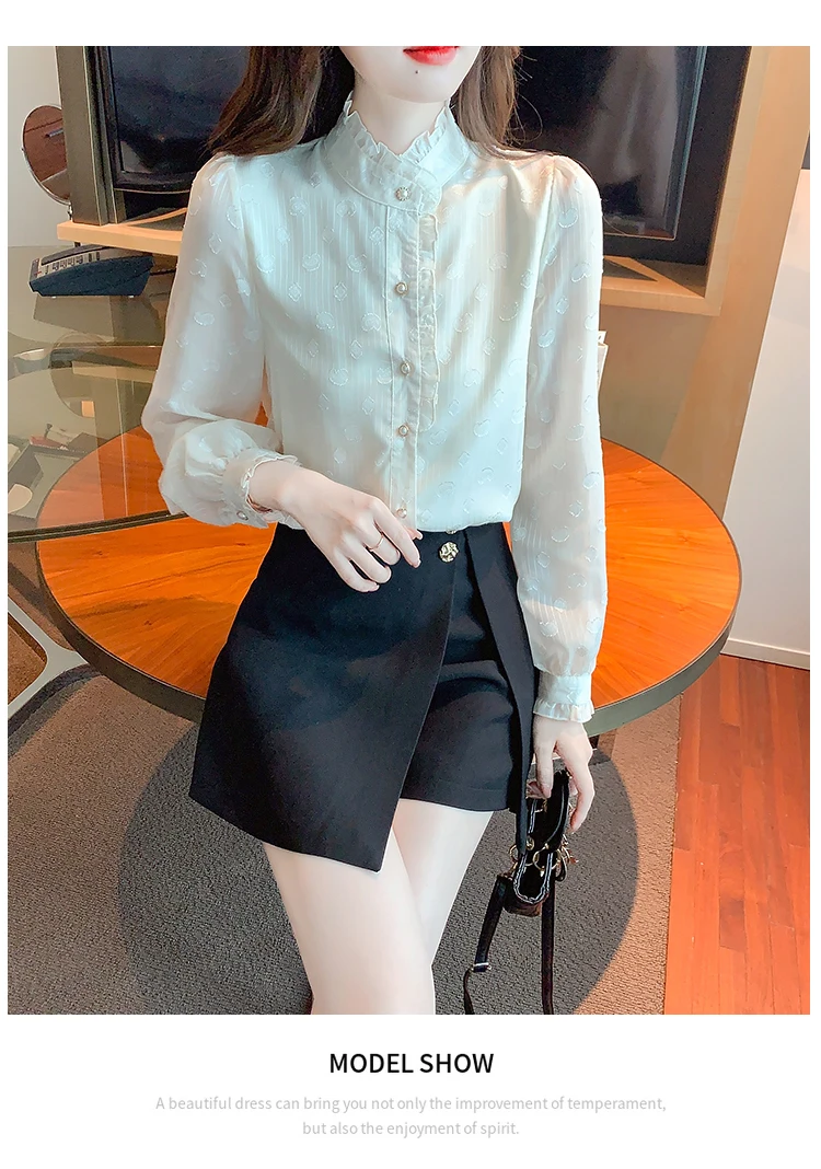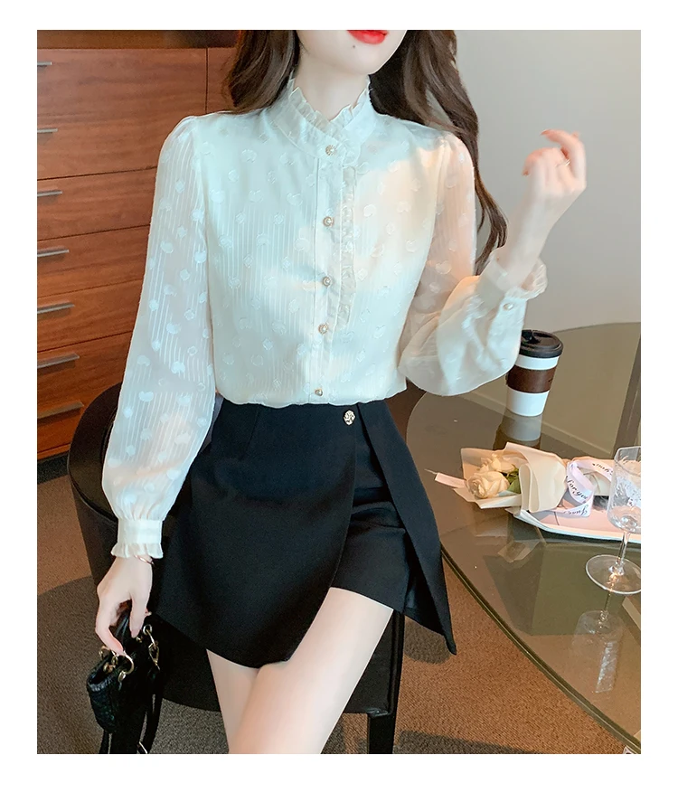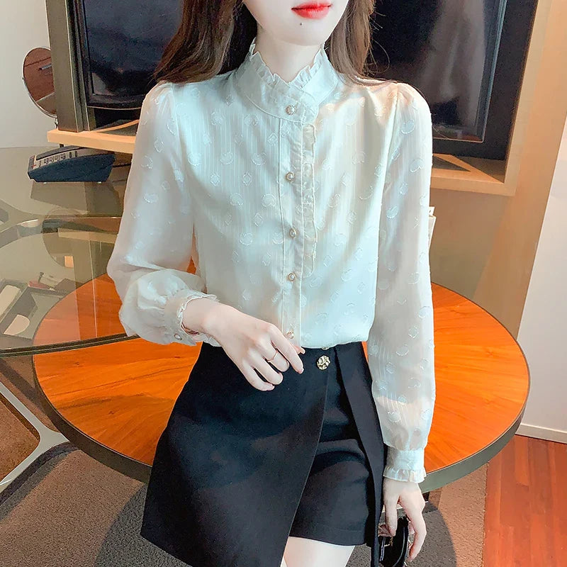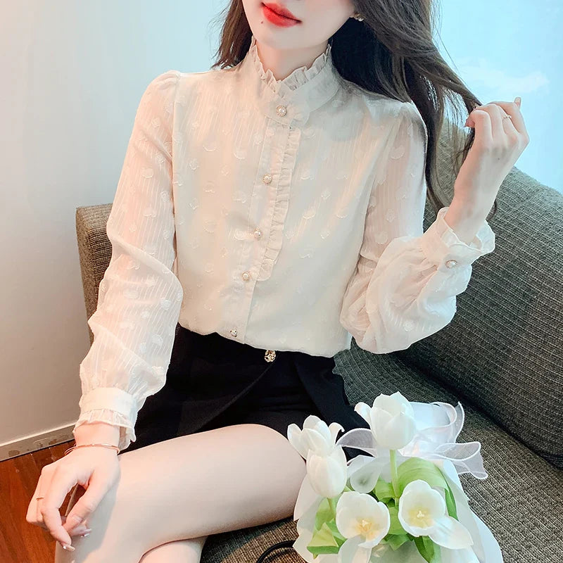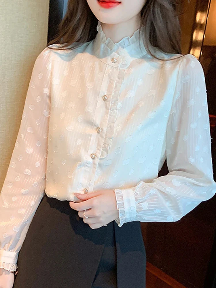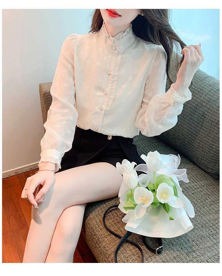 Znbbw Stand Collar Apricot Chiffon Blouse Shirt Women Tops Shirts Blusas Mujer De Moda 2023 Long Sleeve Blouse Women Blusa H16