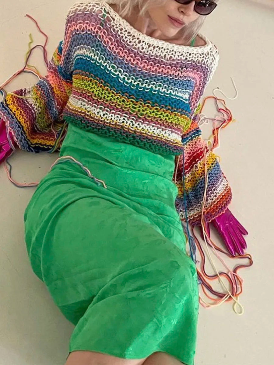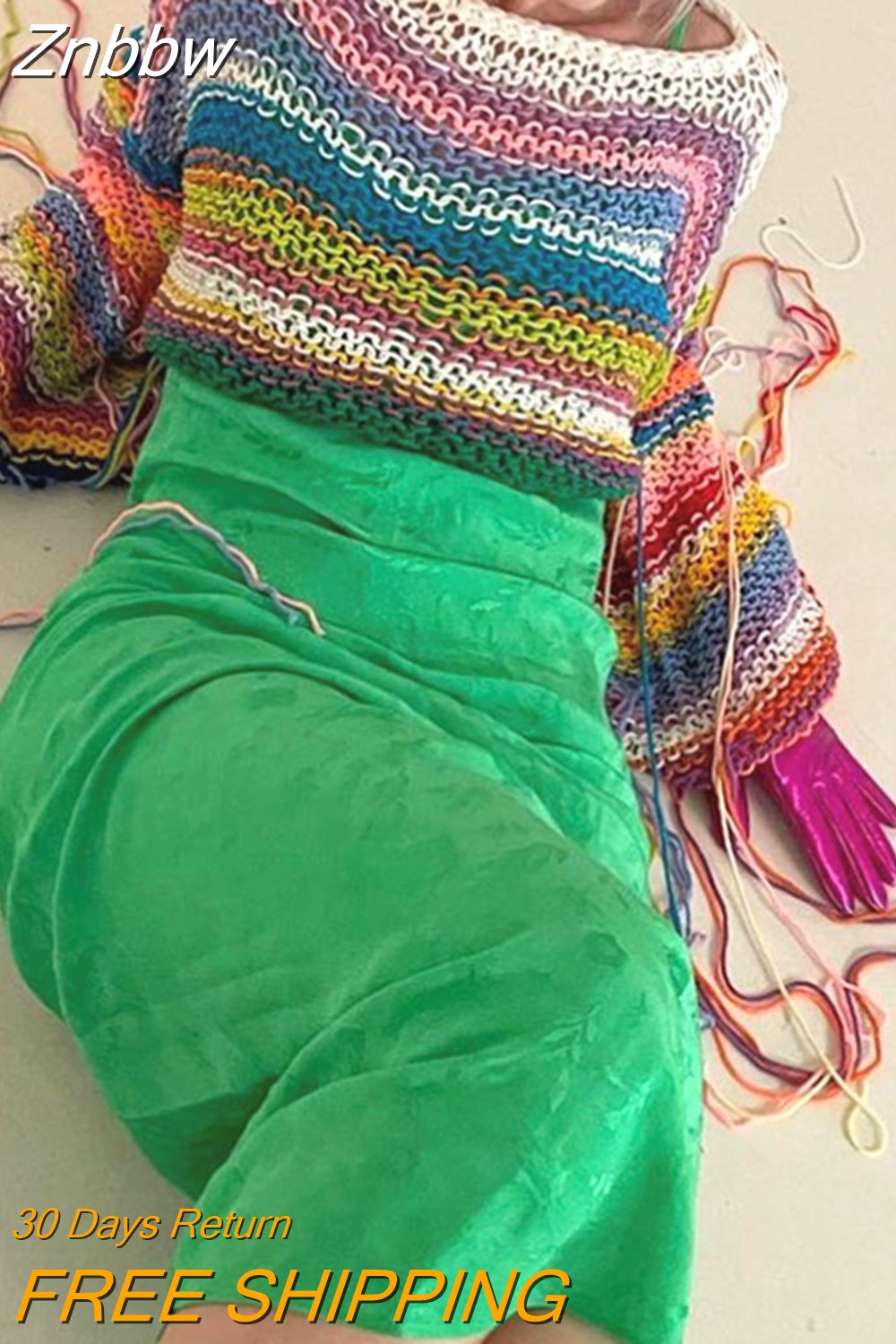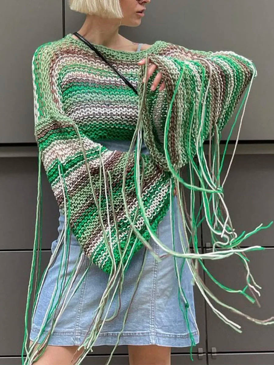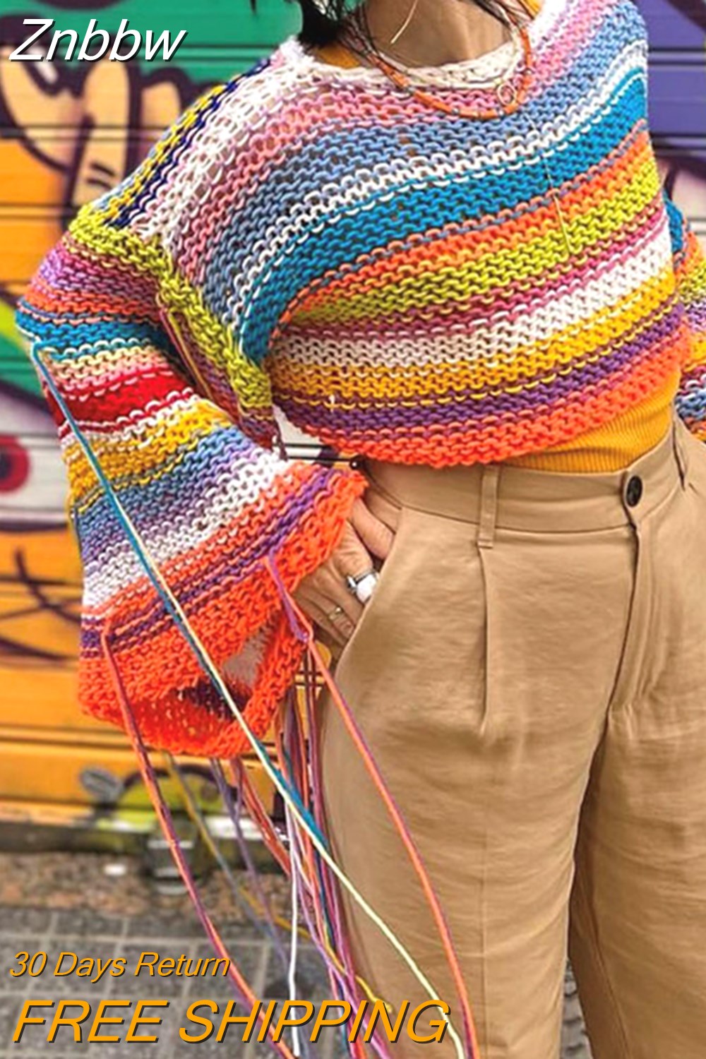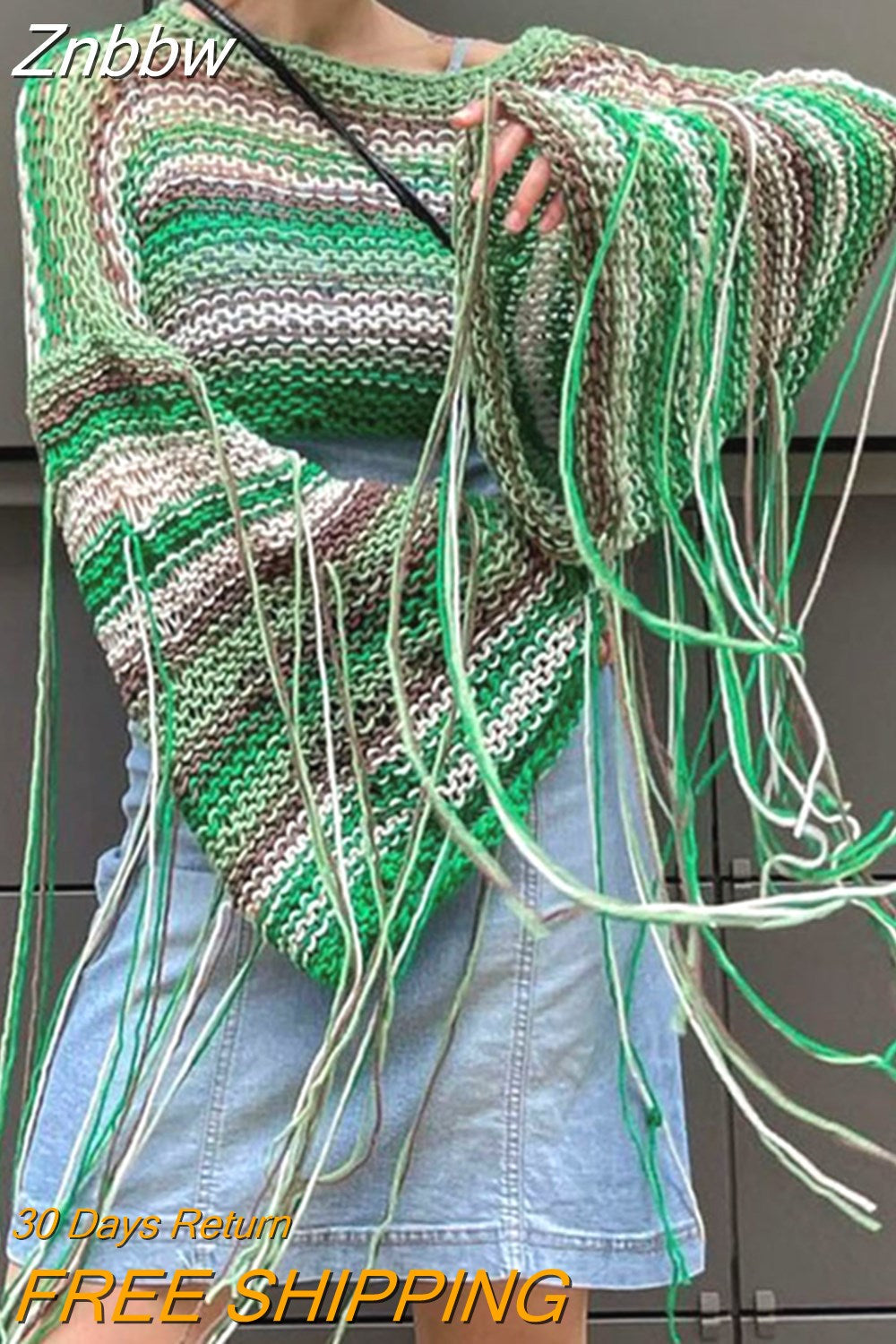 Znbbw Stripe Print Smock Top Women Knitted O Neck Tassel Full Sleeve Crop Top Crochet Vintage Korean Grunge Tee Fashion Aesthetic