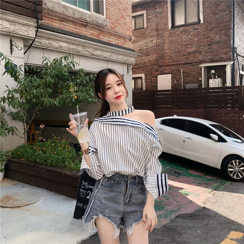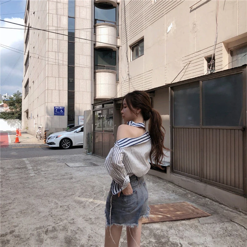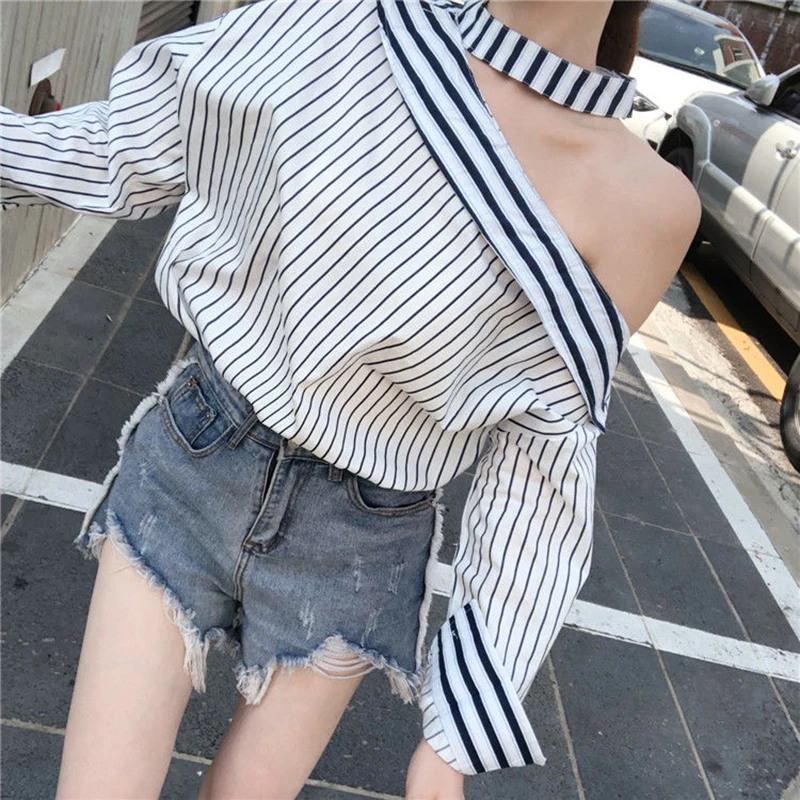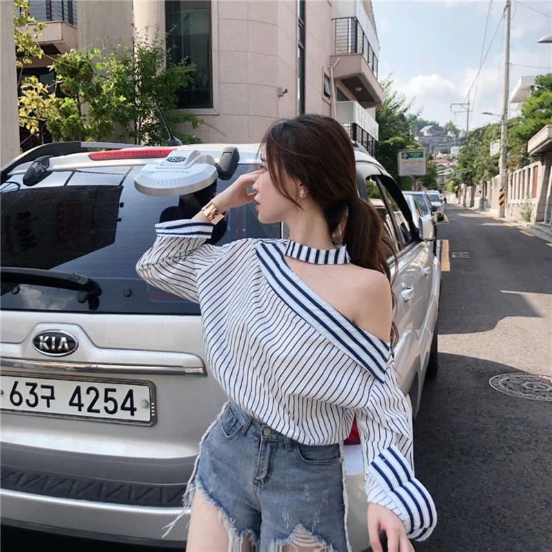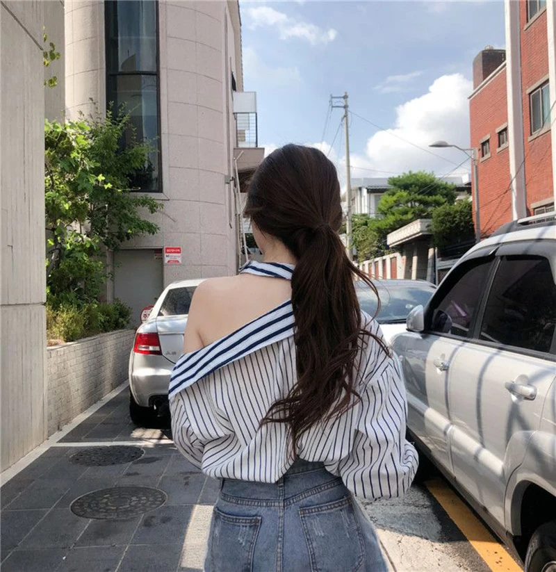 Znbbw Striped Shirts Women Streetwear Sexy Off Shoulder Blouses Korean Fashion Hollow Out Halter Long Sleeve Casual Tops New