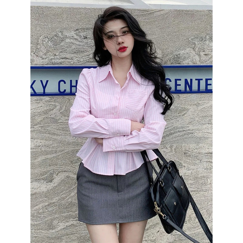 Znbbw Striped Shirts Women Y2K Streetwear Folds Tunic Crop Tops Korean Fashion Simple Pink Long Sleeve Slim All Match Blouses