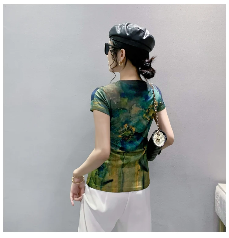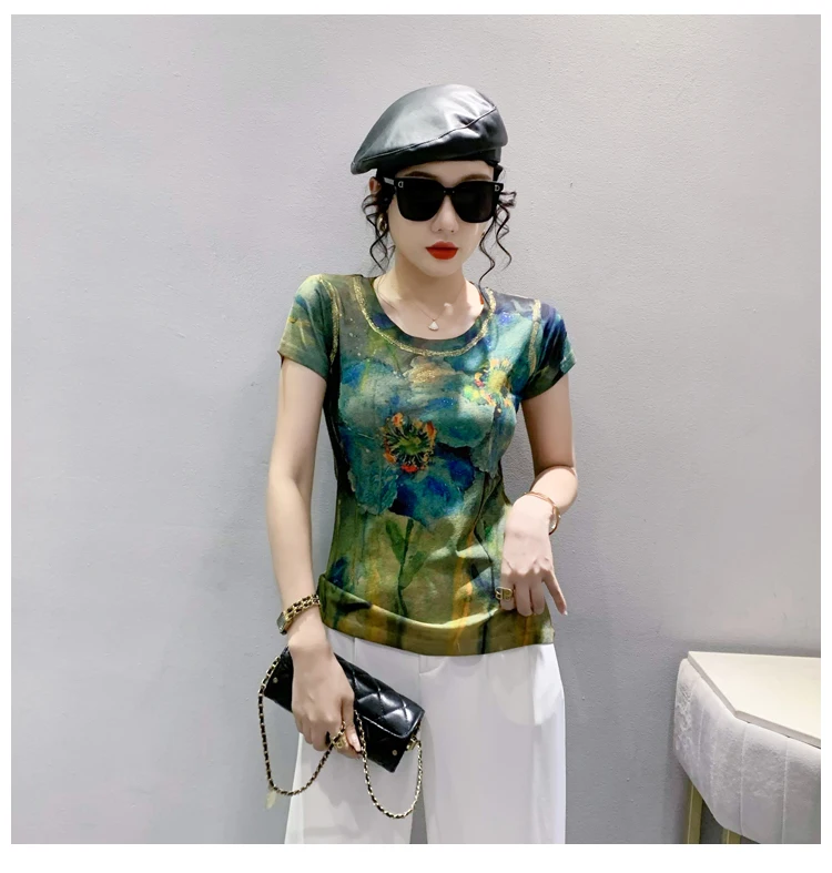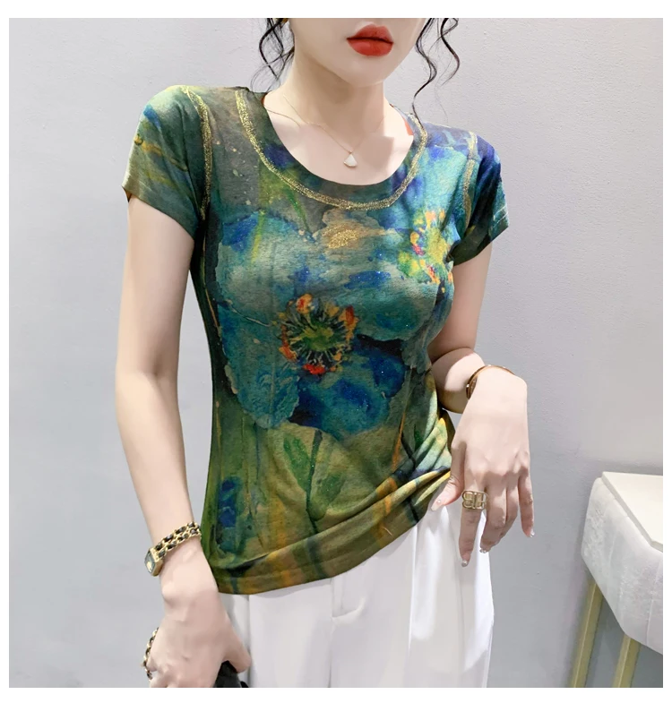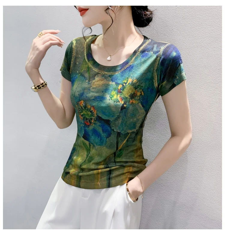 Znbbw Summer Fashion Bronzing T-shirts Women's Printed Floral High Stretchy Tops Tees Lady Slim T Shirt
