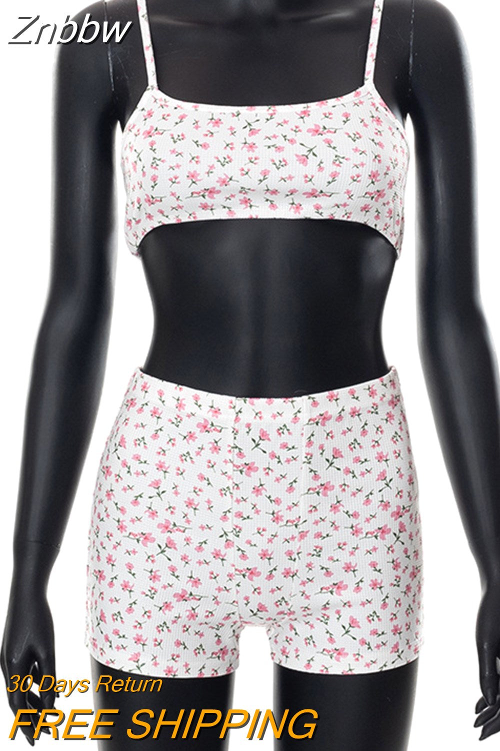 Znbbw Summer Flowers Print 2Pcs Shorts Sets Women Casual Sports Suits Sleeveless Sling Camisole Crop Tops+High Waist Shorts
