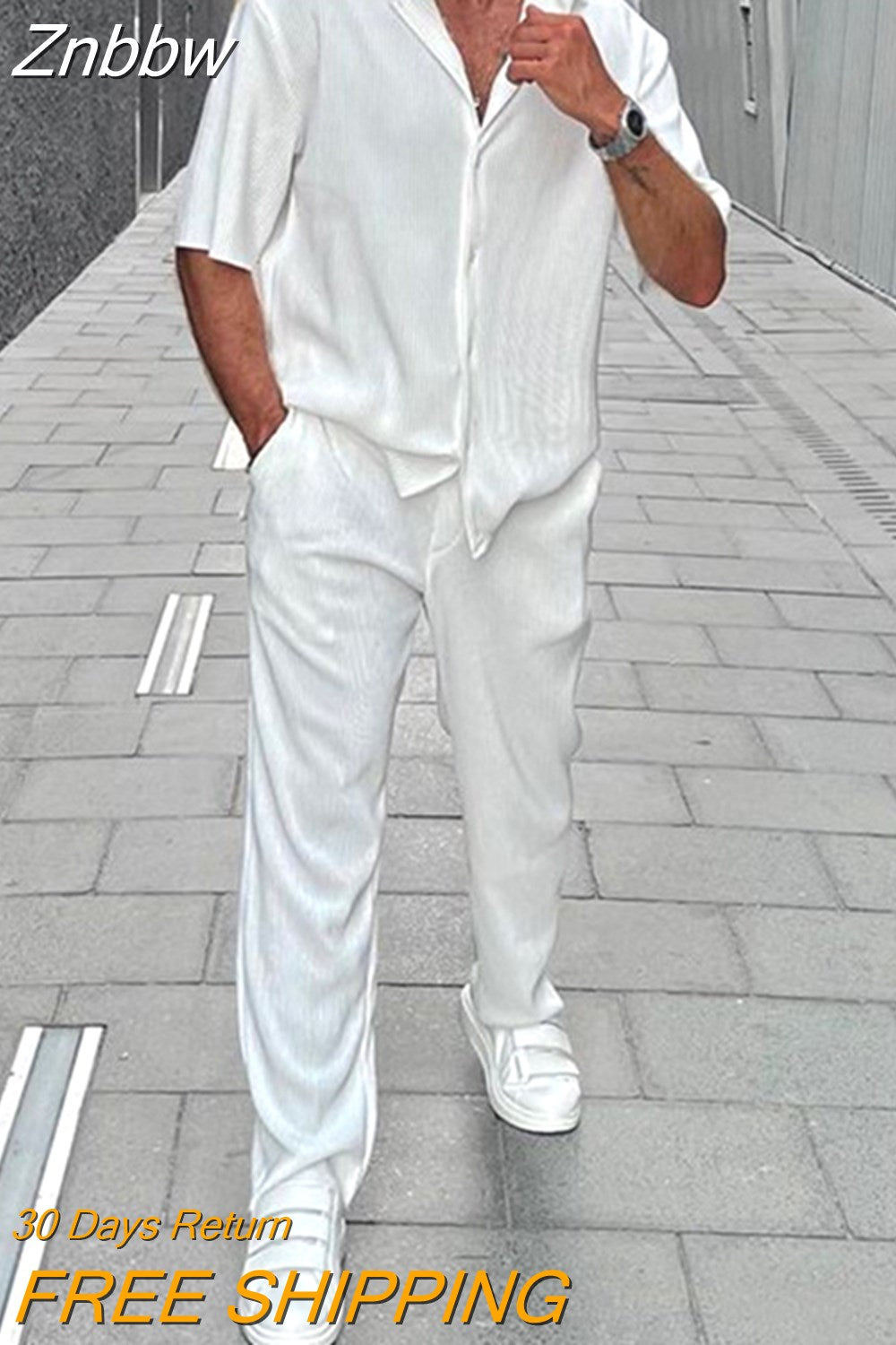 Znbbw Summer Men Simple Solid Two-piece Set Lapel Button Shirt + Long Pants Casual Suit Office Men's Short Sleeve Loose Outfits