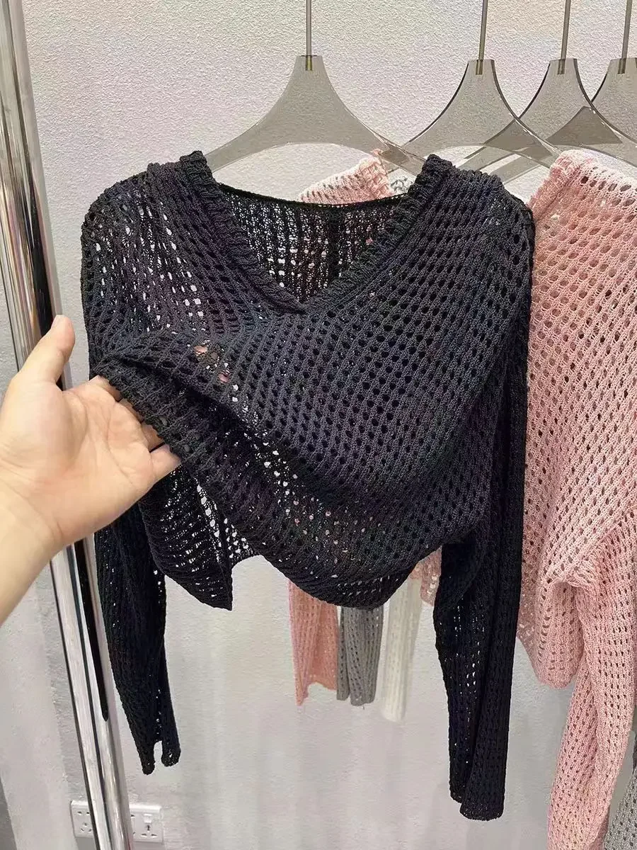 Znbbw Summer New Short Hooded Hollow Knitwear Women's Thin Long sleeved Loose Top Sunscreen Cover
