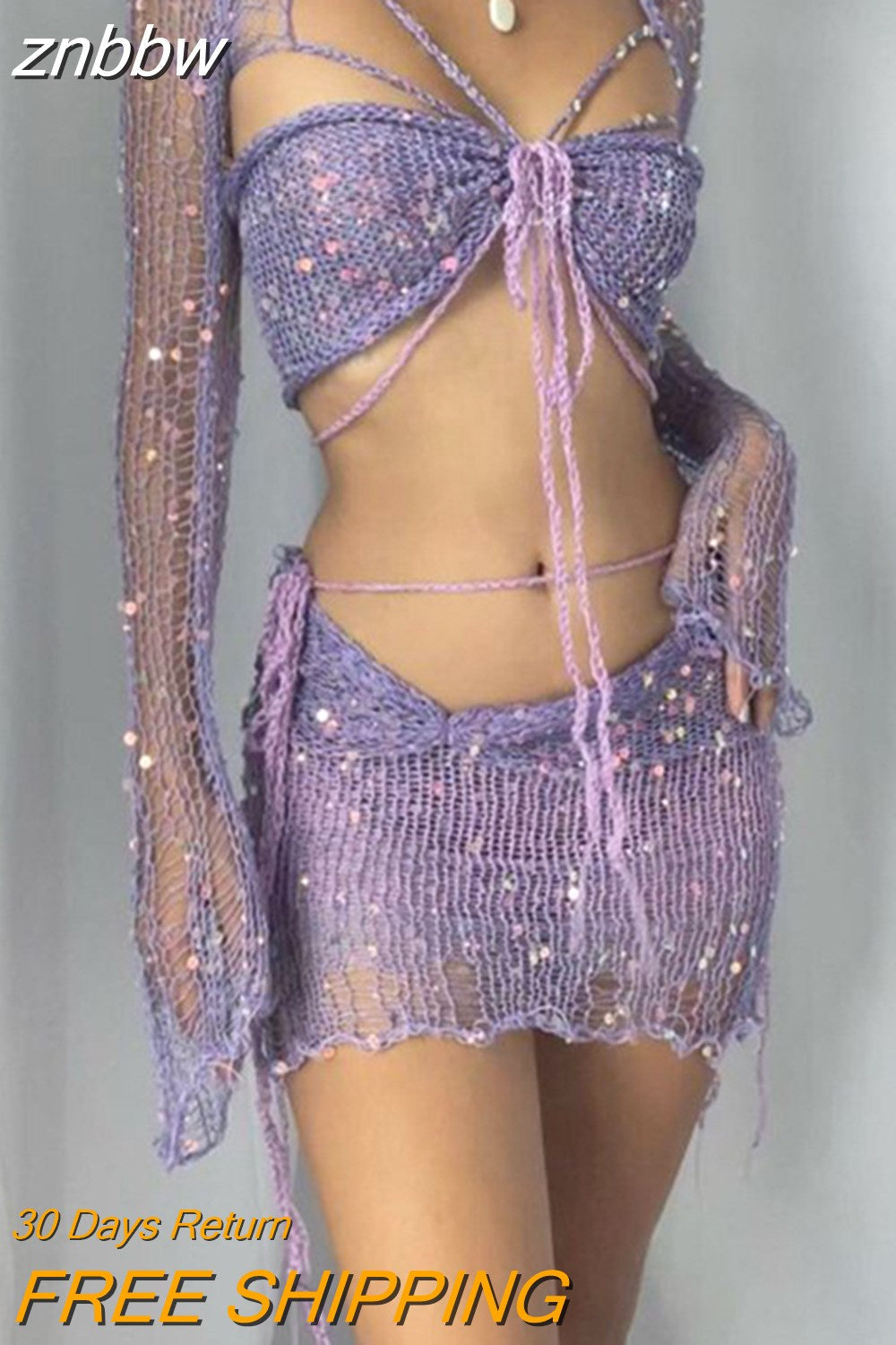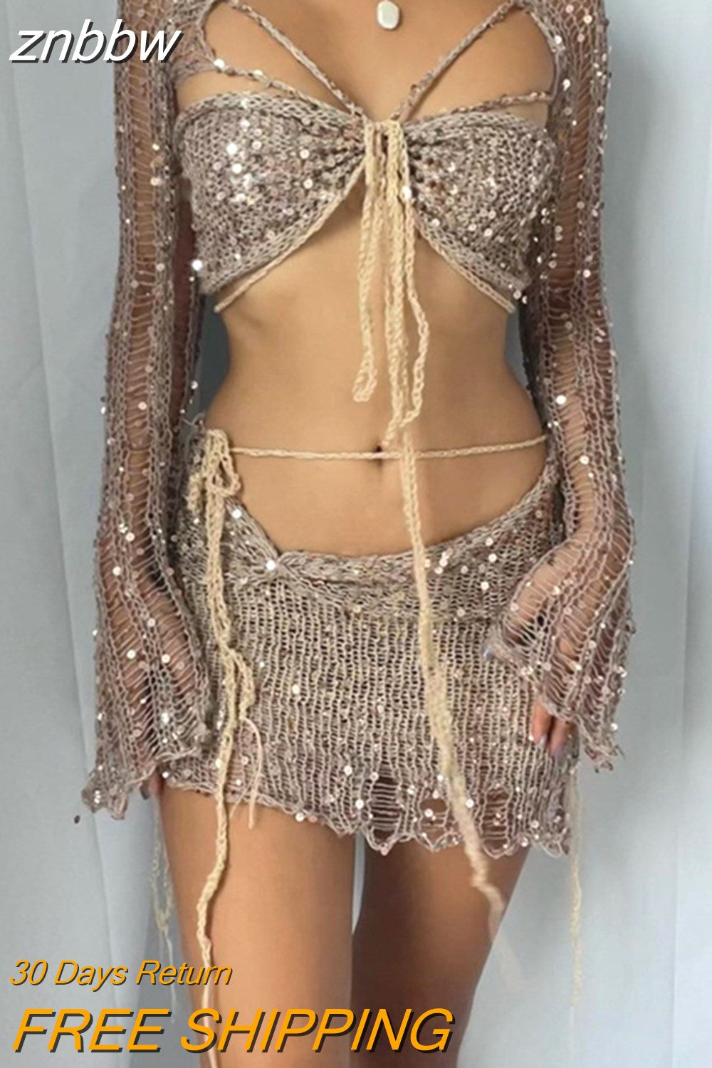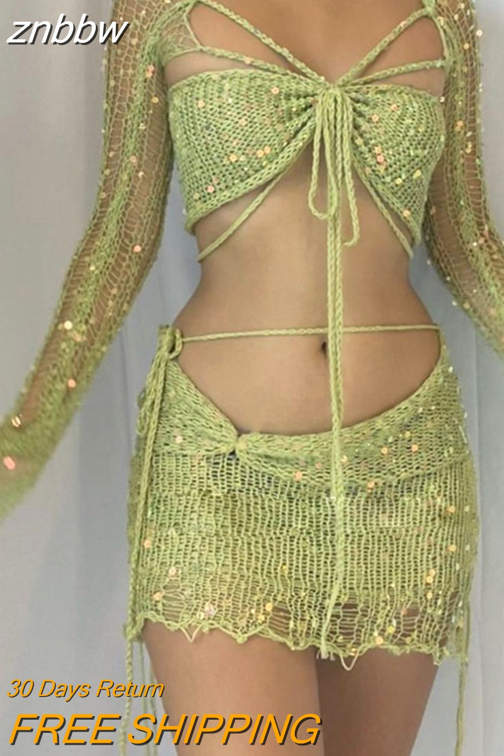 znbbw Summer Sexy Knit Bodycon Bandage Two Piece Skirts Set For Women 2023 Long Sleeve Backless Crop Top And Booty Mini Skirt