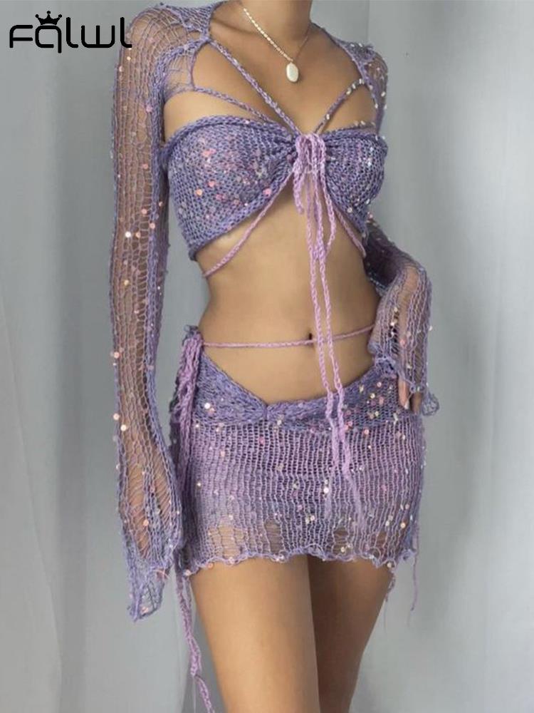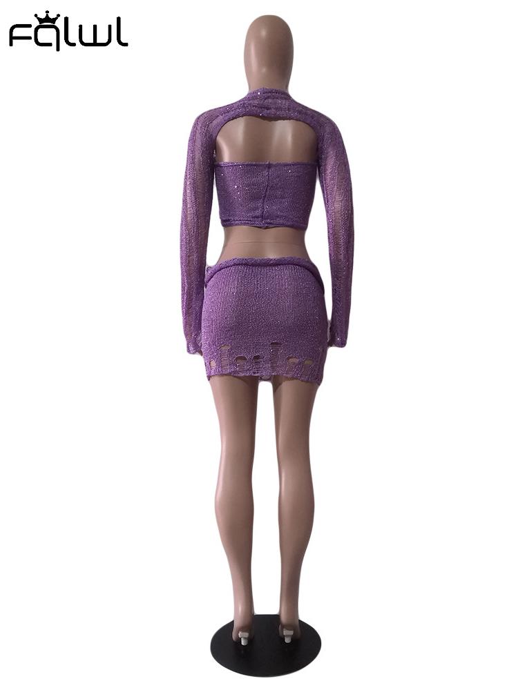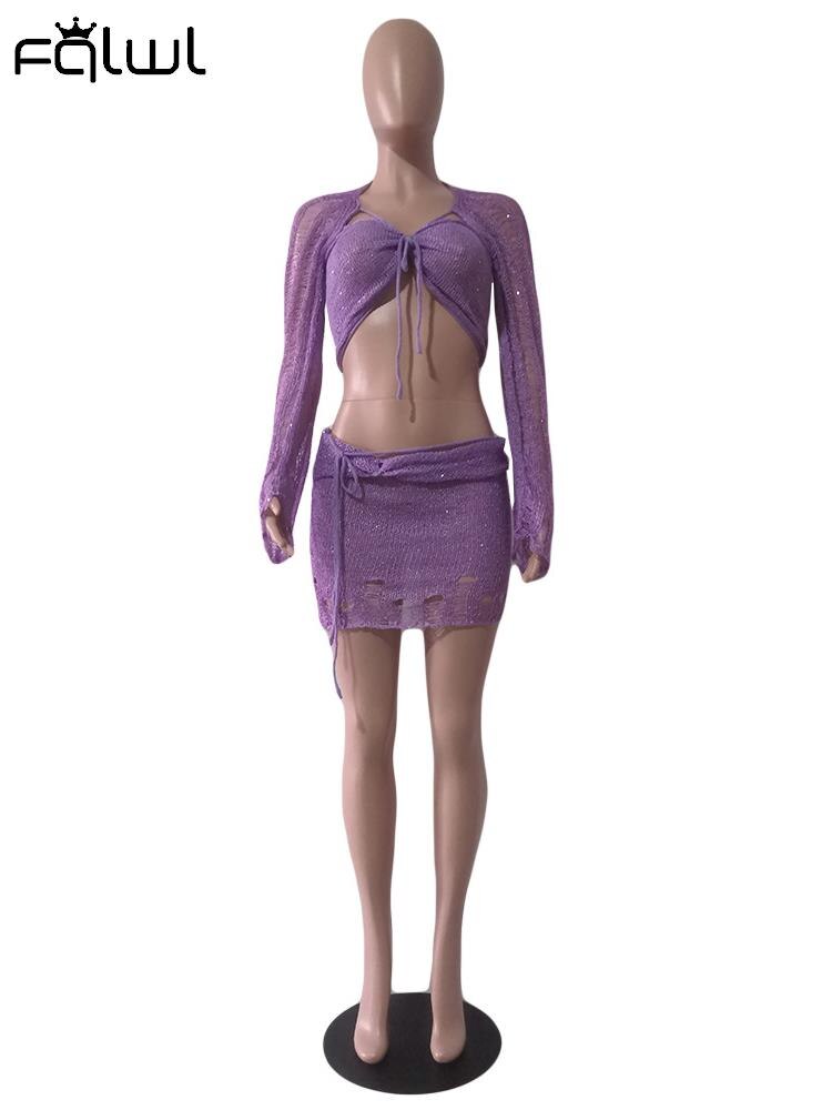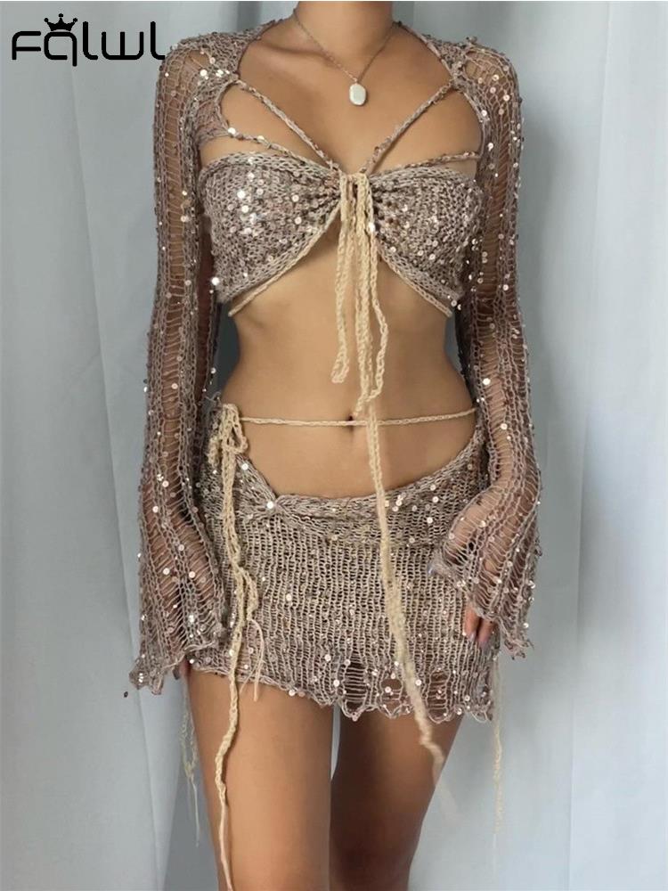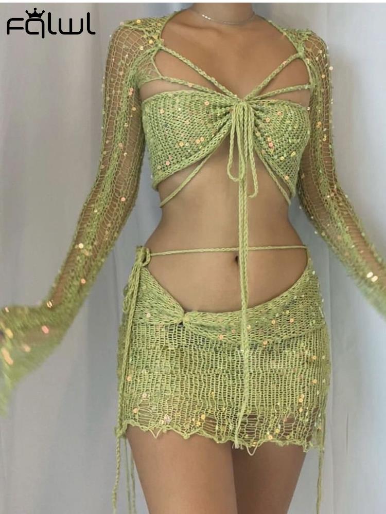 znbbw Summer Sexy Knit Bodycon Bandage Two Piece Skirts Set For Women 2023 Long Sleeve Backless Crop Top And Booty Mini Skirt