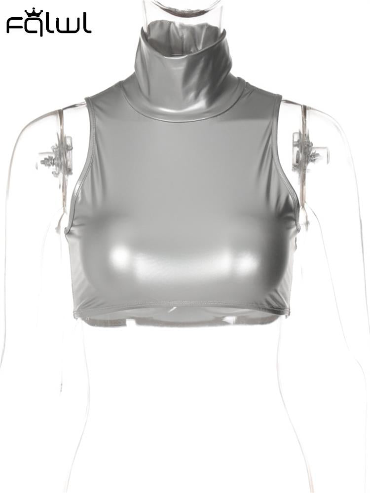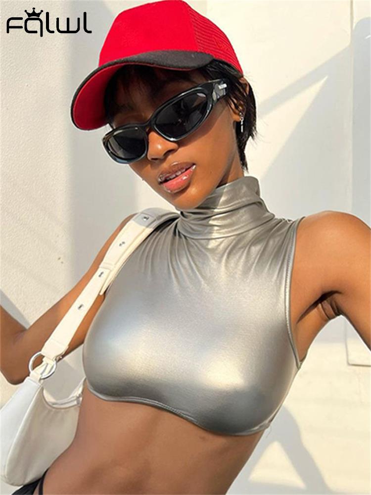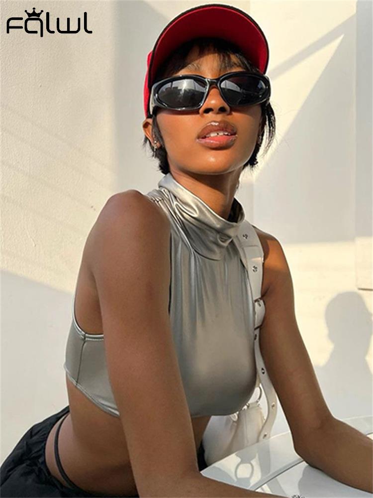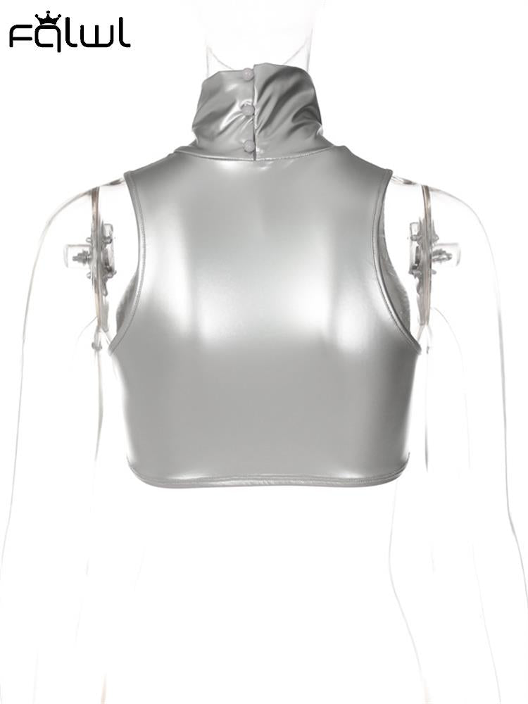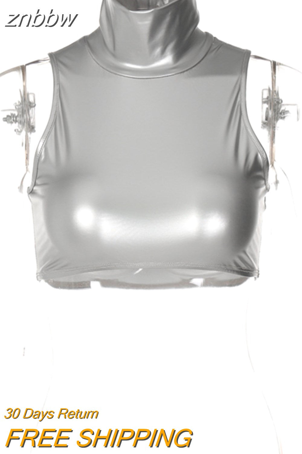 znbbw Summer Sexy silver Crop Top Club Outfit For Women 2023 Turtleneck Button Sleeveless Corset Tank Tops Party Casual Tops