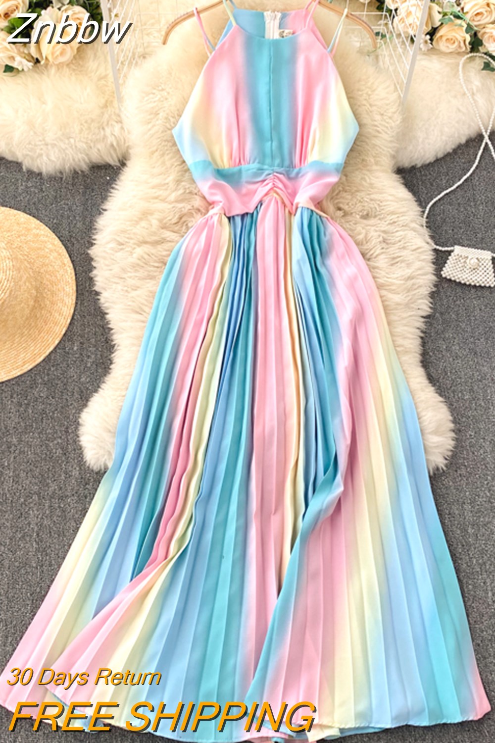 Znbbw Summer Temperament Vestidos Feminine Strapless Sling Square Collar Rainbow Gradient Color Slimming Holiday Midi Dress C361