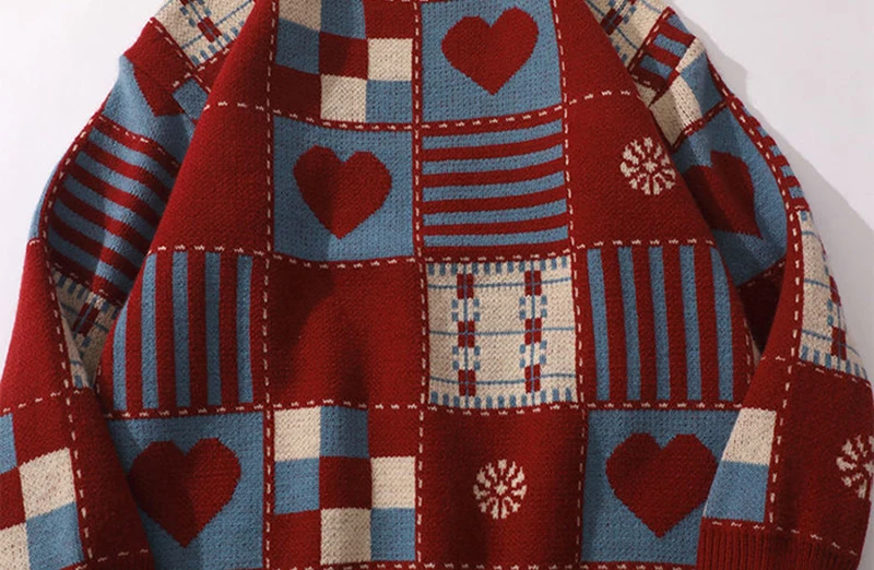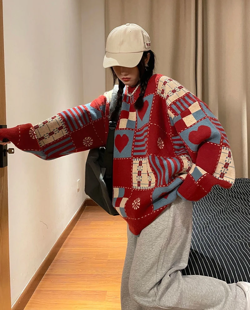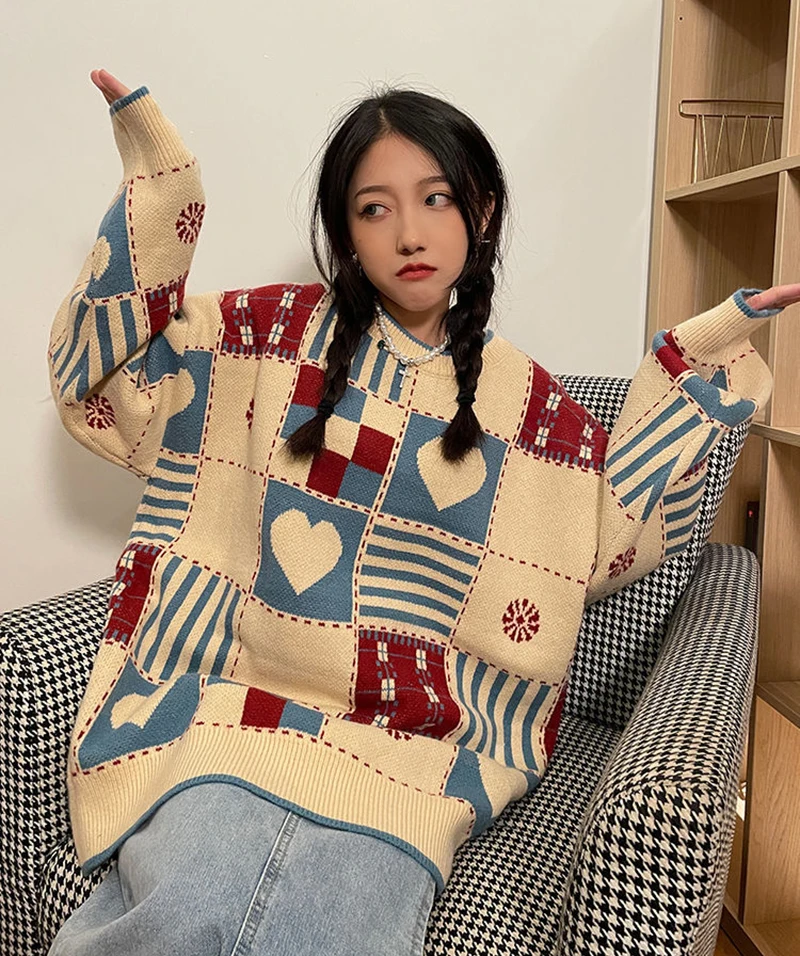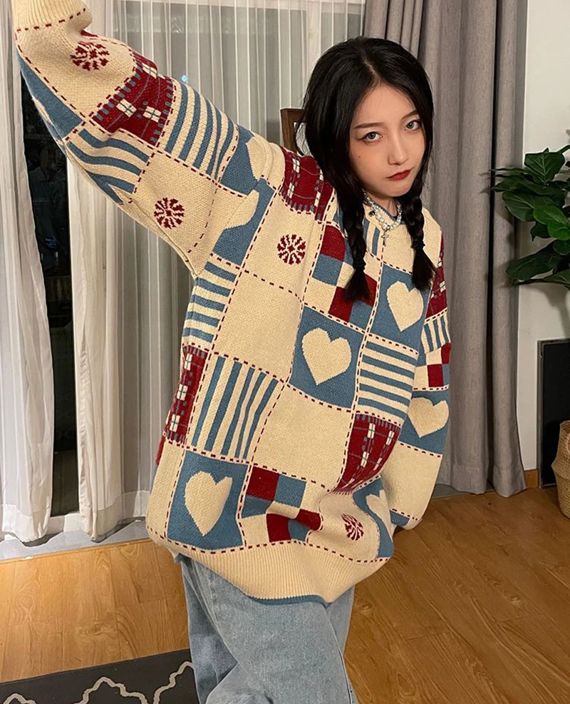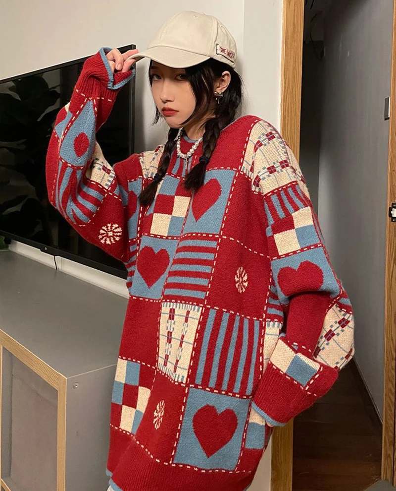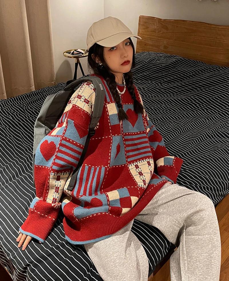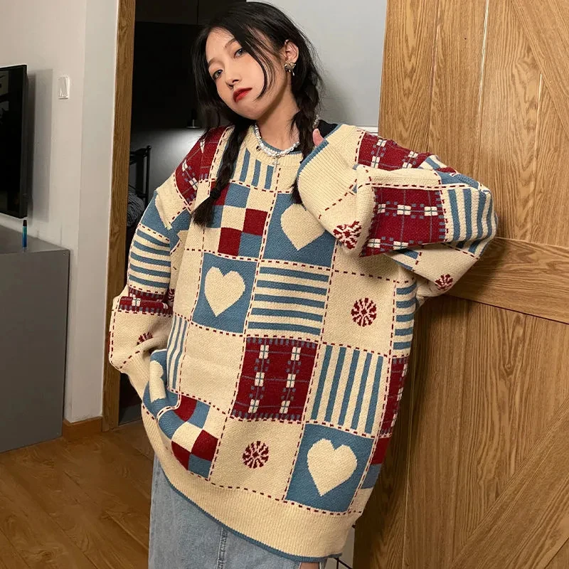 Znbbw Sweater Women Plaid Love Knitwear Harajuku Oversized Print Knit Jumpers Streetwear Korean Heart Casual Pullovers Tops