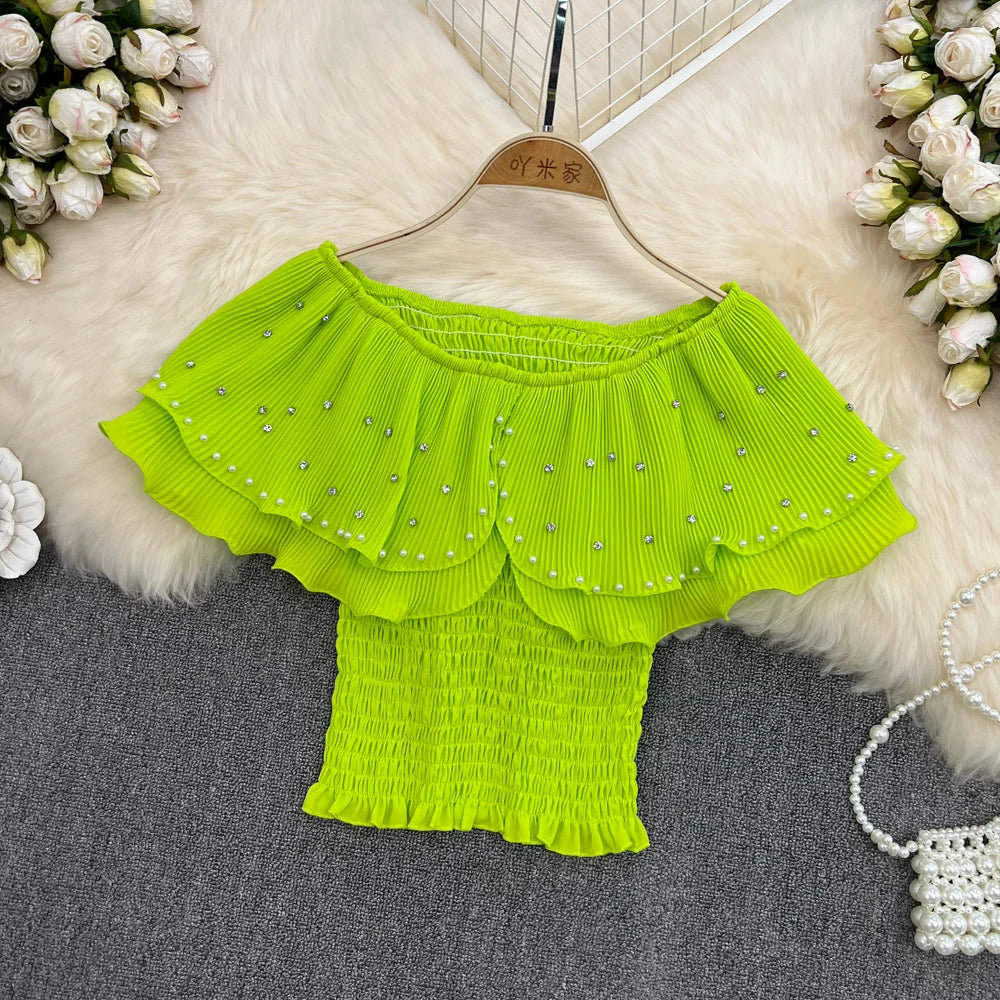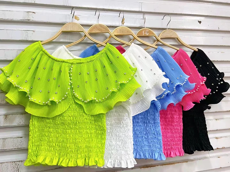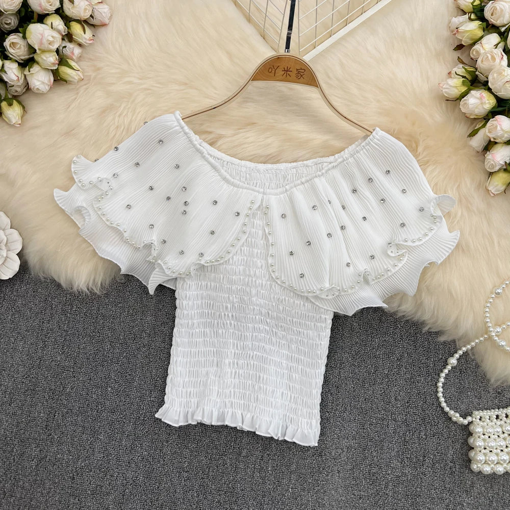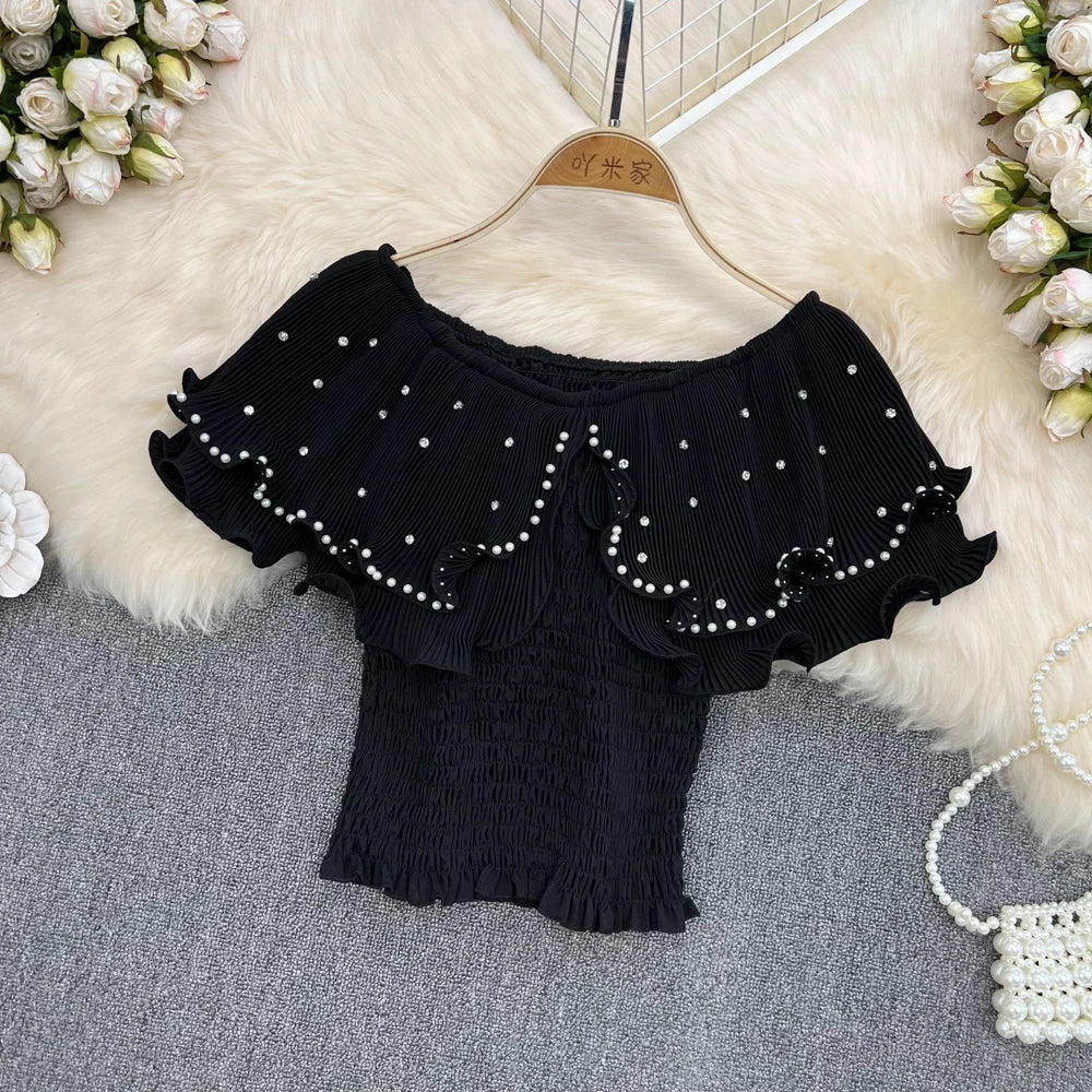 Znbbw Sweet Cropped T-shirt Women Beading Ruffles Slash Neck Crop Tops Girls High Stretchy Fashon Tee Shirts