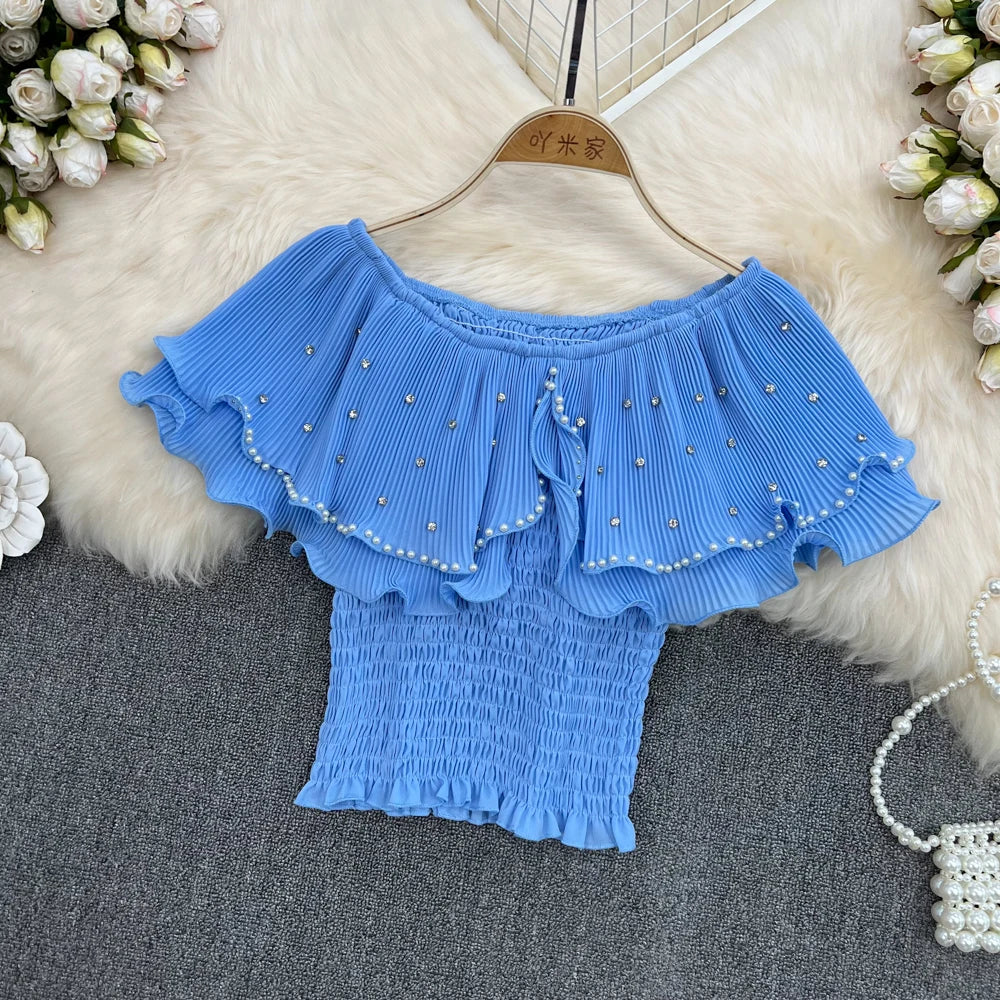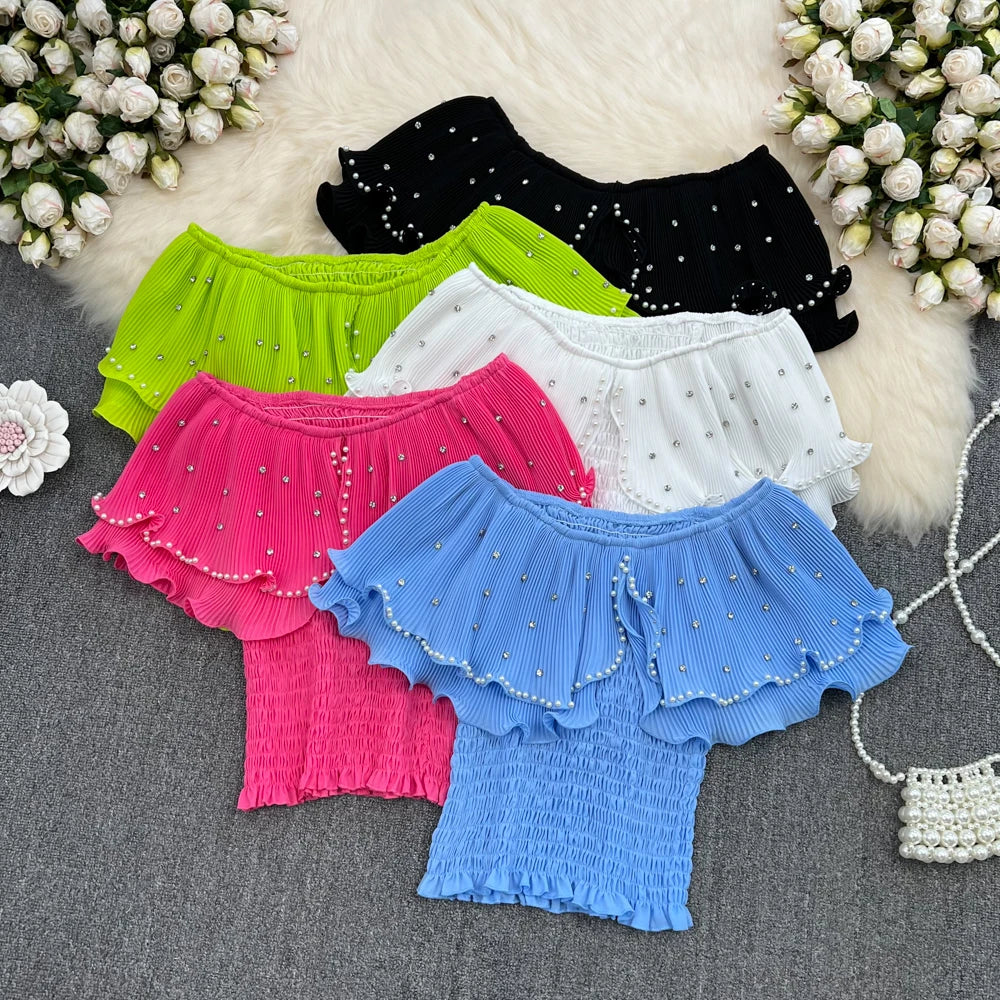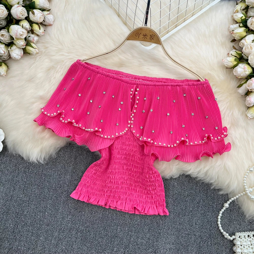 Znbbw Sweet Cropped T-shirt Women Beading Ruffles Slash Neck Crop Tops Girls High Stretchy Fashon Tee Shirts