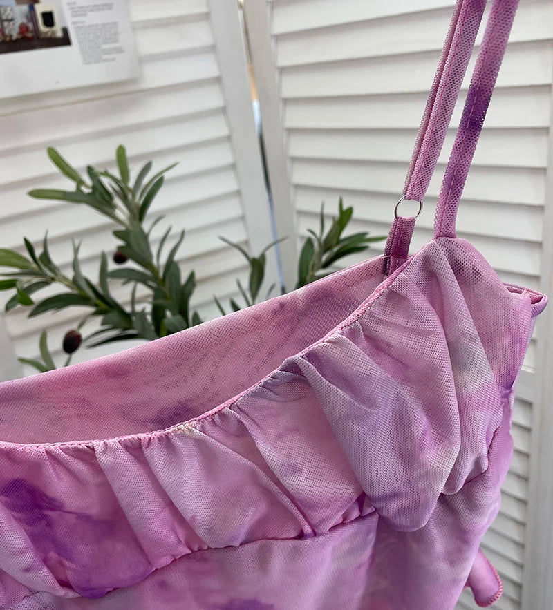 Znbbw Sweet Hot Ruffles Mesh Camisole Top Lady Camis Sleeveless Printed Floral T shirts High Stretch Slim Tanks For Slim Women