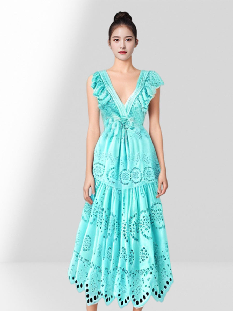 Znbbw Temperament Flying Sleeve V Collar Waist Shows Thin A Word Big Pendulum Hollowed-Out Dress Seaside Holiday Long Skirt