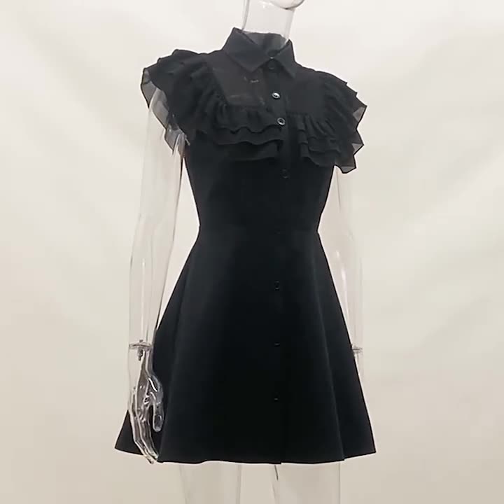 Znbbw Temperament Lotus Leaf Edge Waist Polo Collar Dress Dark Fashion Leisure Commuter Black Skirt Children