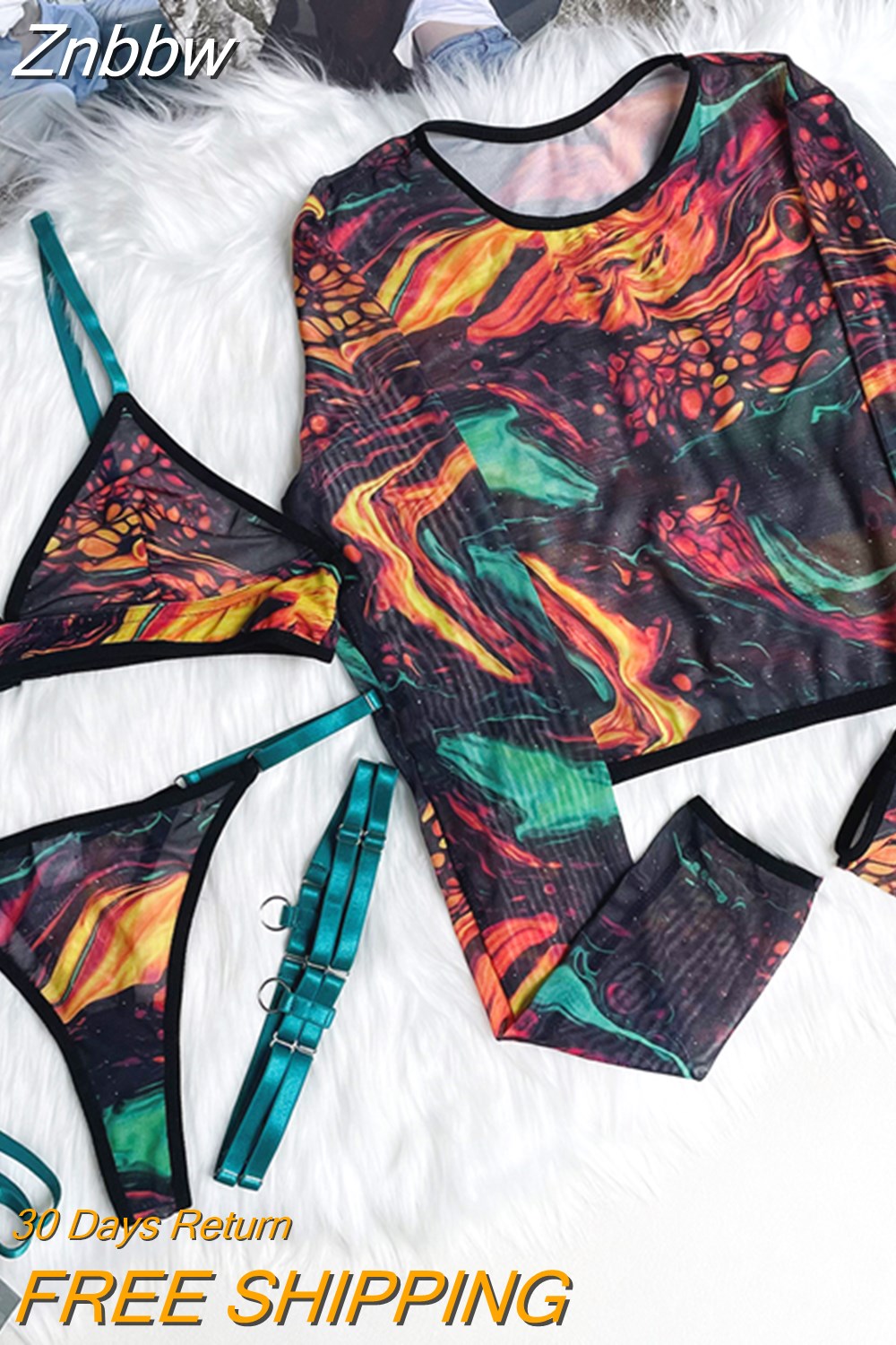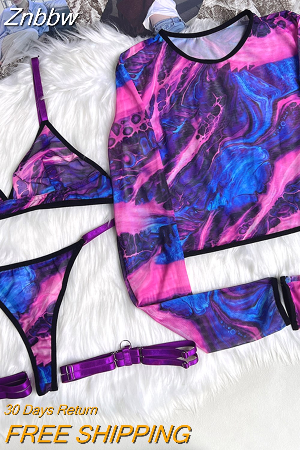 Znbbw Tie Dye Lingerie With Long Sleeve Tops Lace See Through Sensual Erotic Sets 4-Piece Sexy Seamless Erotic Underwear