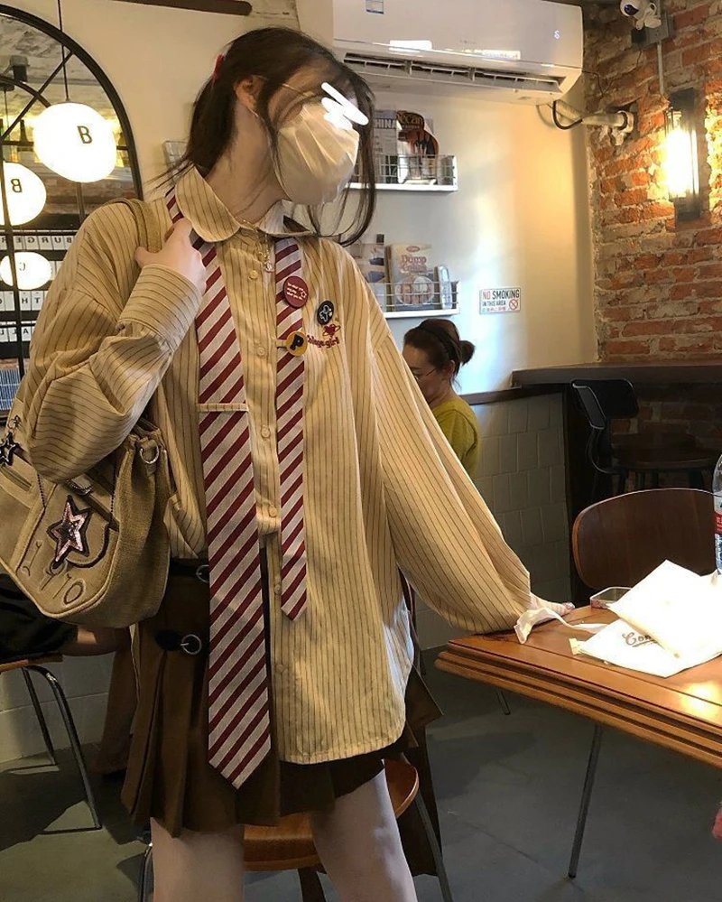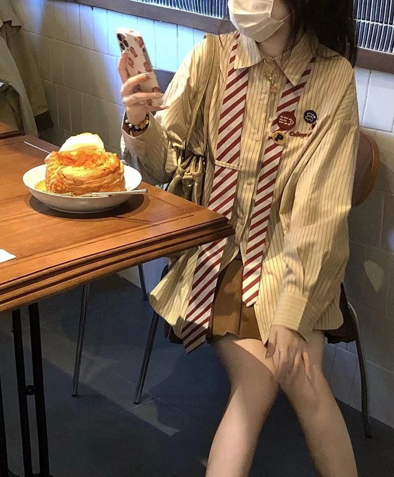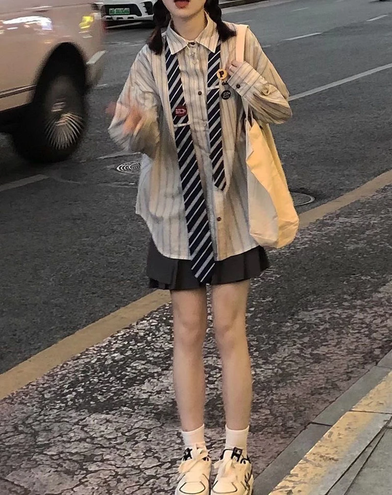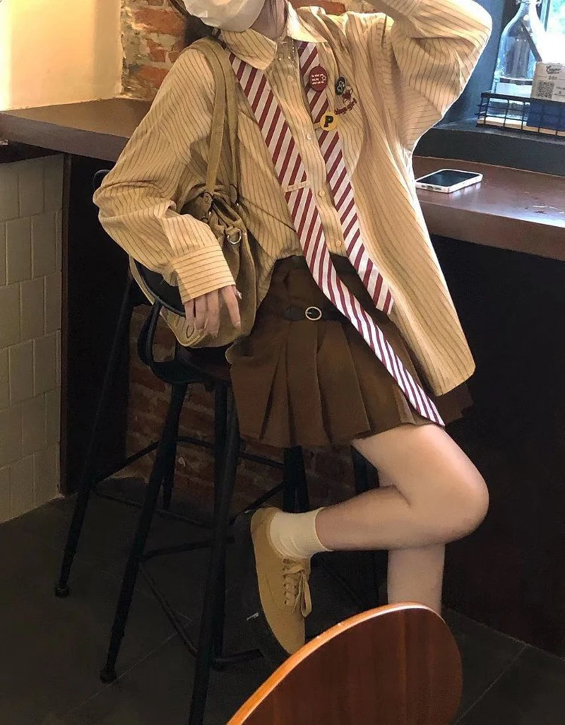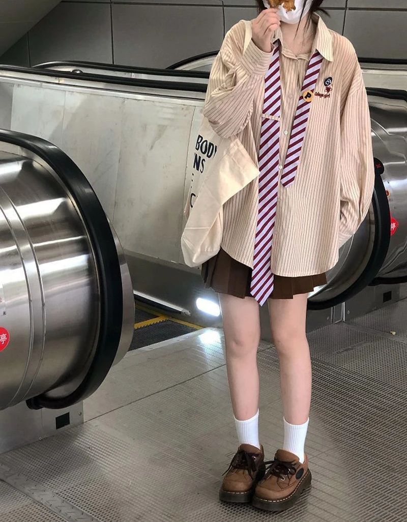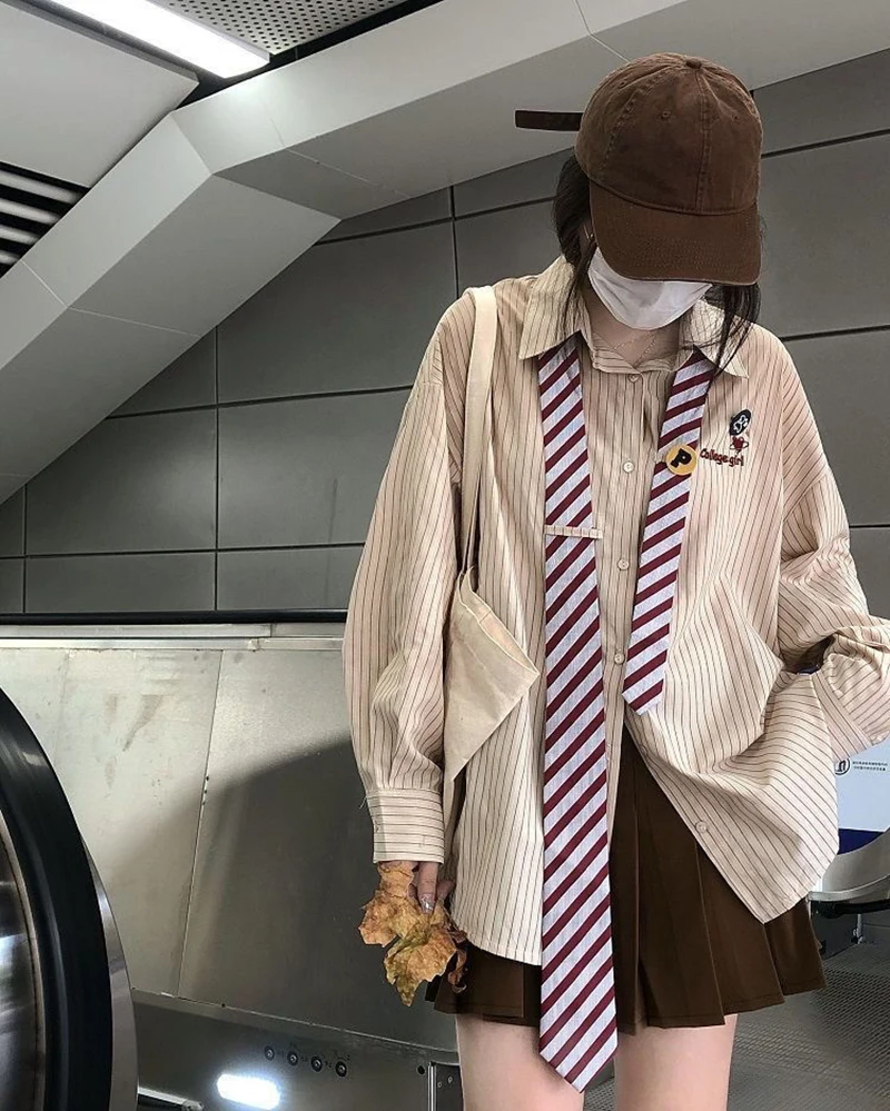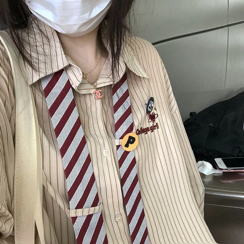 Znbbw Tie Striped Shirts Women Harajuku Brooch Oversized Long Sleeve Blouses Streetwear Korean Preppy Print Loose Casual Tops