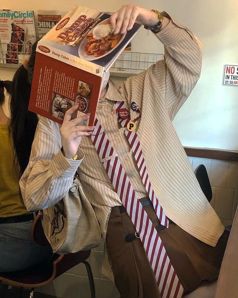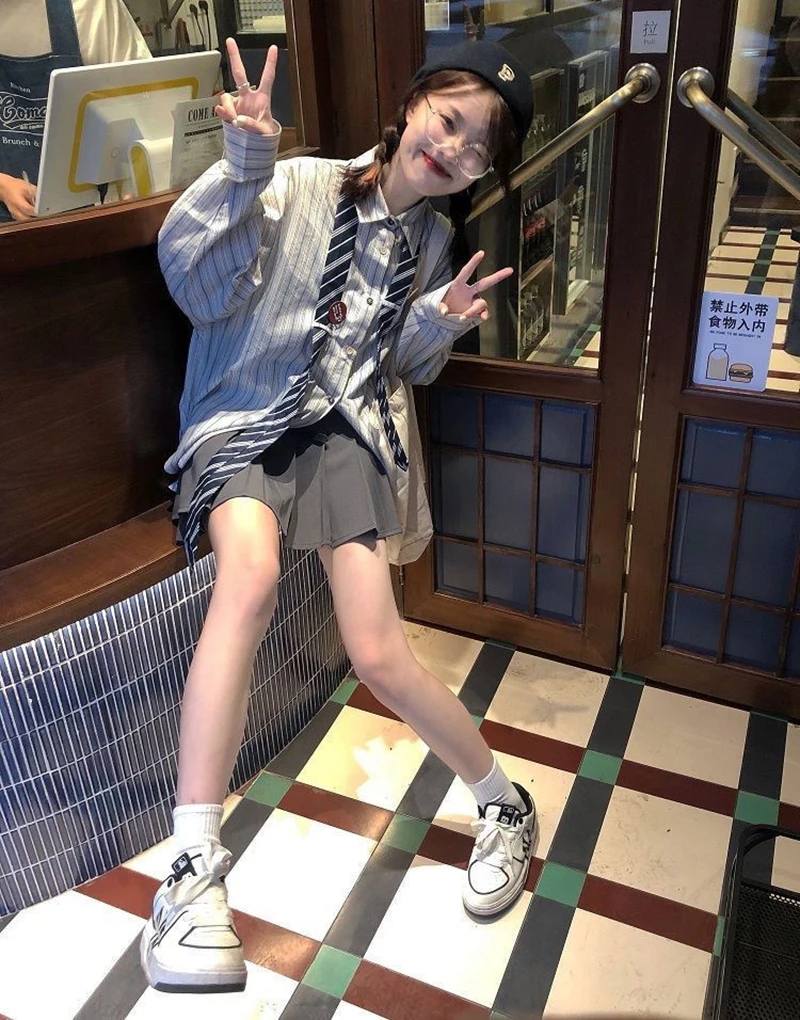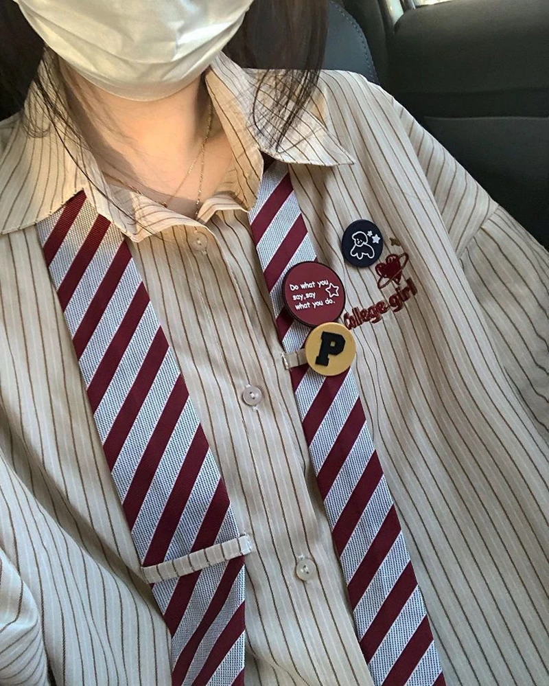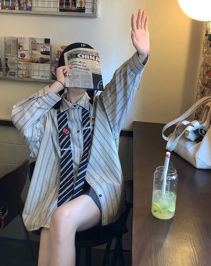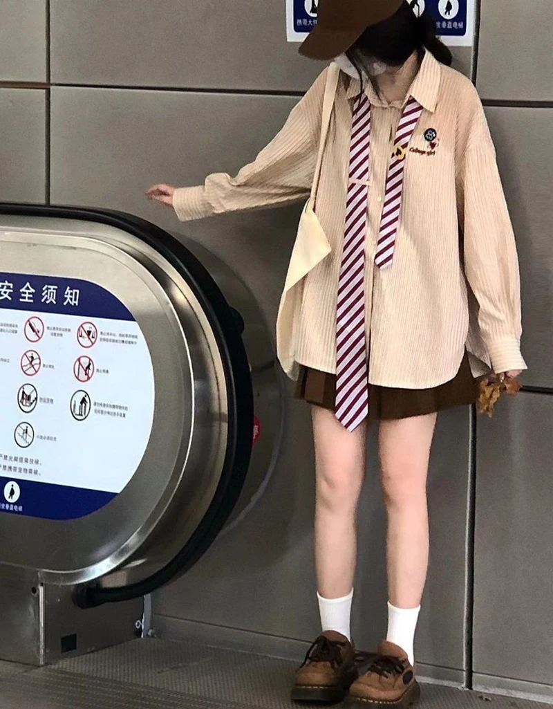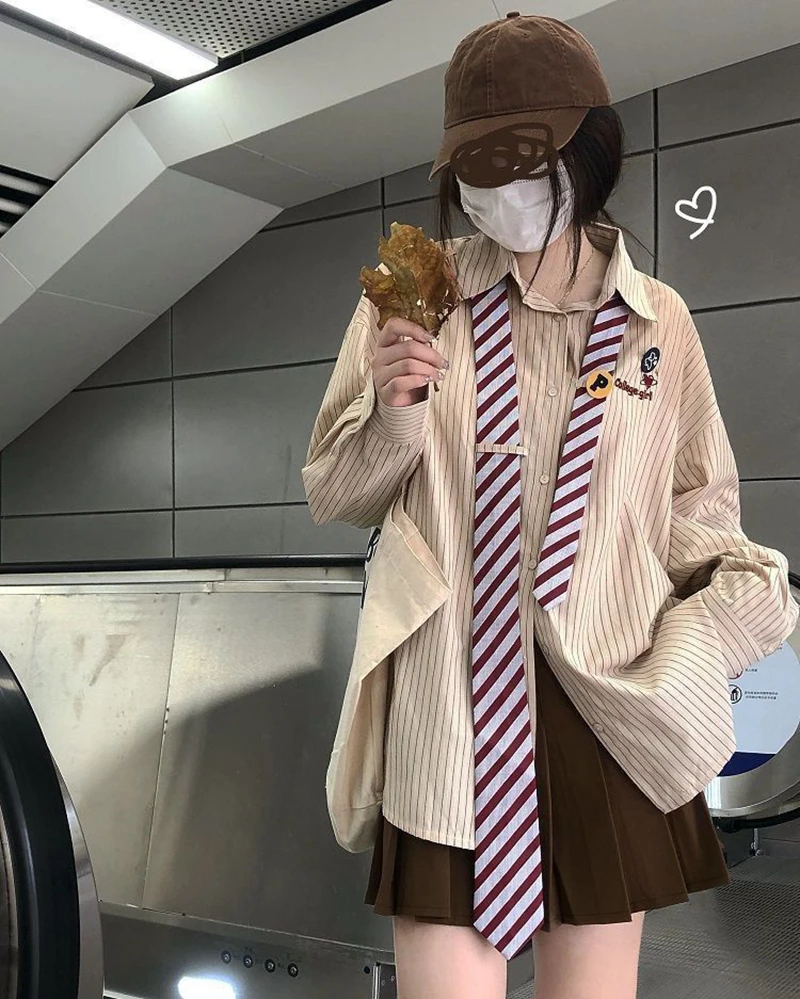 Znbbw Tie Striped Shirts Women Harajuku Brooch Oversized Long Sleeve Blouses Streetwear Korean Preppy Print Loose Casual Tops