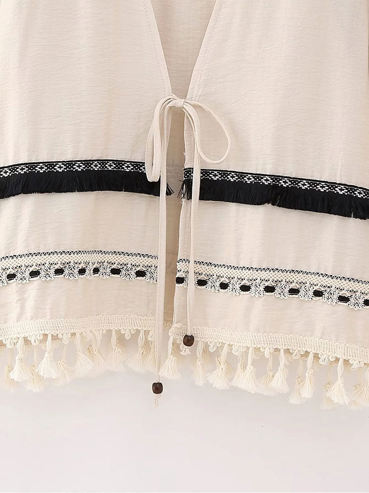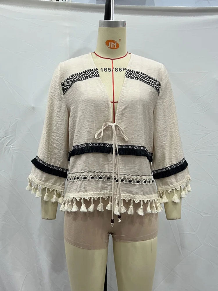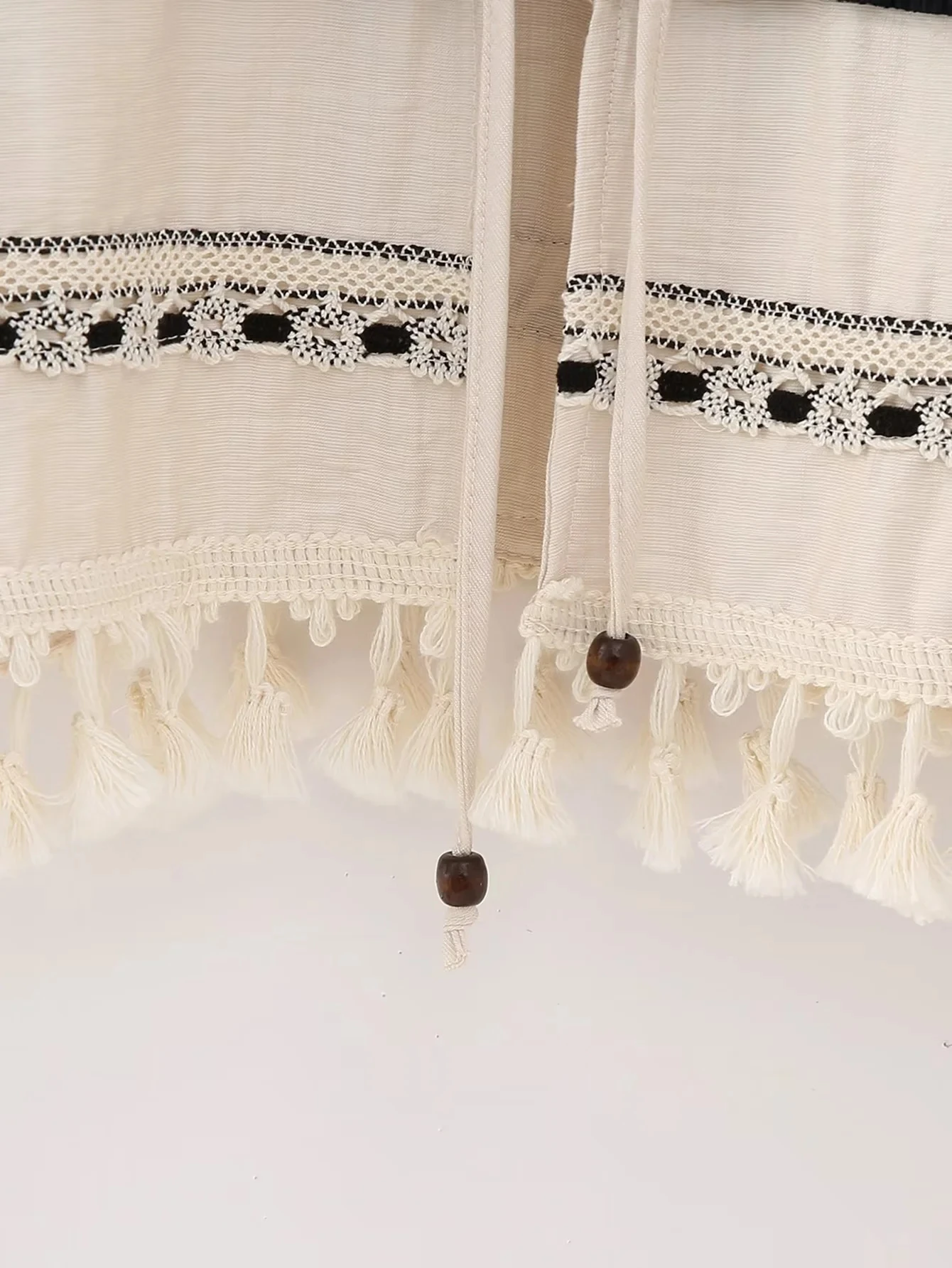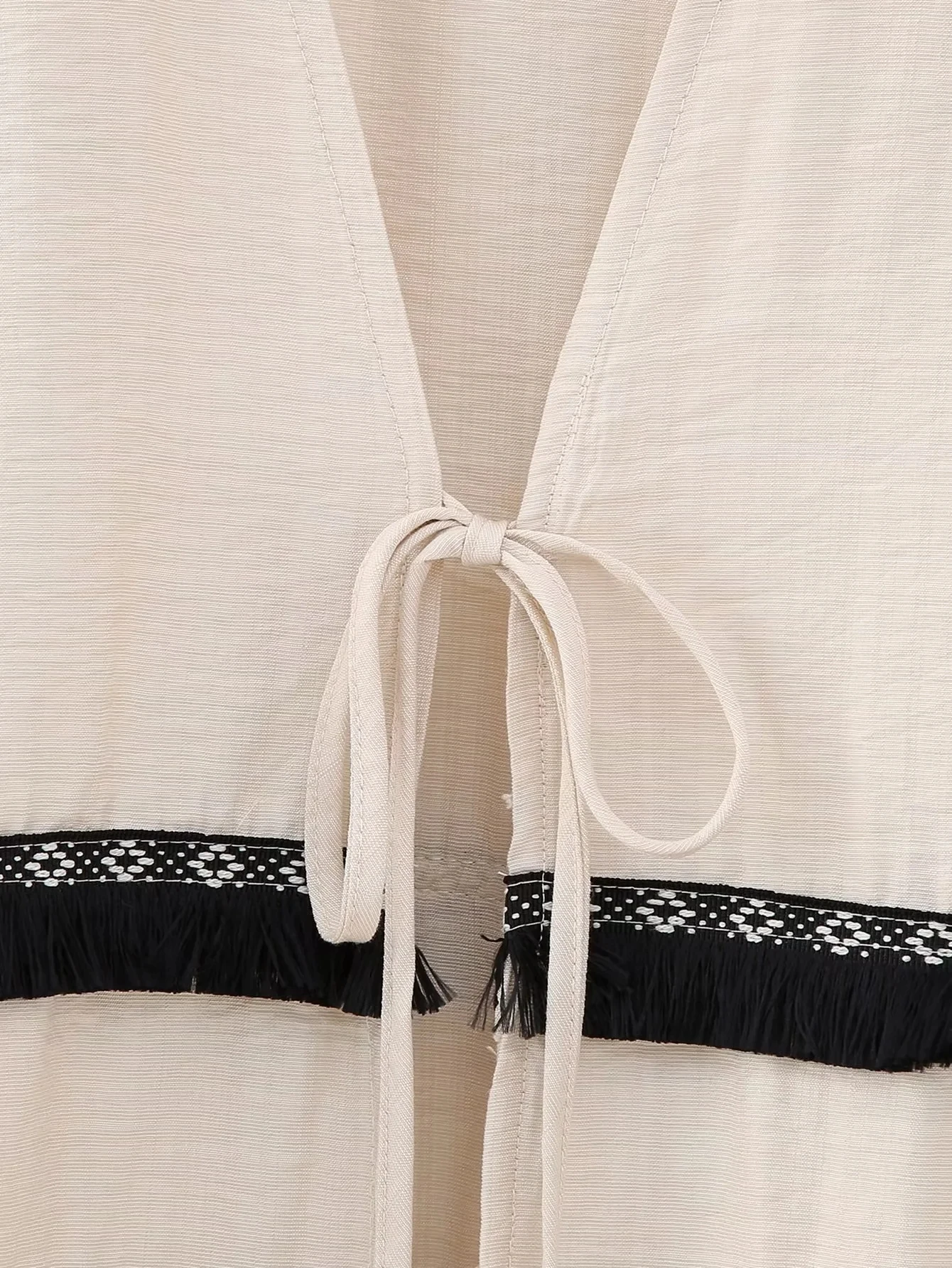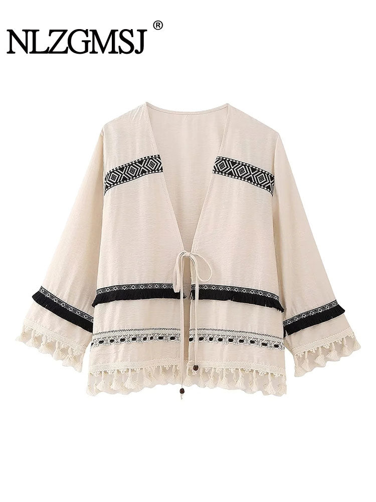 Znbbw TRAF Beige Cardigan Jackets Women 2023 Tassel Coat Loose Elegant Top Stylish Vintage Chic Trendy Folk Lace Up Top