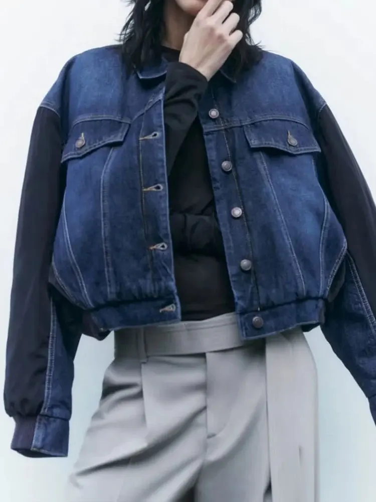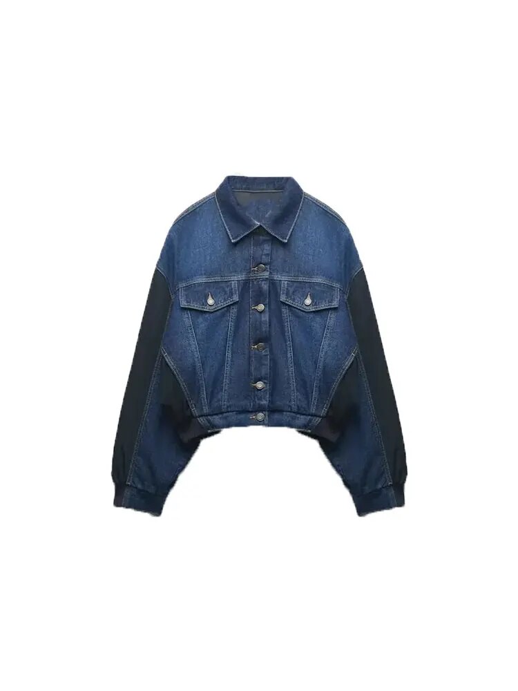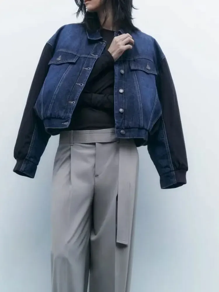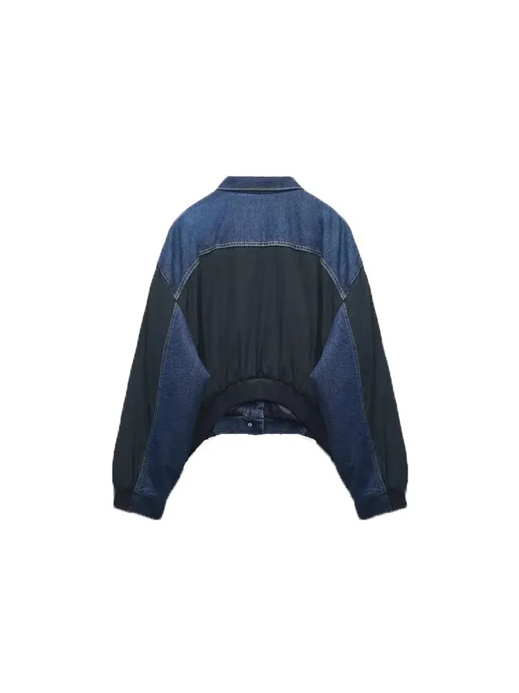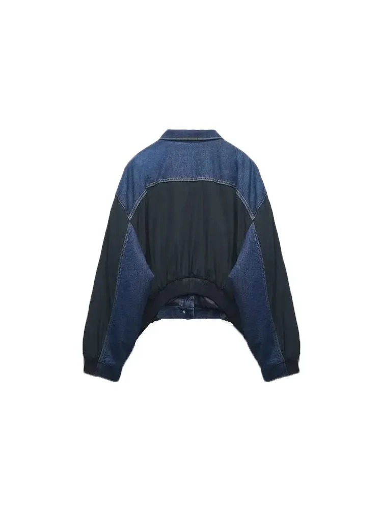 Znbbw TRAF Bomber Denim Jackets for Women Spring Autumn Vintage Chic Long Sleeve Single Breasted Jean Coats Tops Outerwear