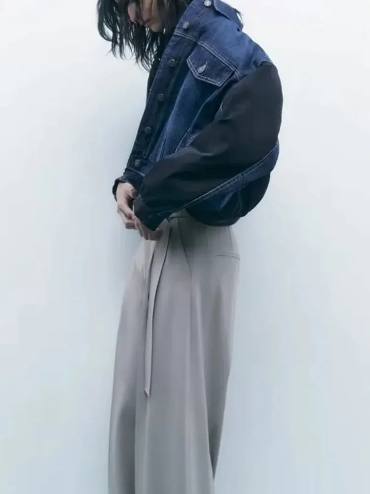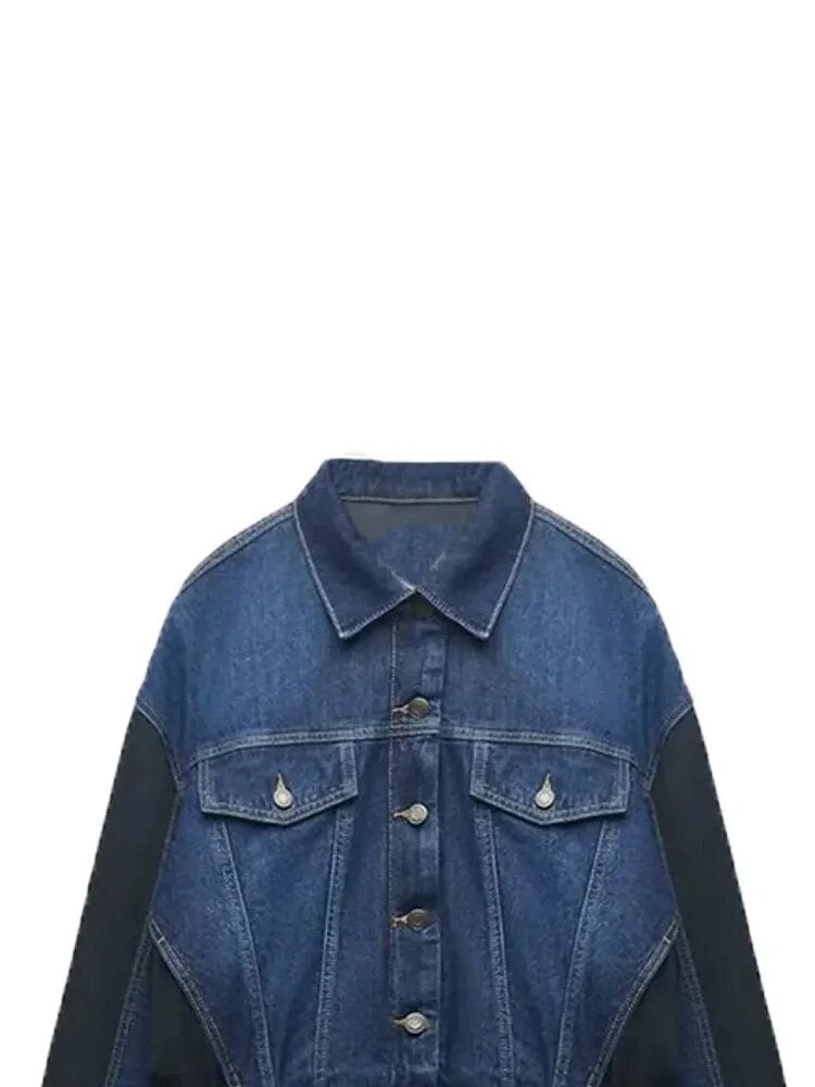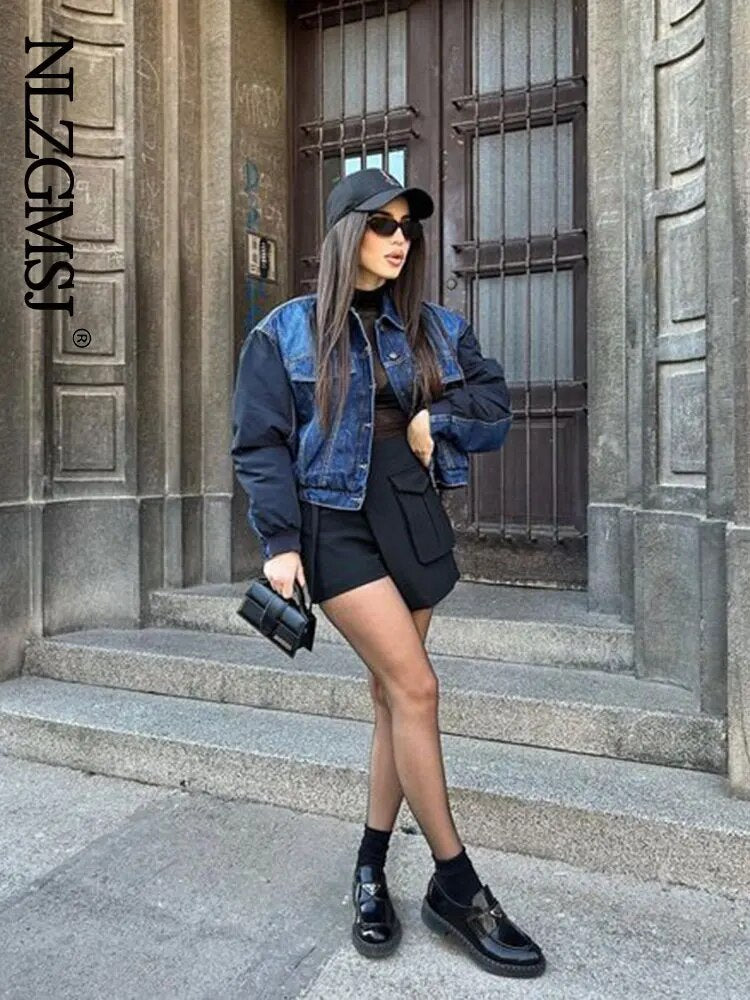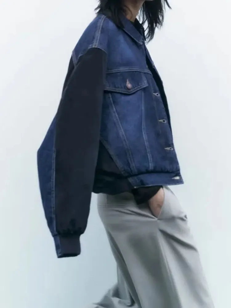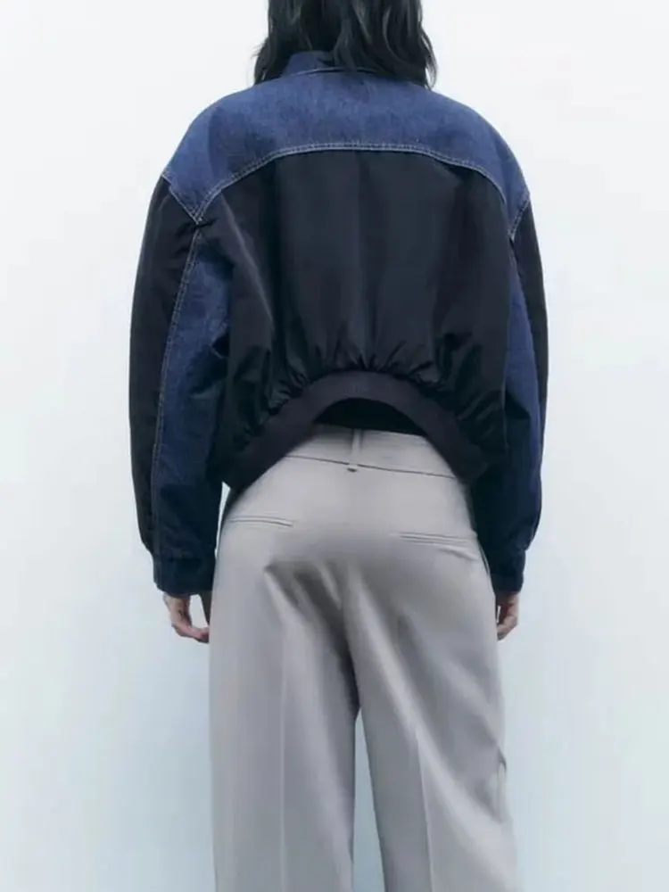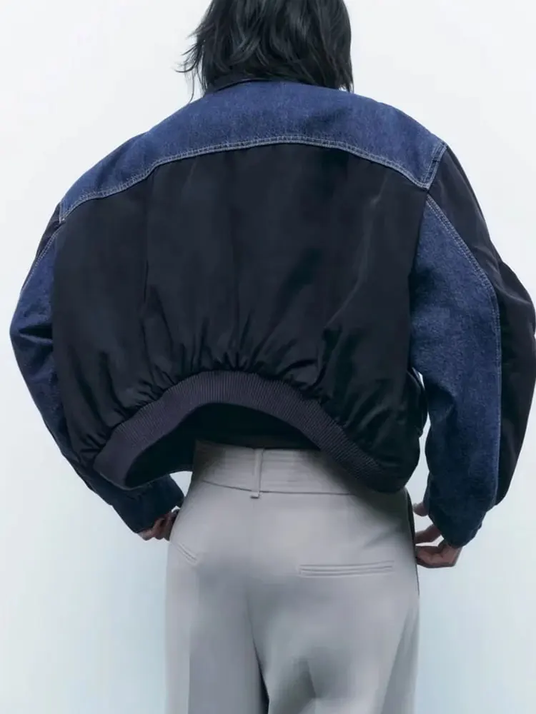 Znbbw TRAF Bomber Denim Jackets for Women Spring Autumn Vintage Chic Long Sleeve Single Breasted Jean Coats Tops Outerwear