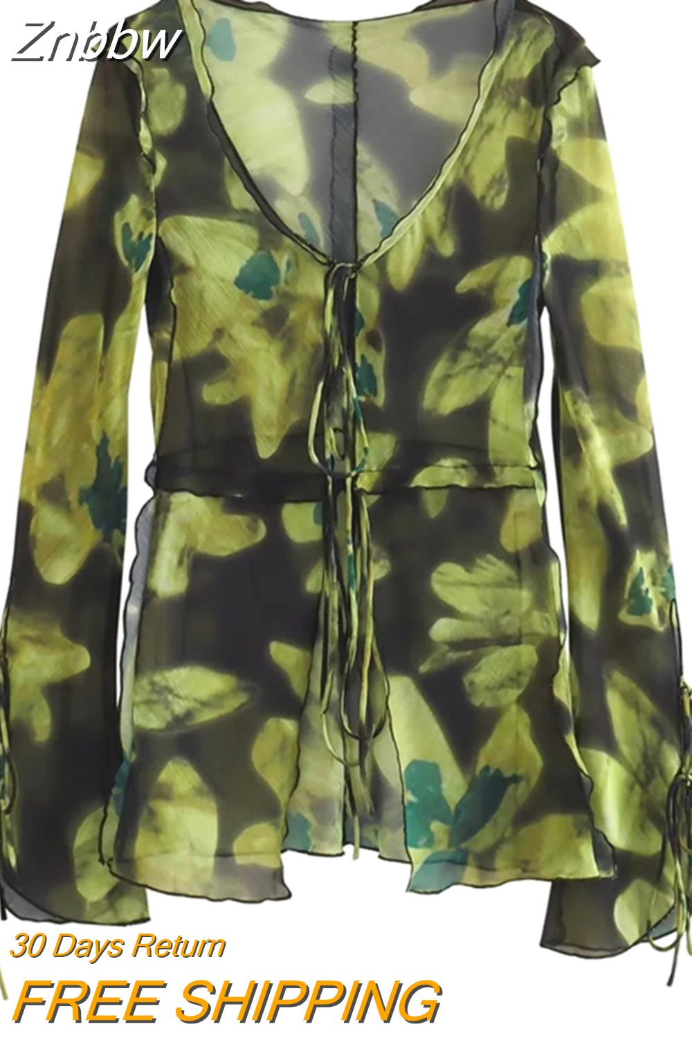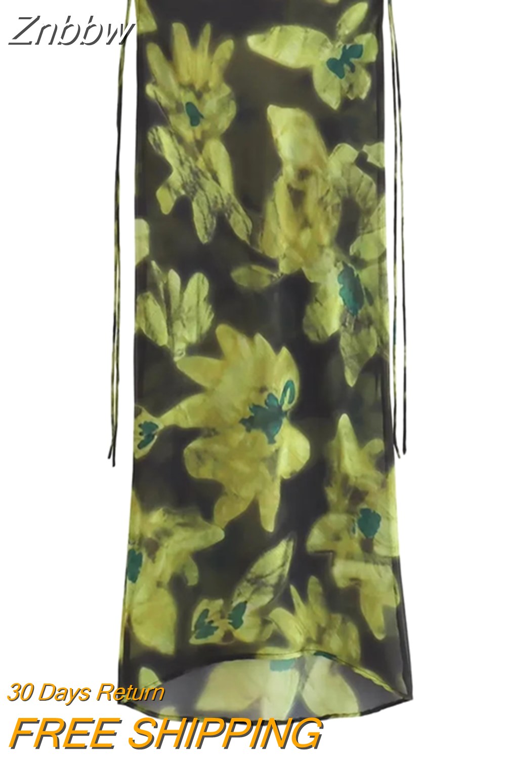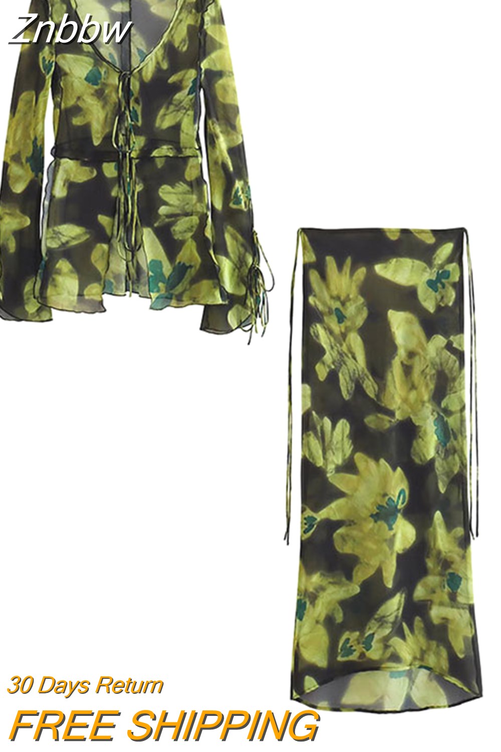 Znbbw TRAF Lightweight Women Printed Suits 2023 Summer Long Sleeve V Neck Slim Tied Shirt Female Midi Skirt 2 Piece Sets Y2K