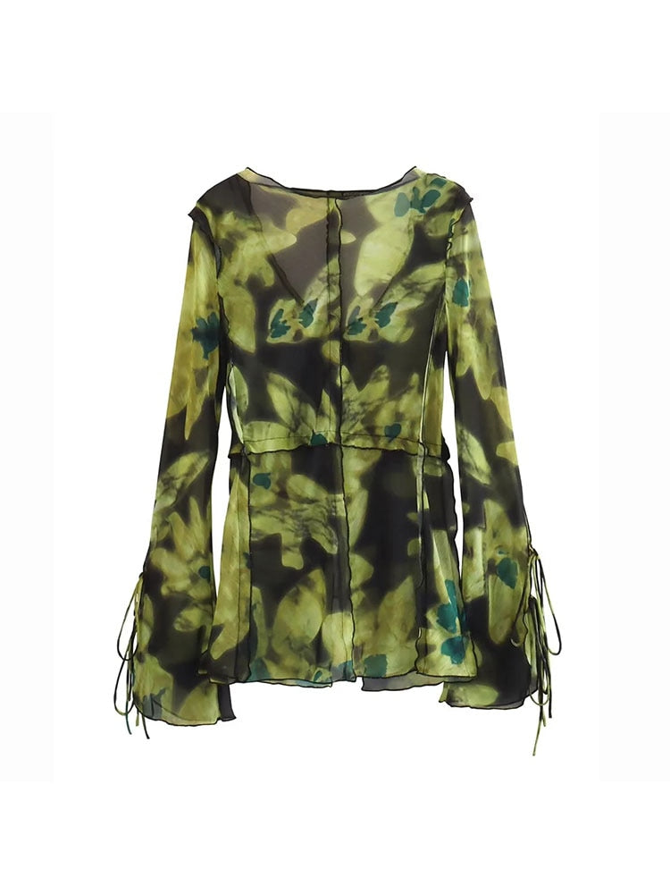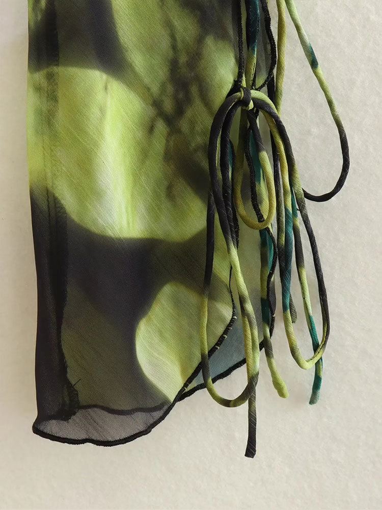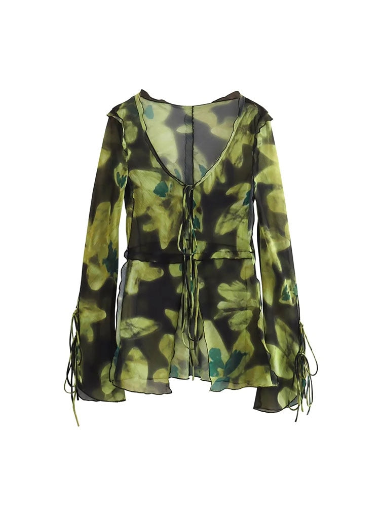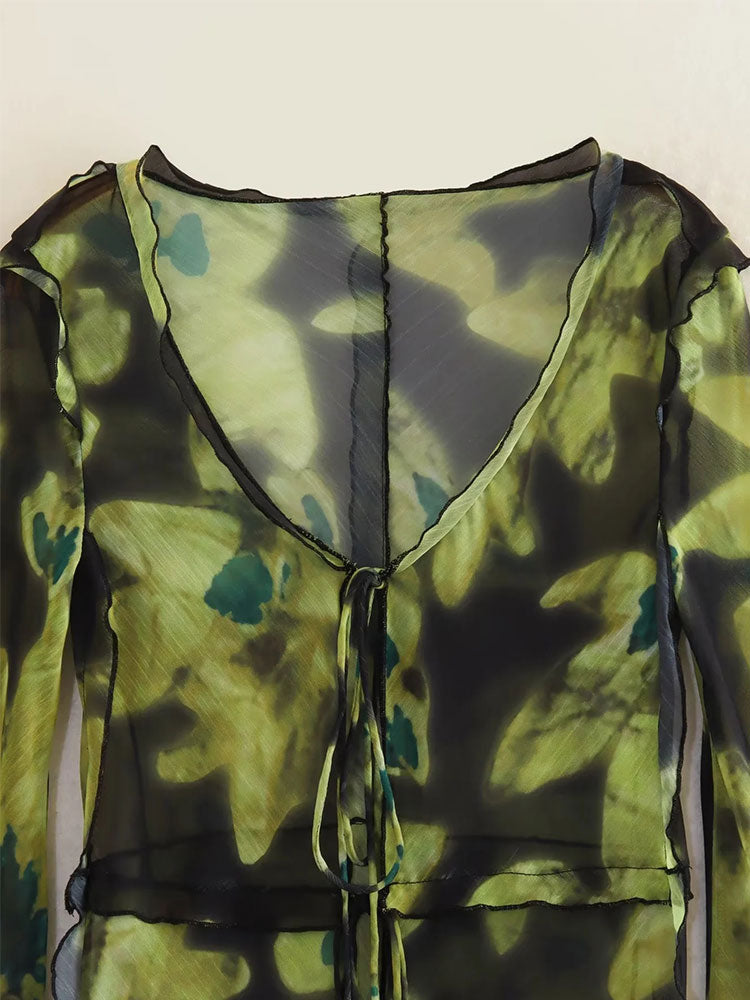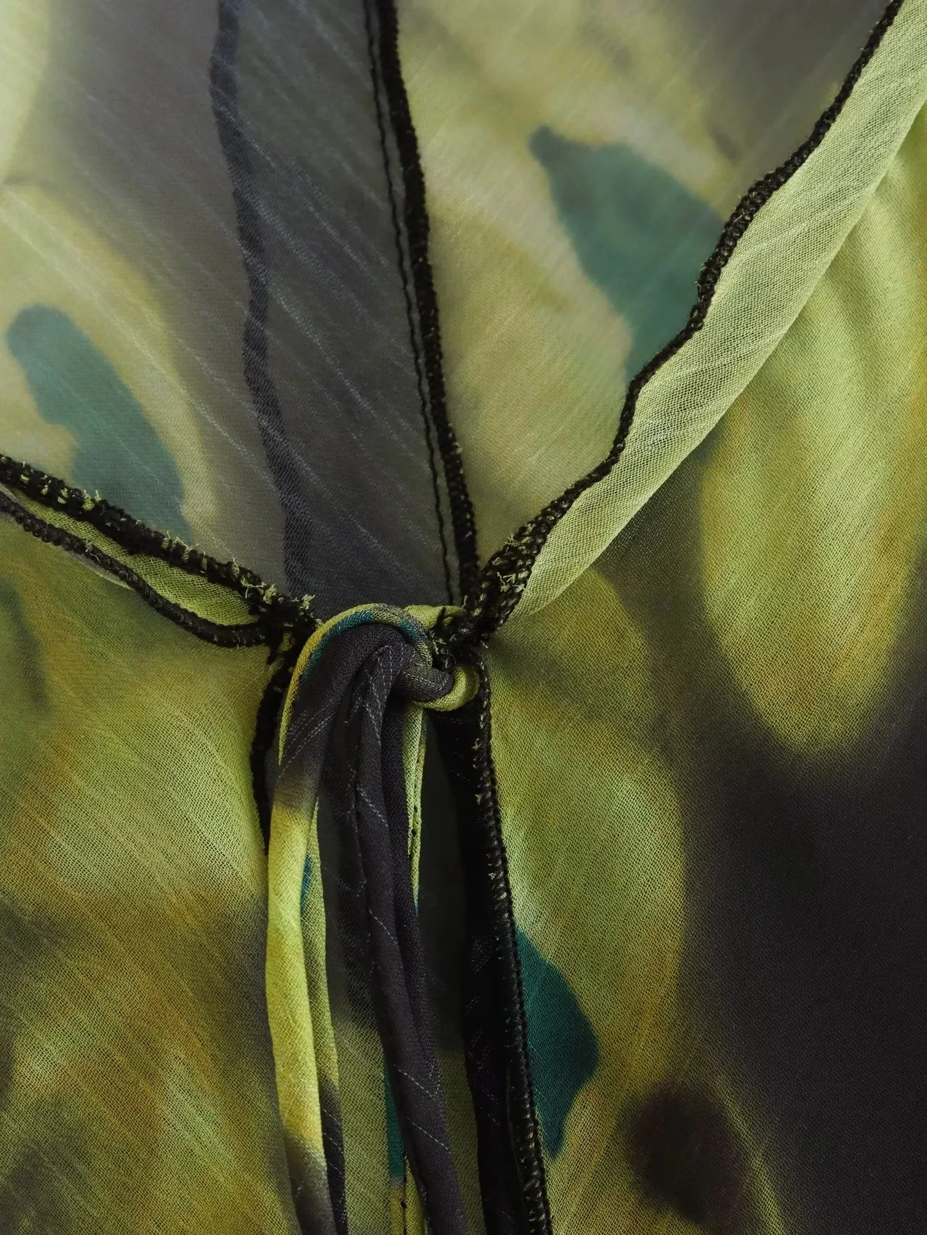 Znbbw TRAF Lightweight Women Printed Suits 2023 Summer Long Sleeve V Neck Slim Tied Shirt Female Midi Skirt 2 Piece Sets Y2K