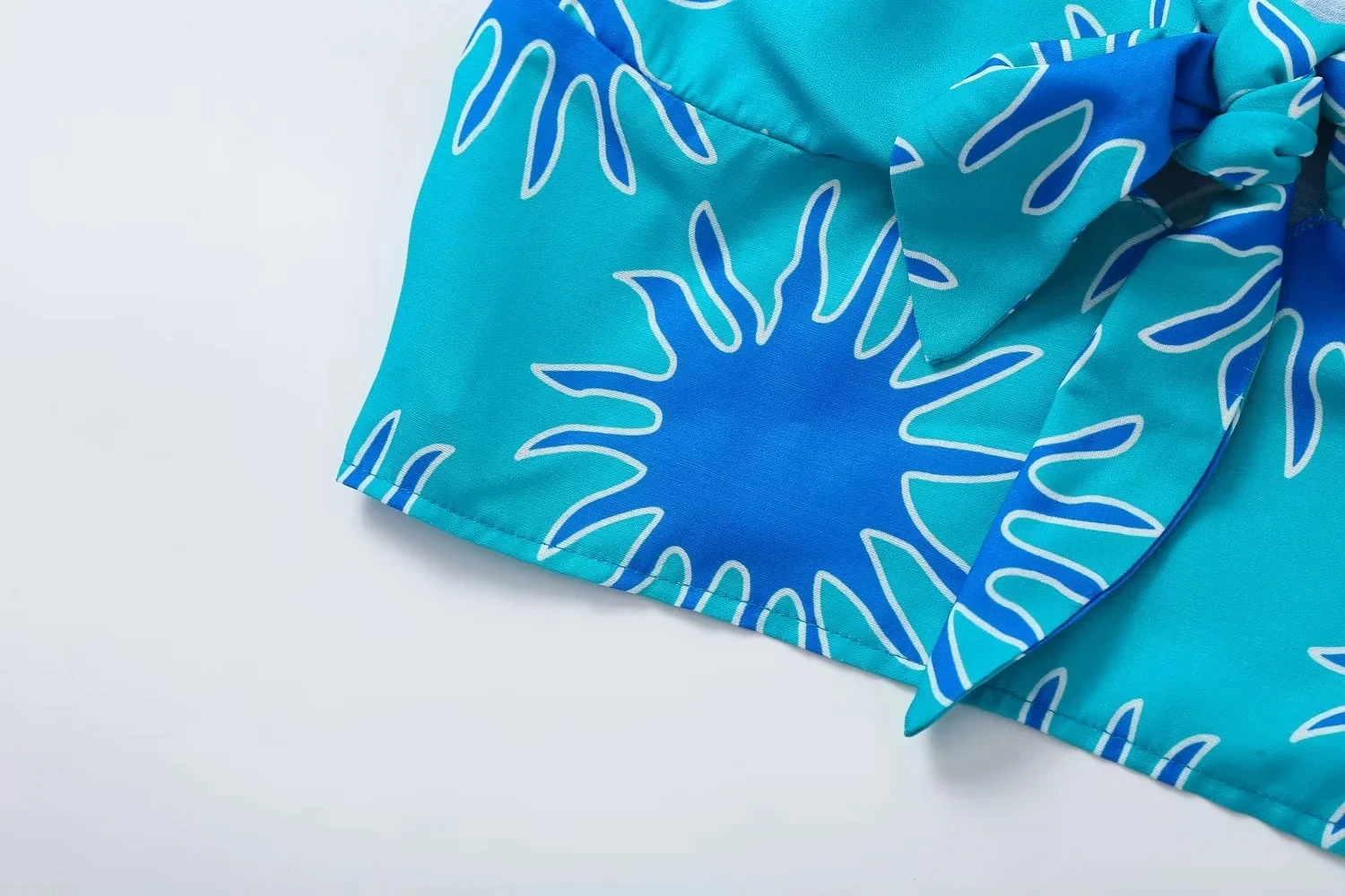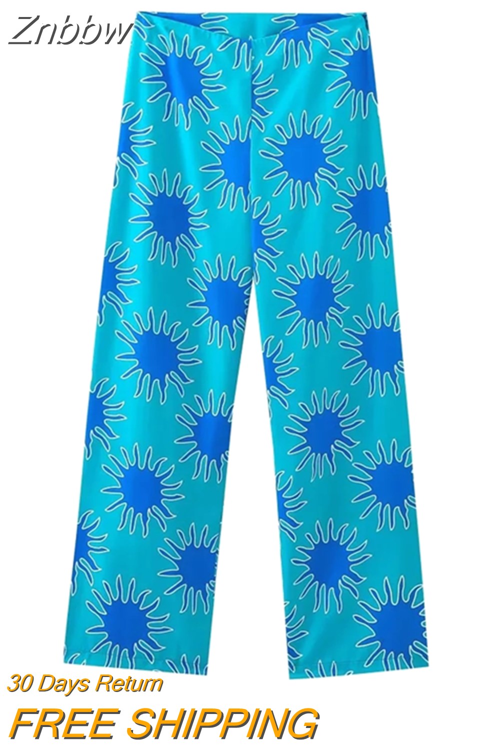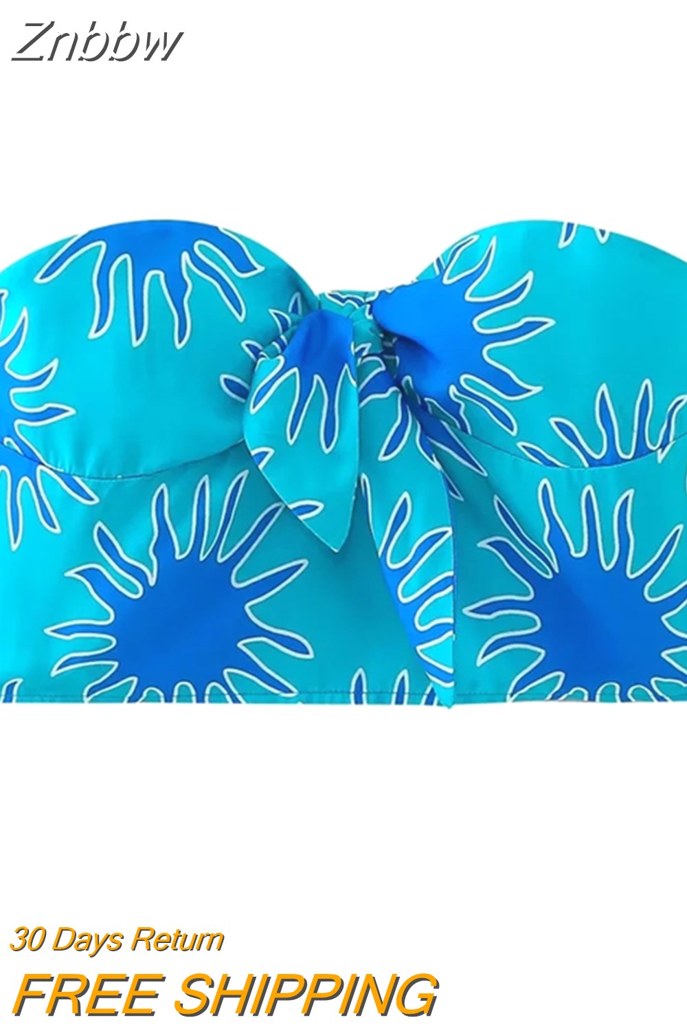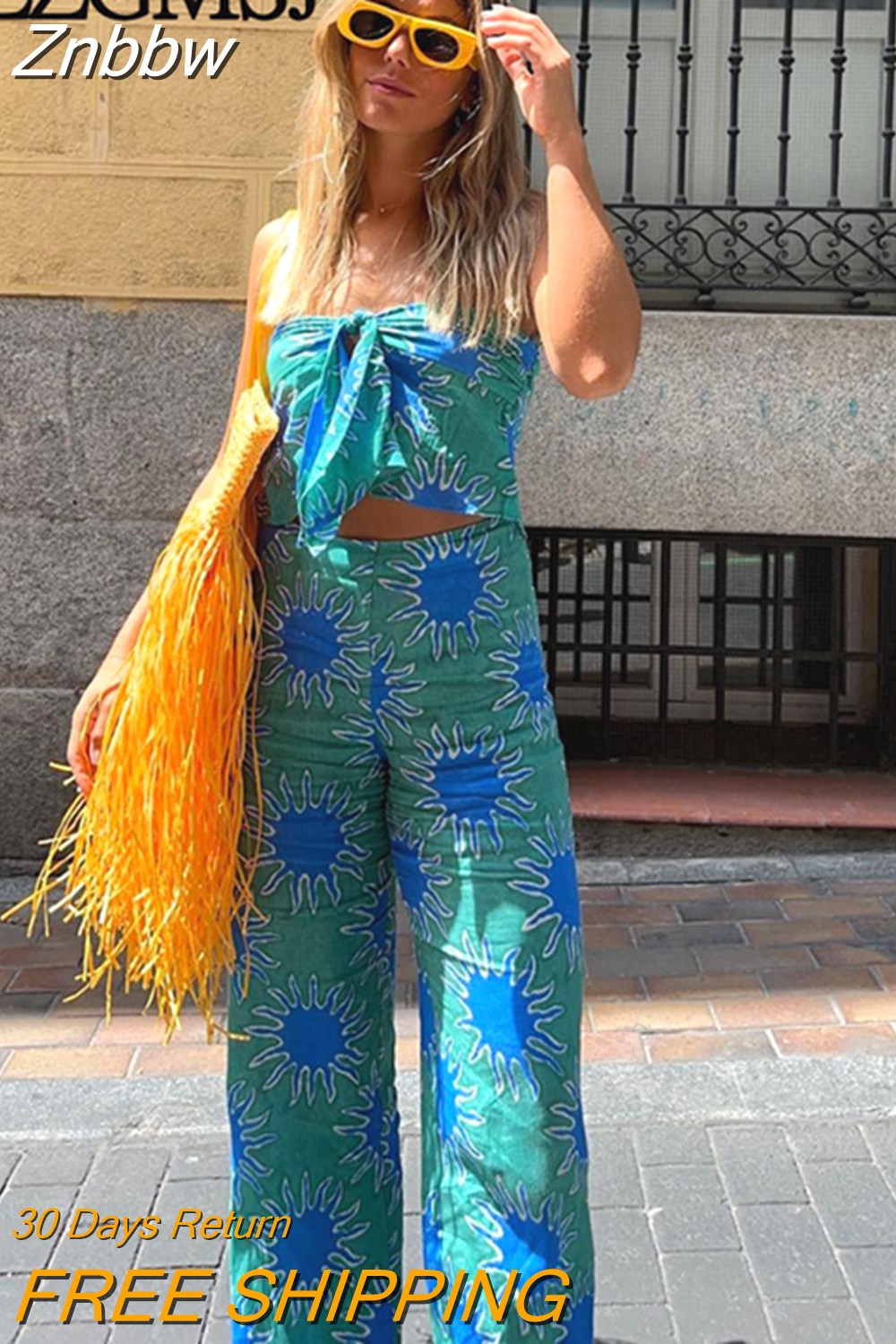 Znbbw TRAF Woman 2023 2 Pieces Sets Printed Knot Decoration Short Vest Tops + Wide Leg Long Pants Summer Causal Slim Sets