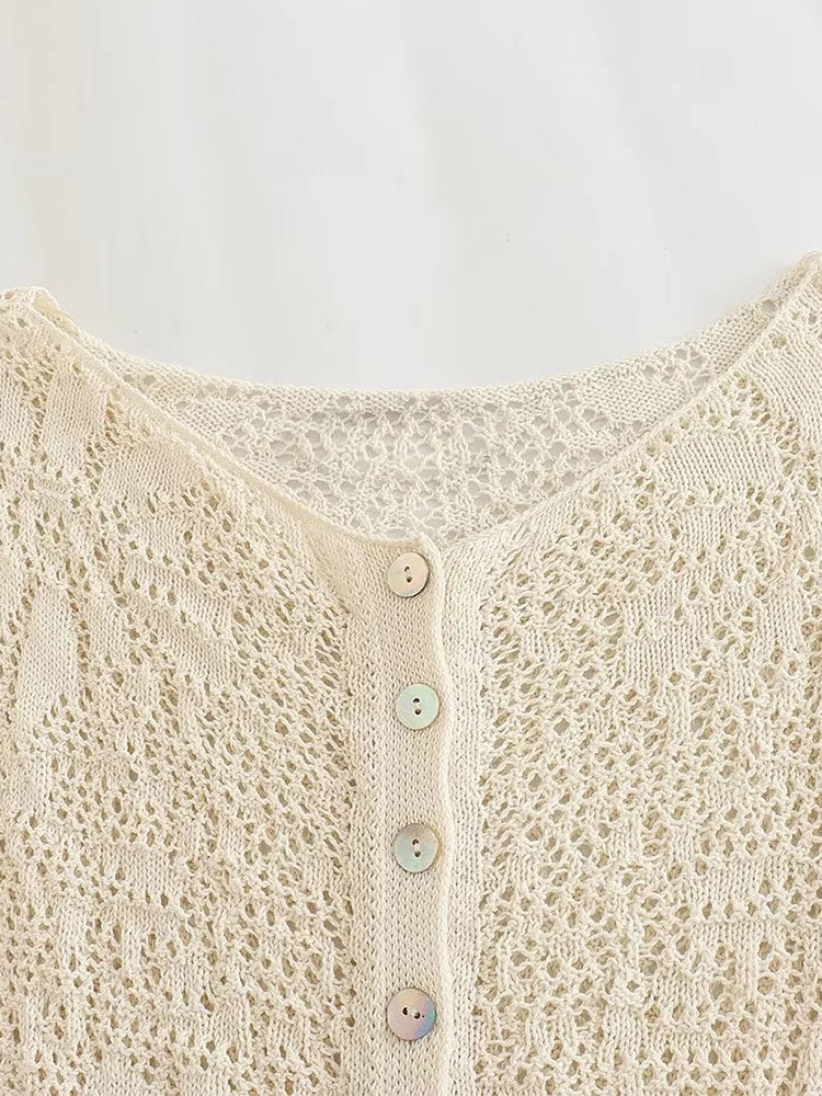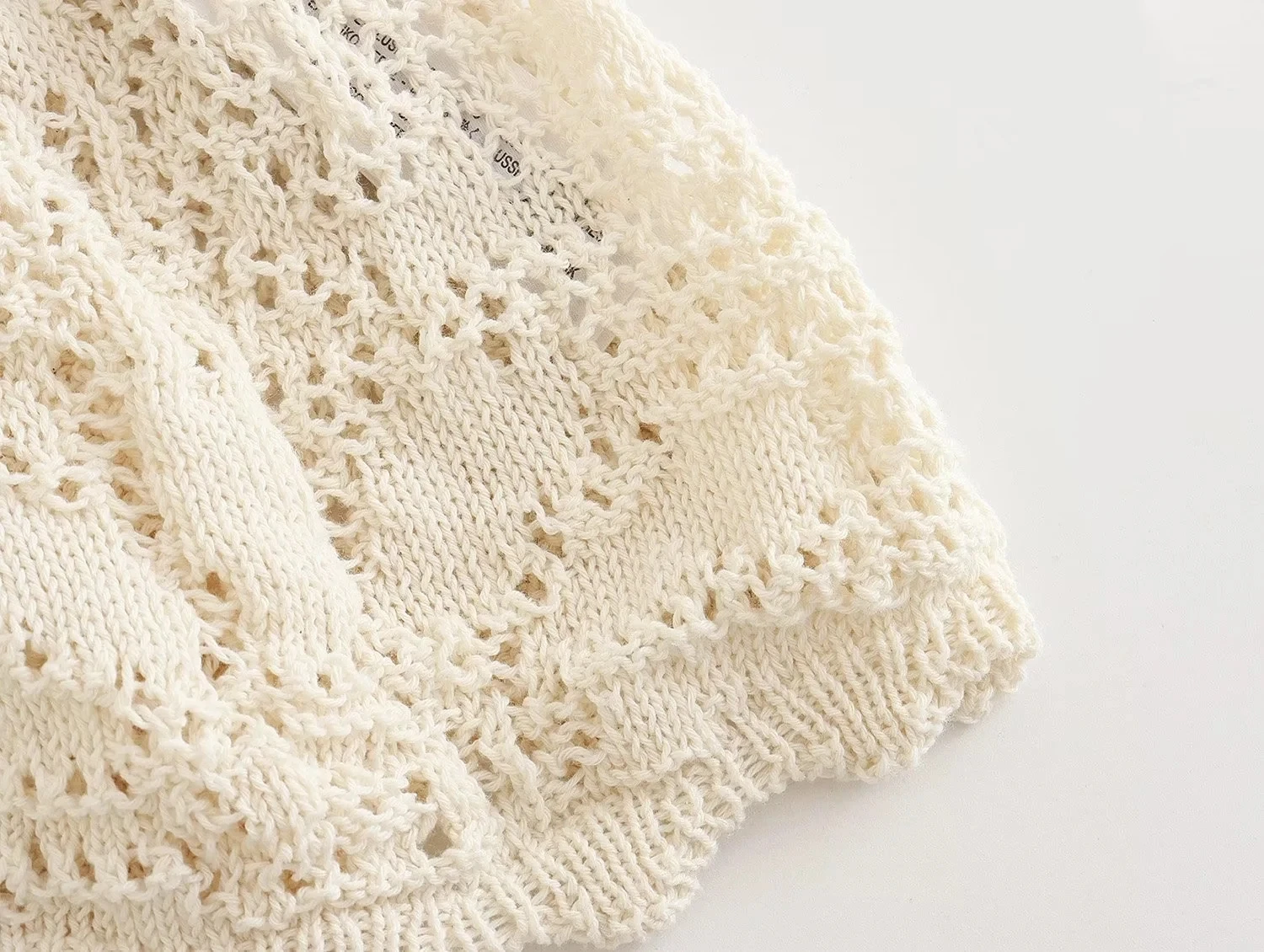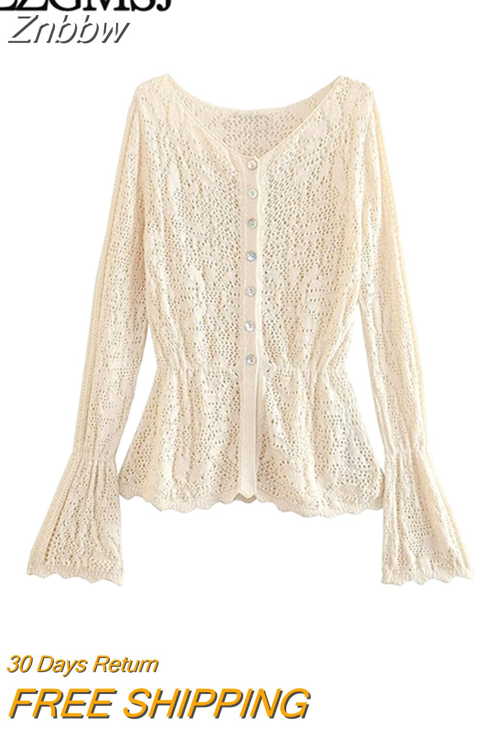 Znbbw TRAF Women 2023 Jacquard Mesh Knitted Button Loose Cardigan Open Navel Sweater Retro Flare Sleeve Coat Unique Top