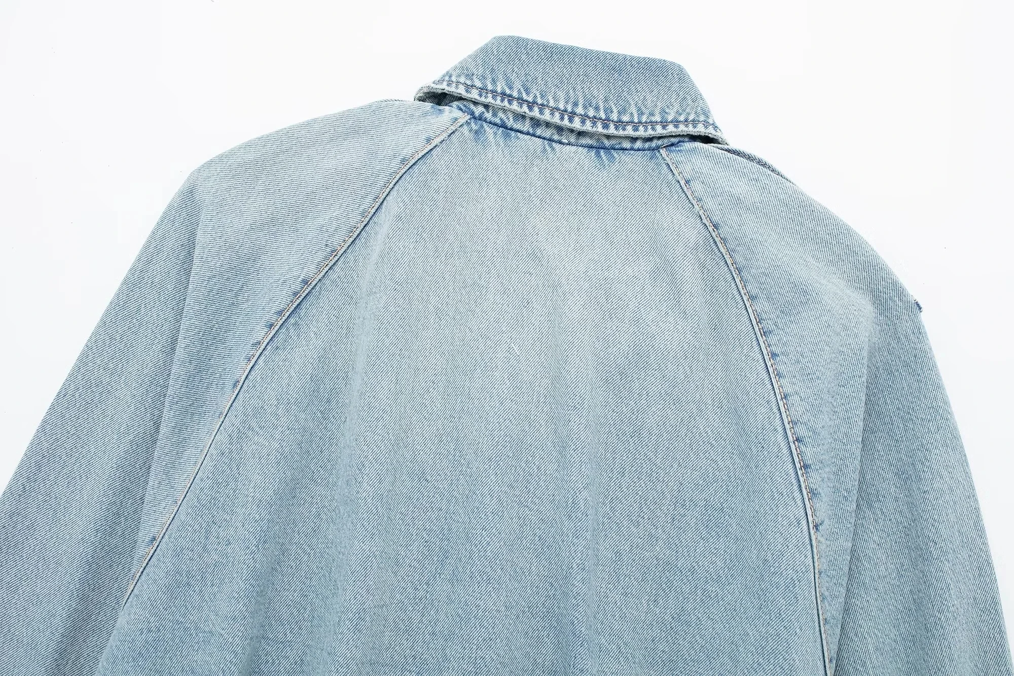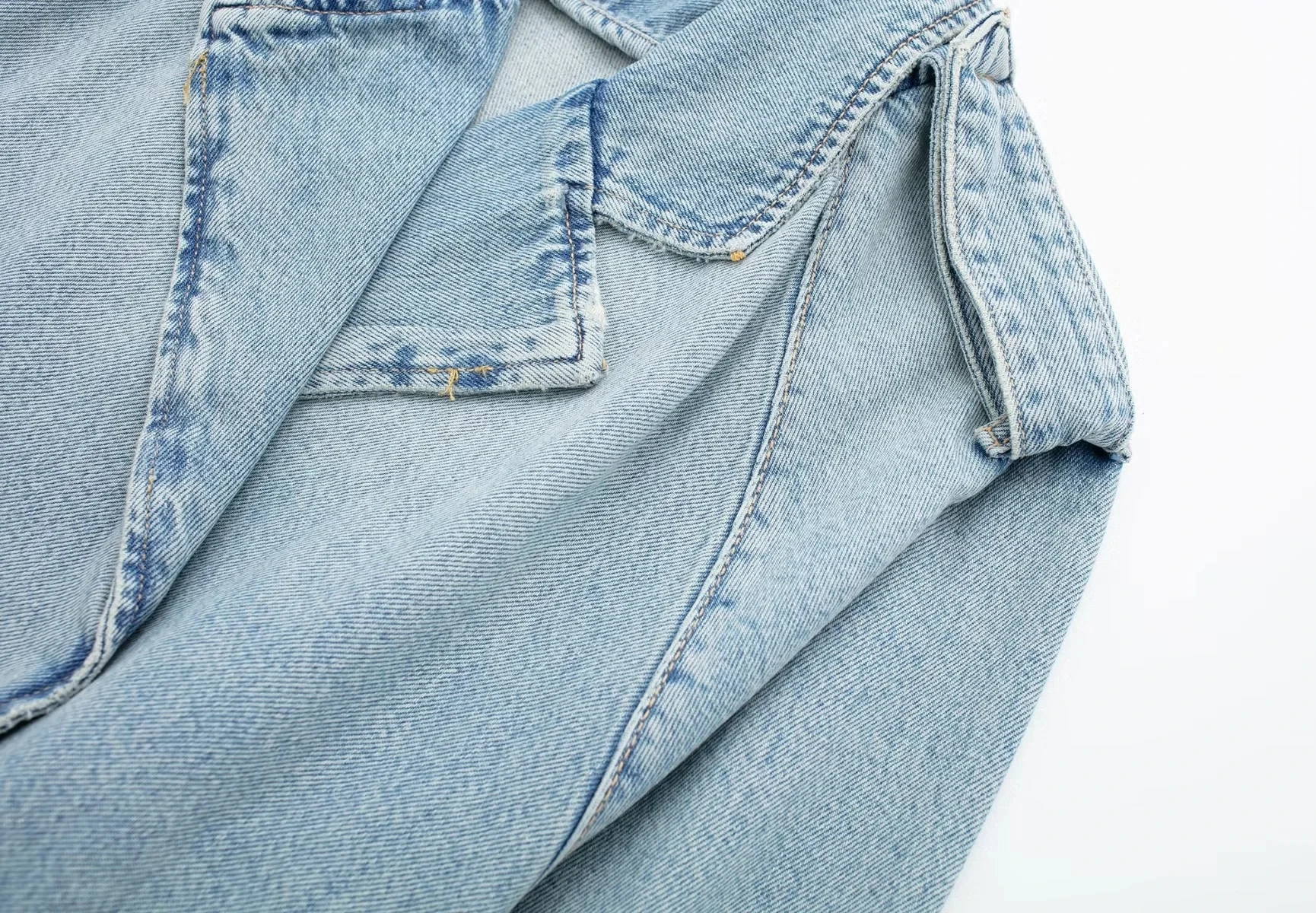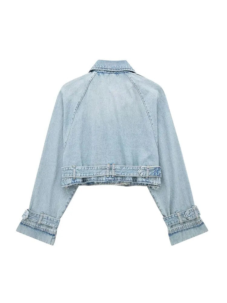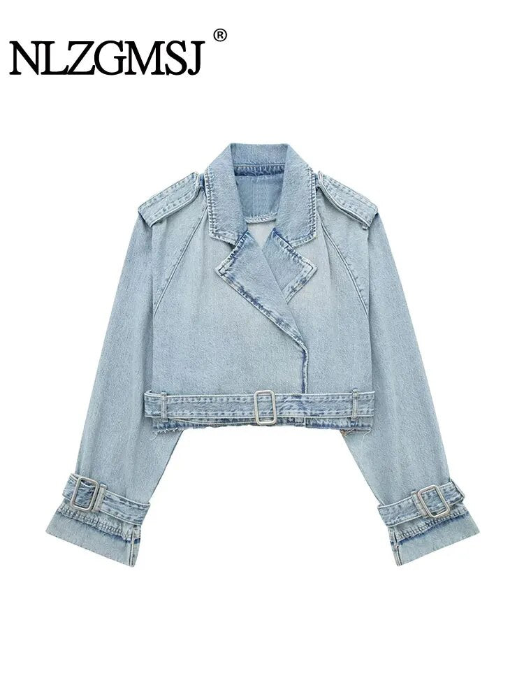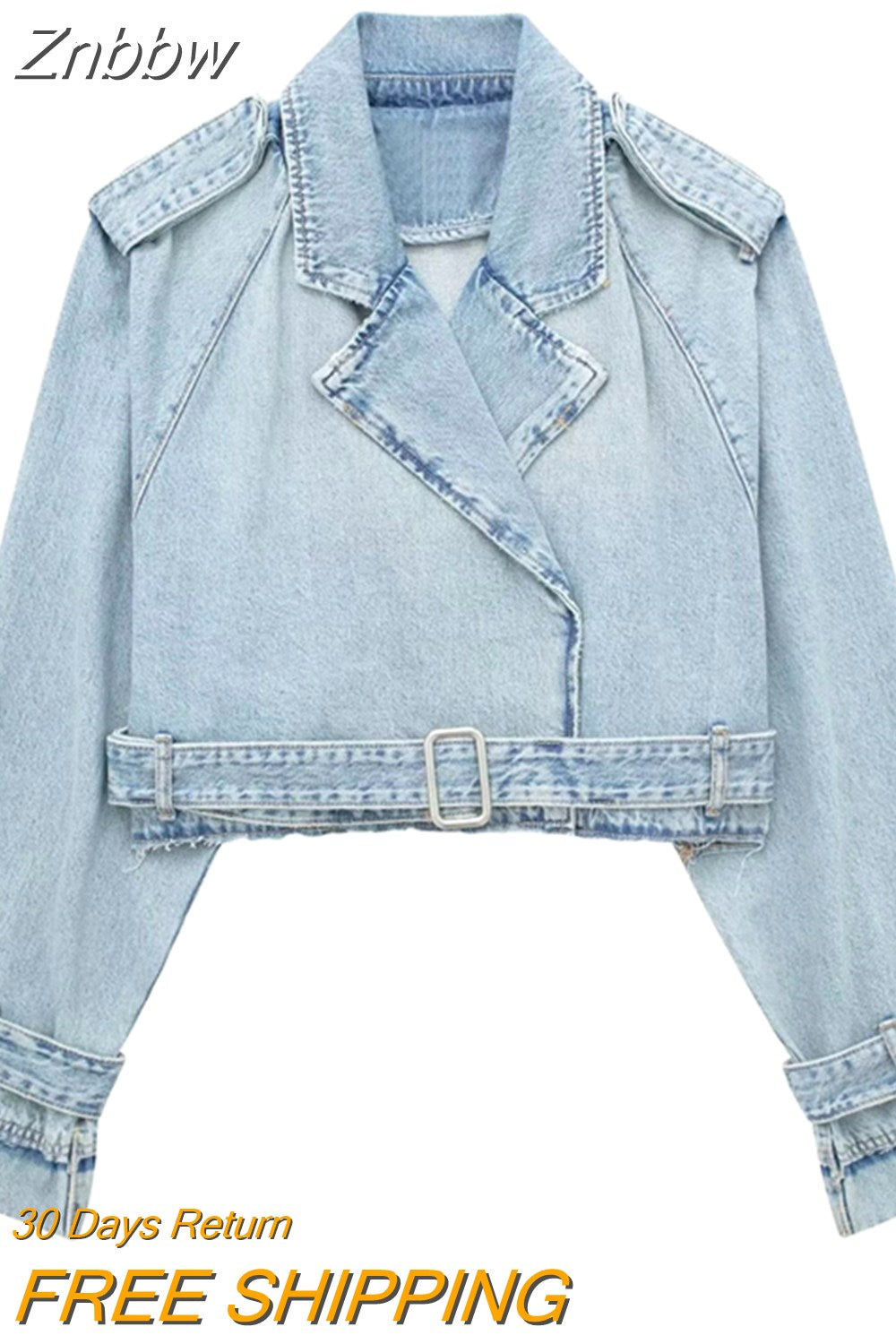 Znbbw TRAF Women 2023 Spring Fashion With Belt Cowboy Short Coat Vintage Long Sleeve Pockets Female Outerwear Chic Tops