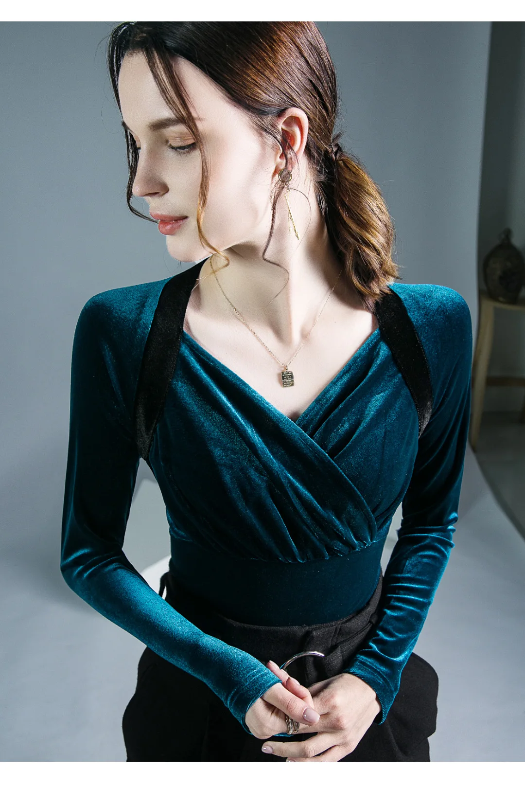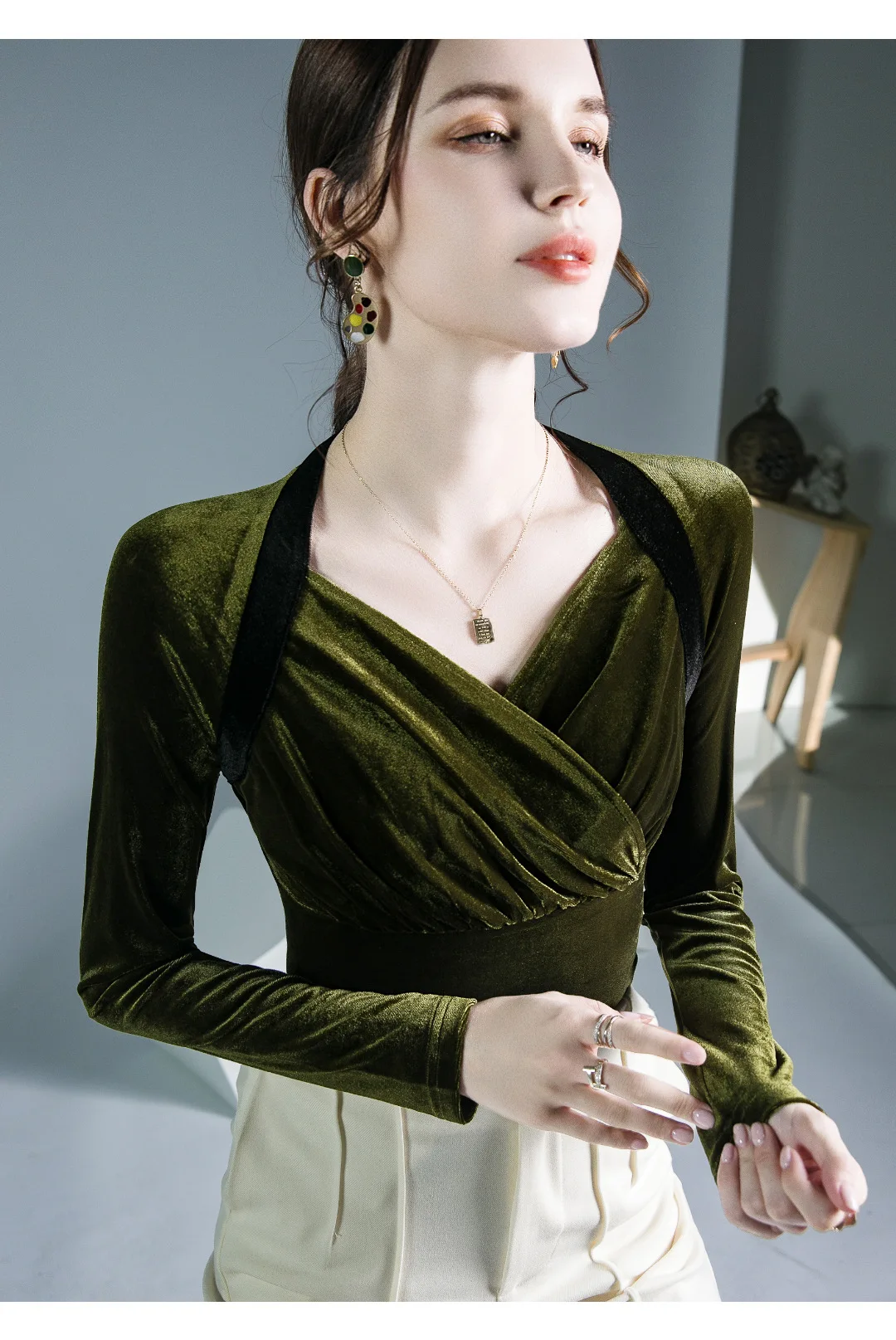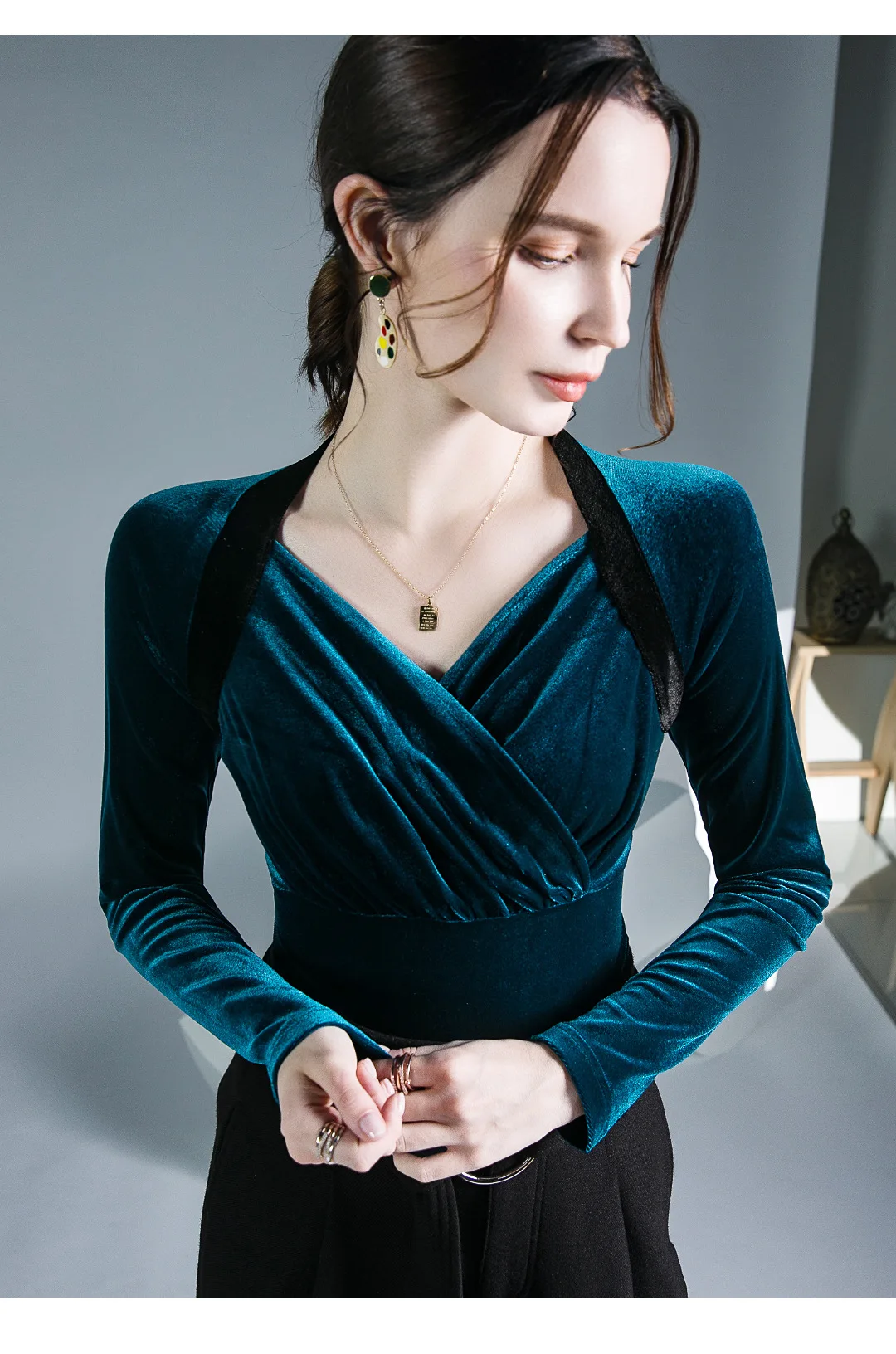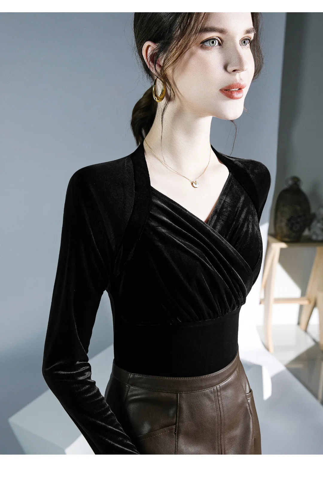 Znbbw TShirt Women Full Sleeve Vintage Crossed V Neck Tee Shirts Lady Stretchy Soft Fashion Base Tops T-shirts For Girls