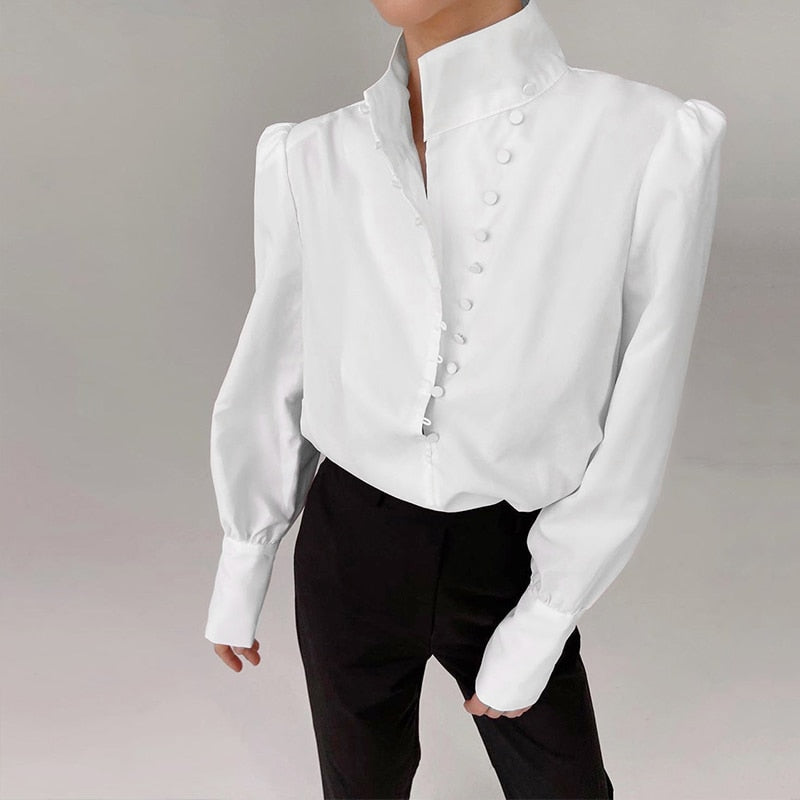 Znbbw Turtleneck Blouse Long Sleeve White Shirt Office Ladies Top Casual Solid Single-Breasted Puff Sleeve Womens Blouses