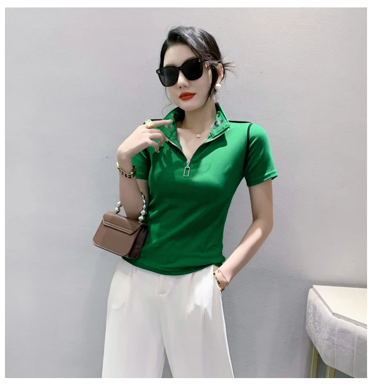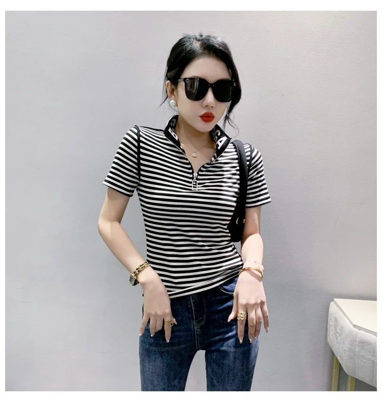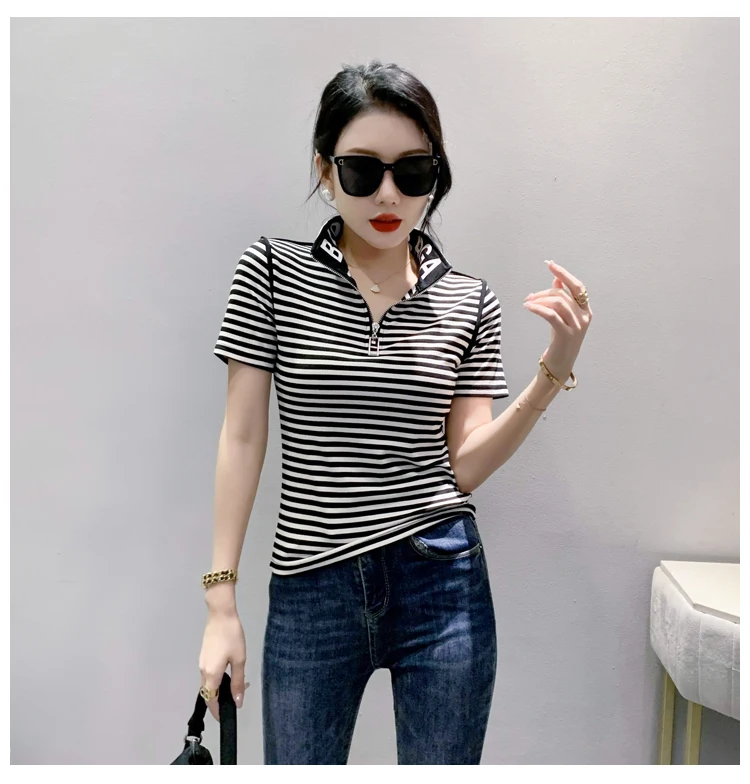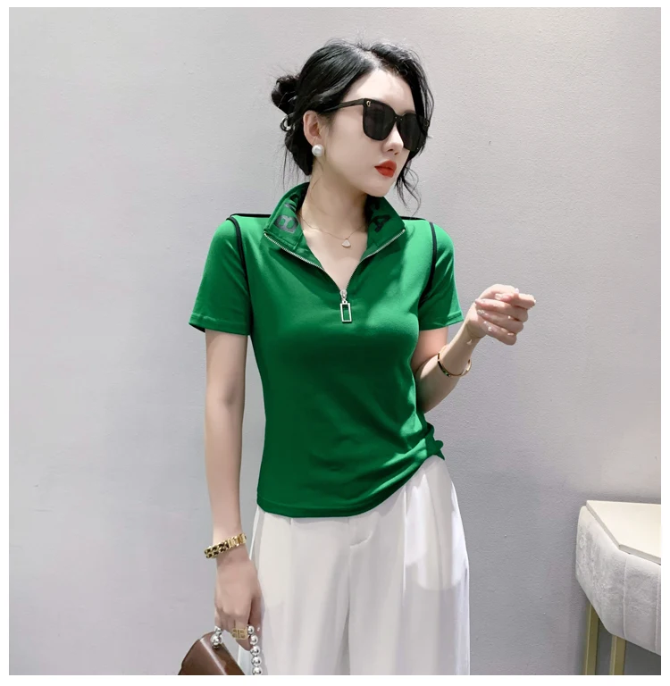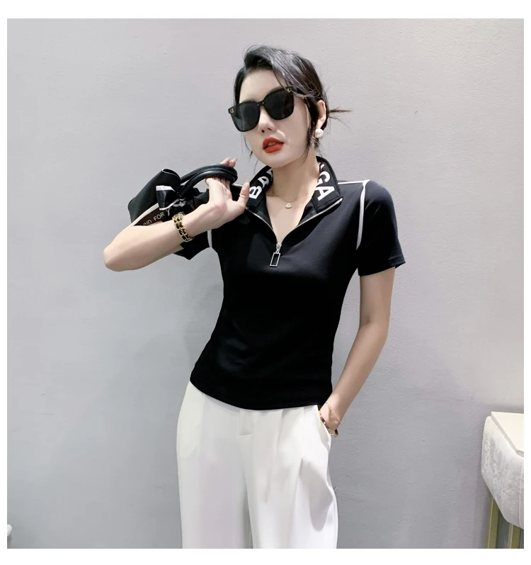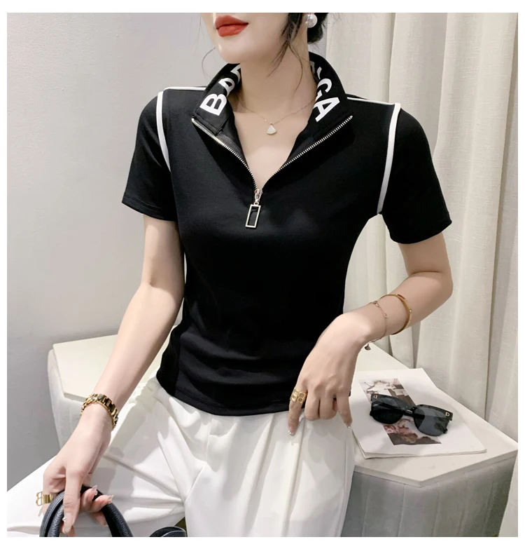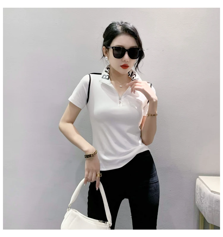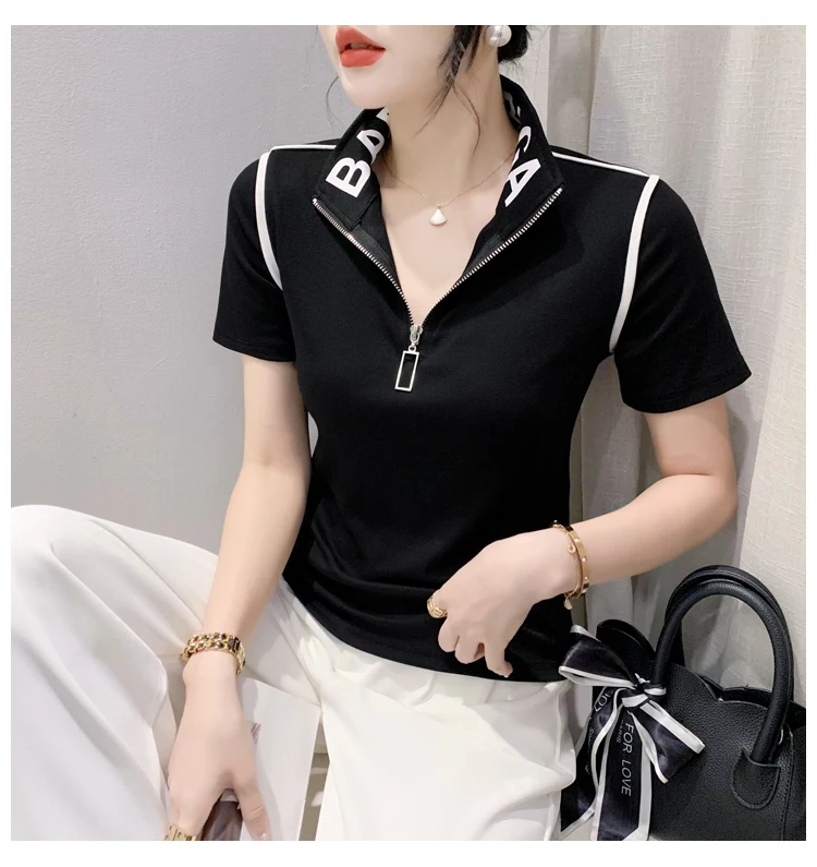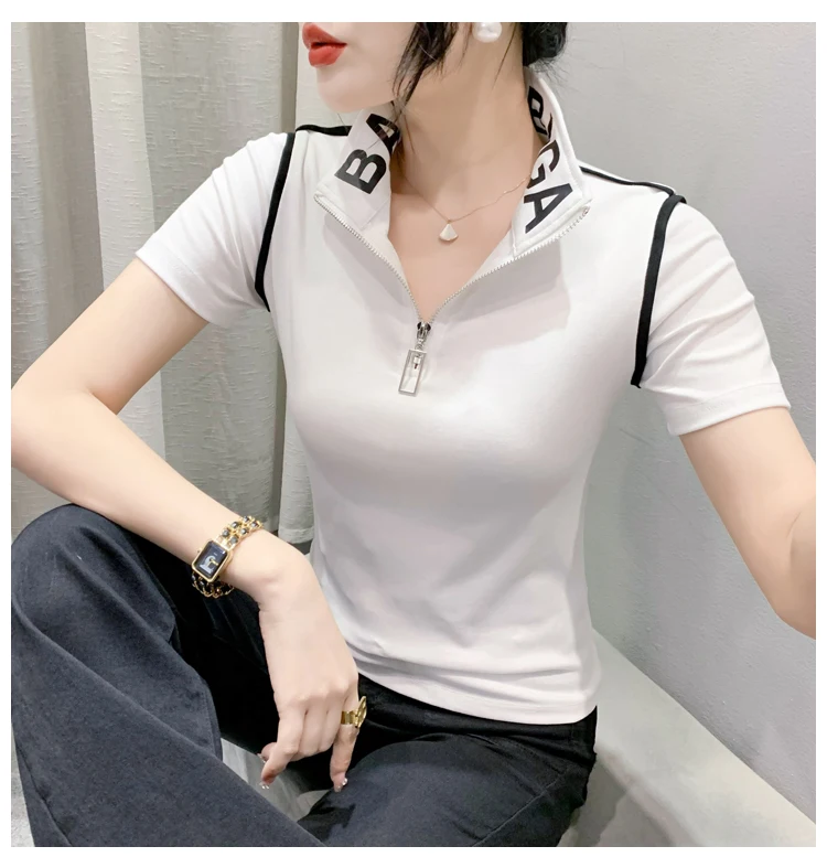 Znbbw Turtleneck Cotton T-Shirt For Women Short Sleeve Contrast Color Slim T shirts Solid Female Stretchy Tee Top