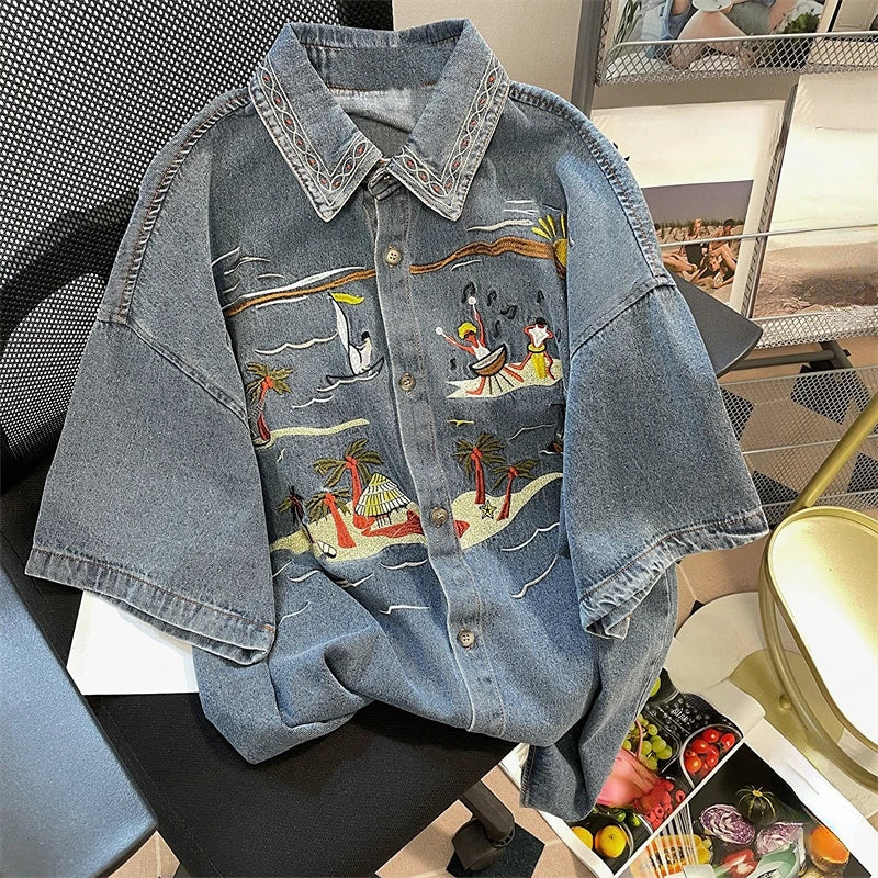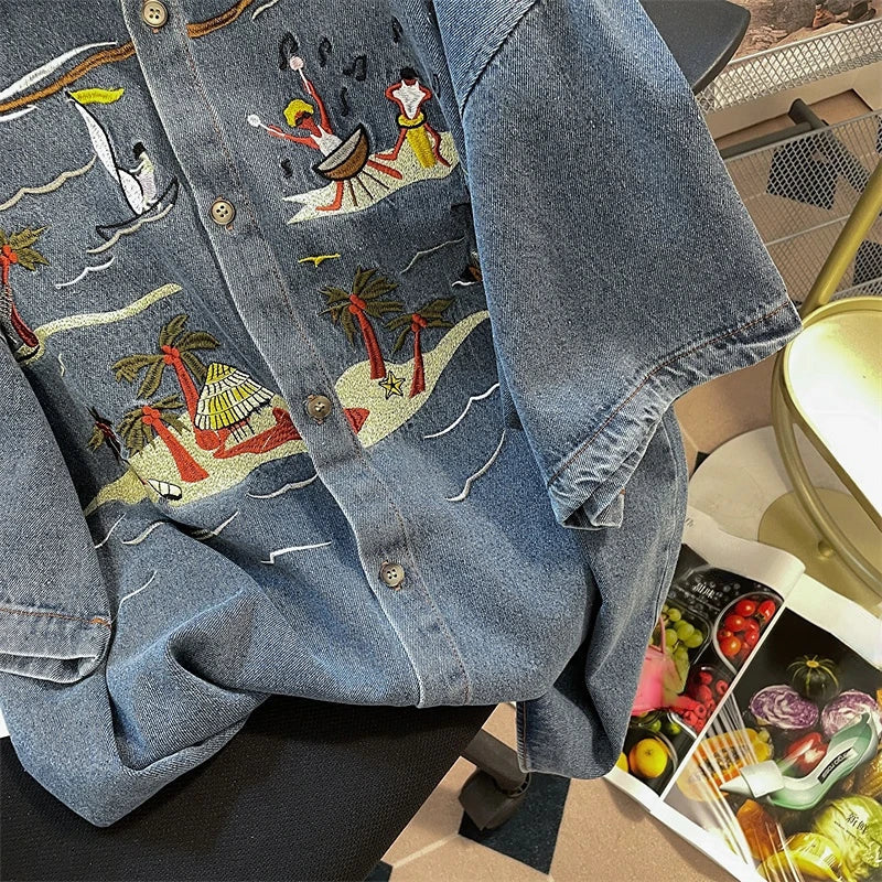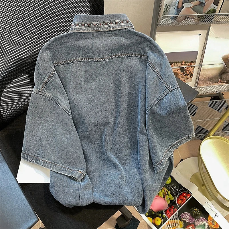Znbbw Vintage Blouses Embroidery Turn Down Collar Short Sleeve Jean Shirts Summer Fashion All Match Tops Casual Women Clothes
